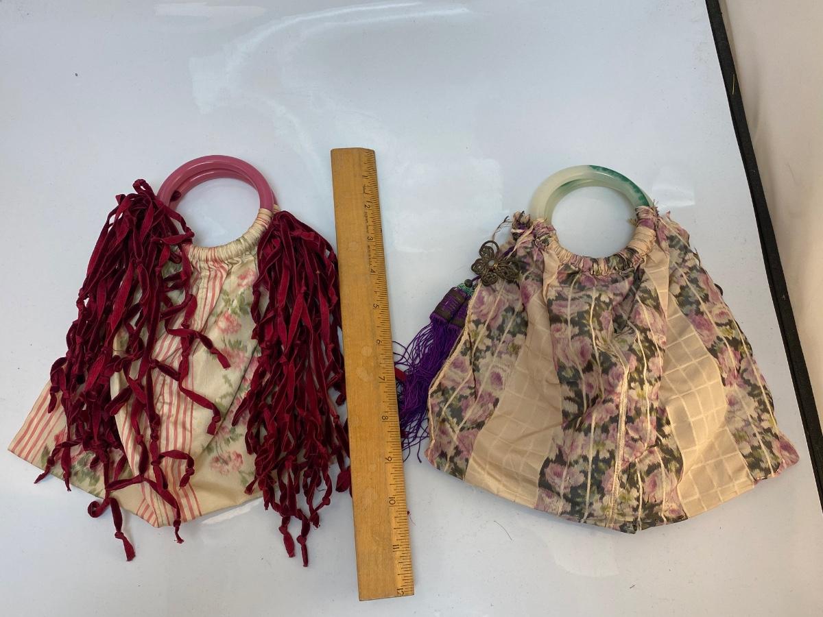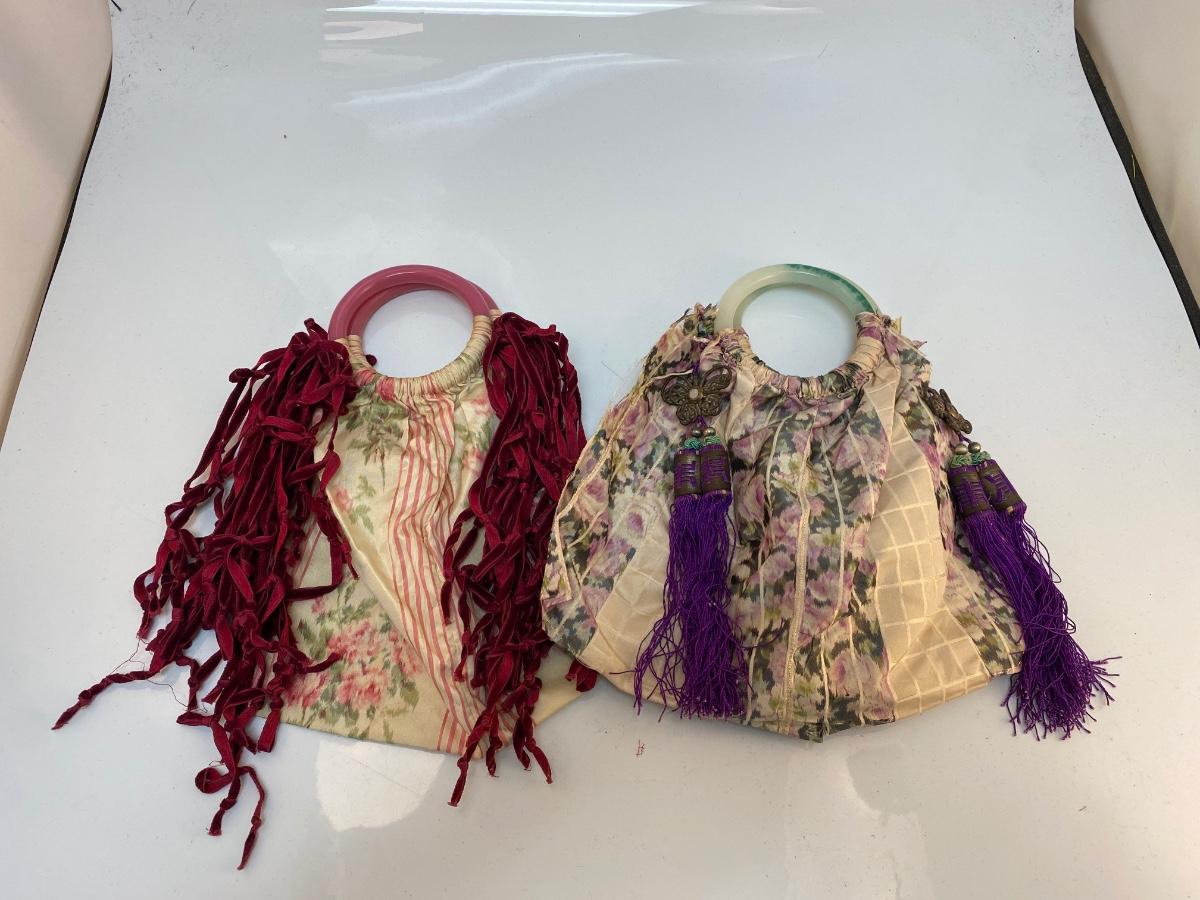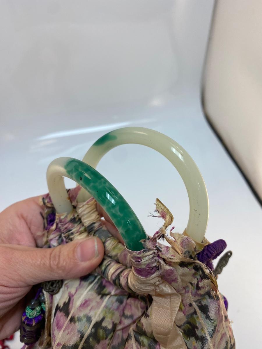 Pair of Handmade Silk Scarf Handbags with Stone Jadeite Bangle Handles. In vintage condition. The purple floral bag needs the side seam restitched partially. Both sets of handles seem to be polished stone. About 10" size.