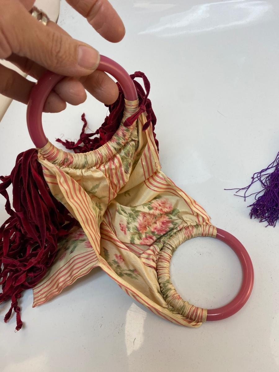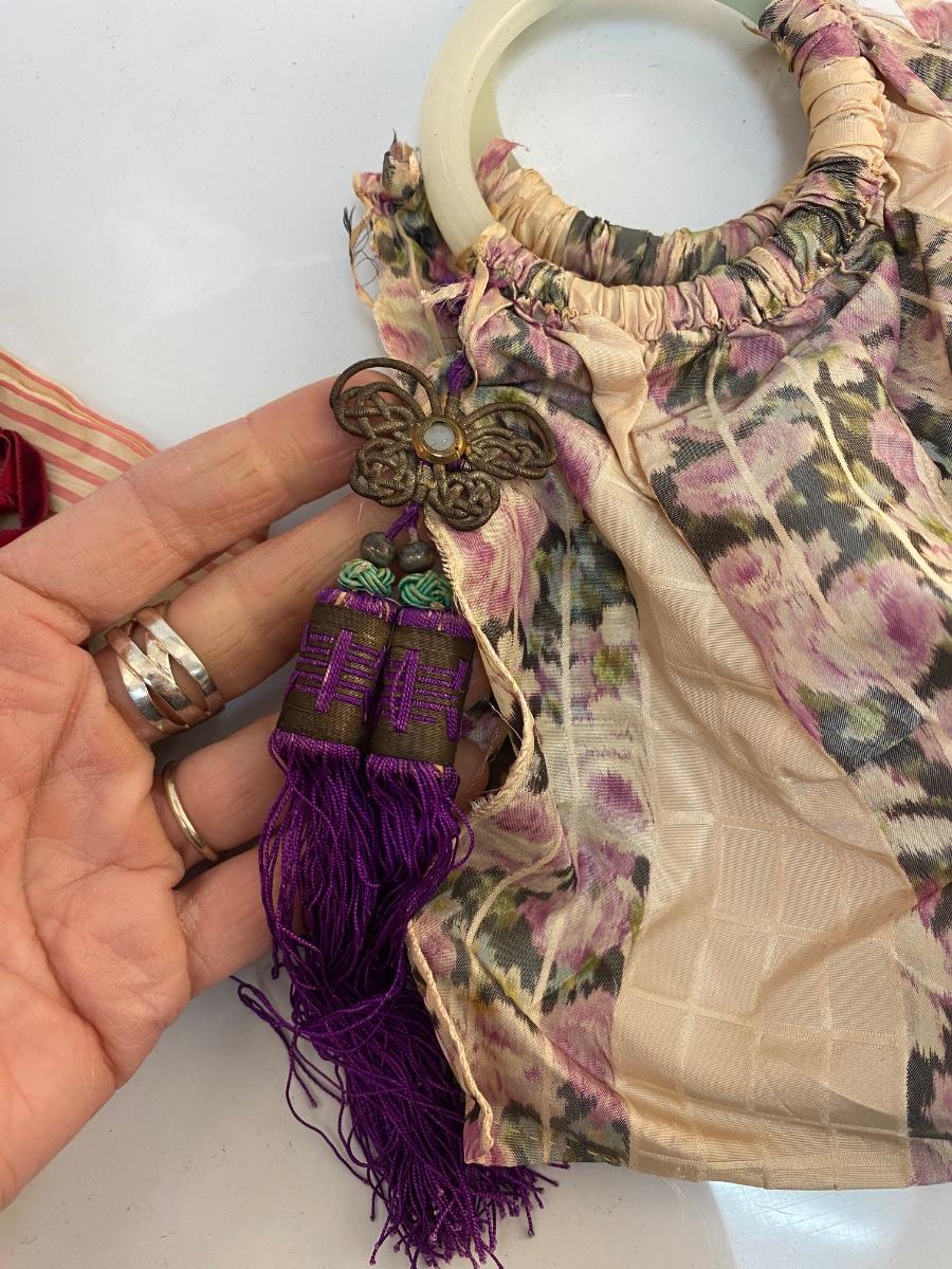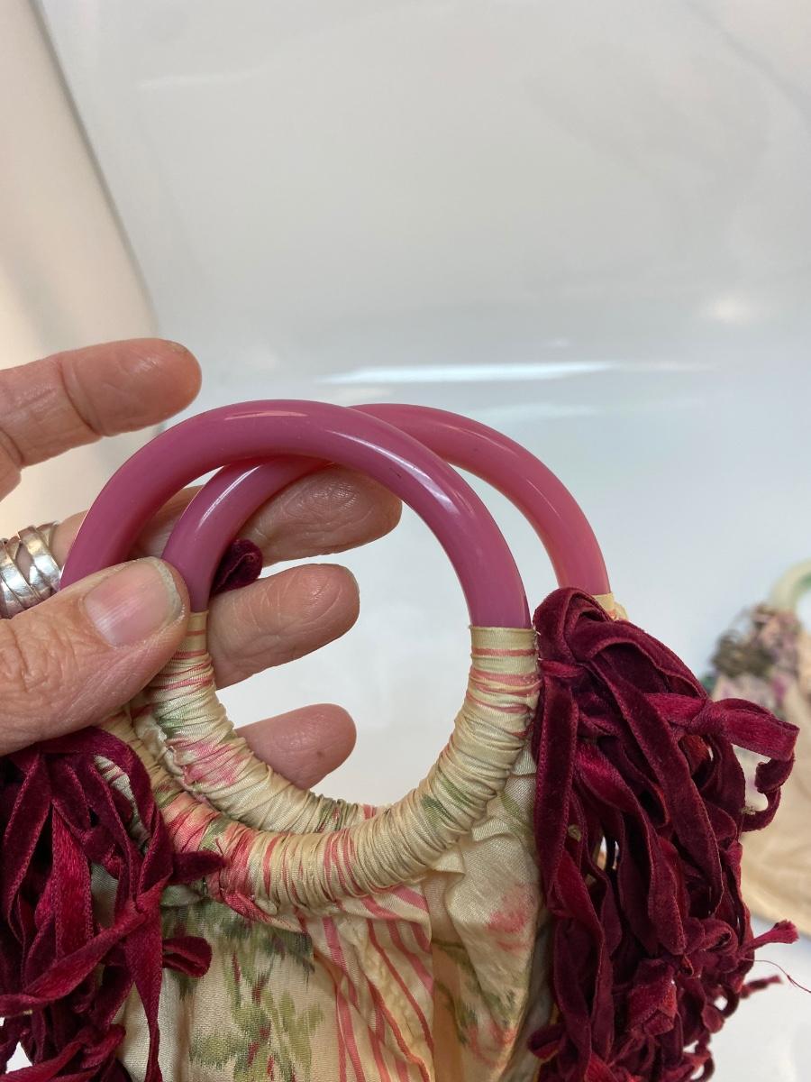 Pair of Handmade Silk Scarf Handbags with Stone Jadeite Bangle Handles. In vintage condition. The purple floral bag needs the side seam restitched partially. Both sets of handles seem to be polished stone. About 10" size.