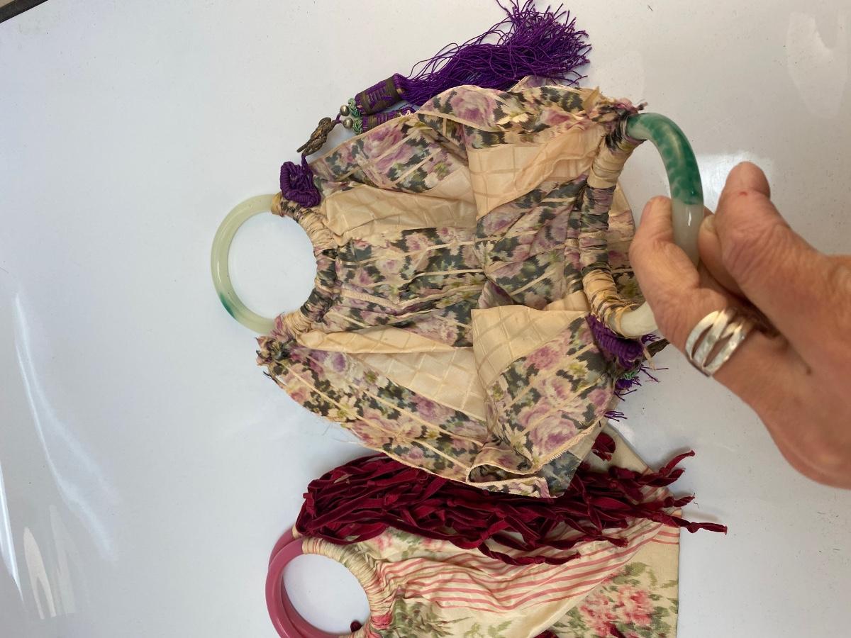 Pair of Handmade Silk Scarf Handbags with Stone Jadeite Bangle Handles