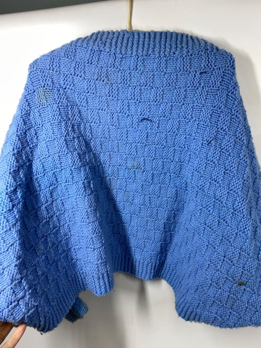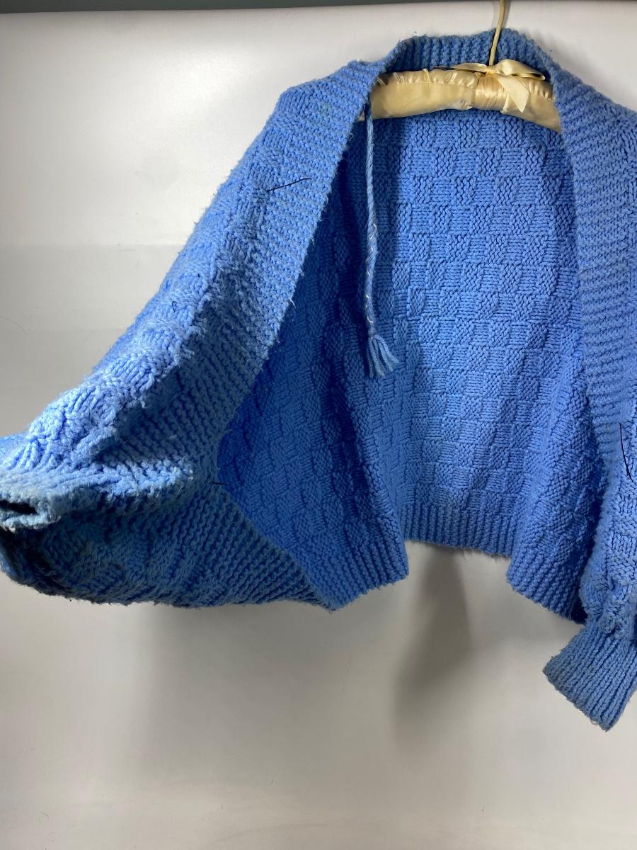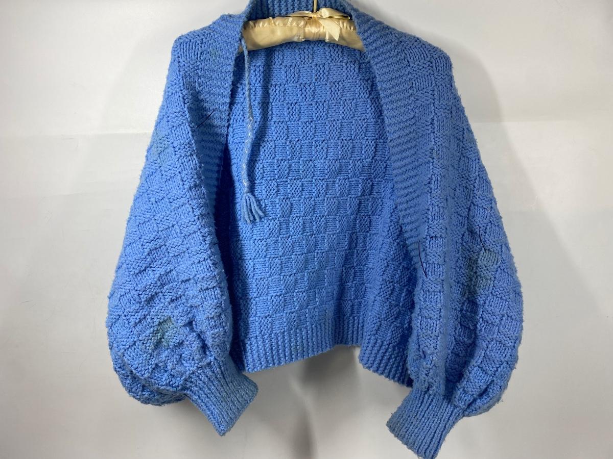 Retro Periwinkle Blue Crochet Knit Sweater Bolero Shoulder Wrap. Looks like a shoulder wrap with cuffs. There are some spots/stains, unsure how clean it may come with washing, some of the spots look more on the surface than set.