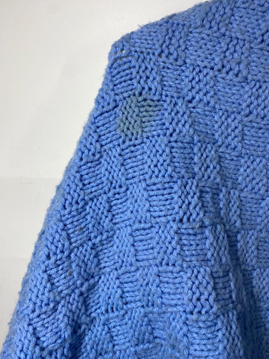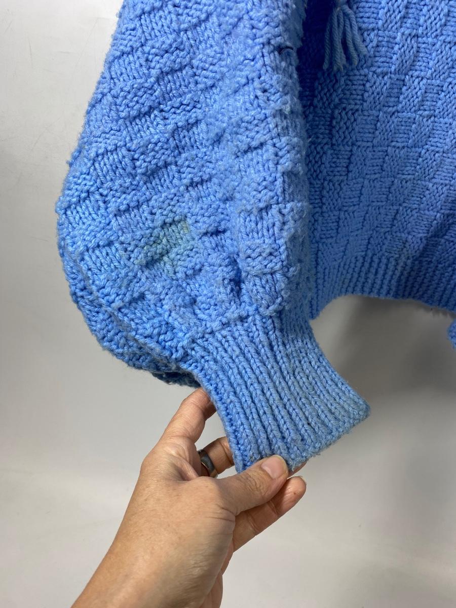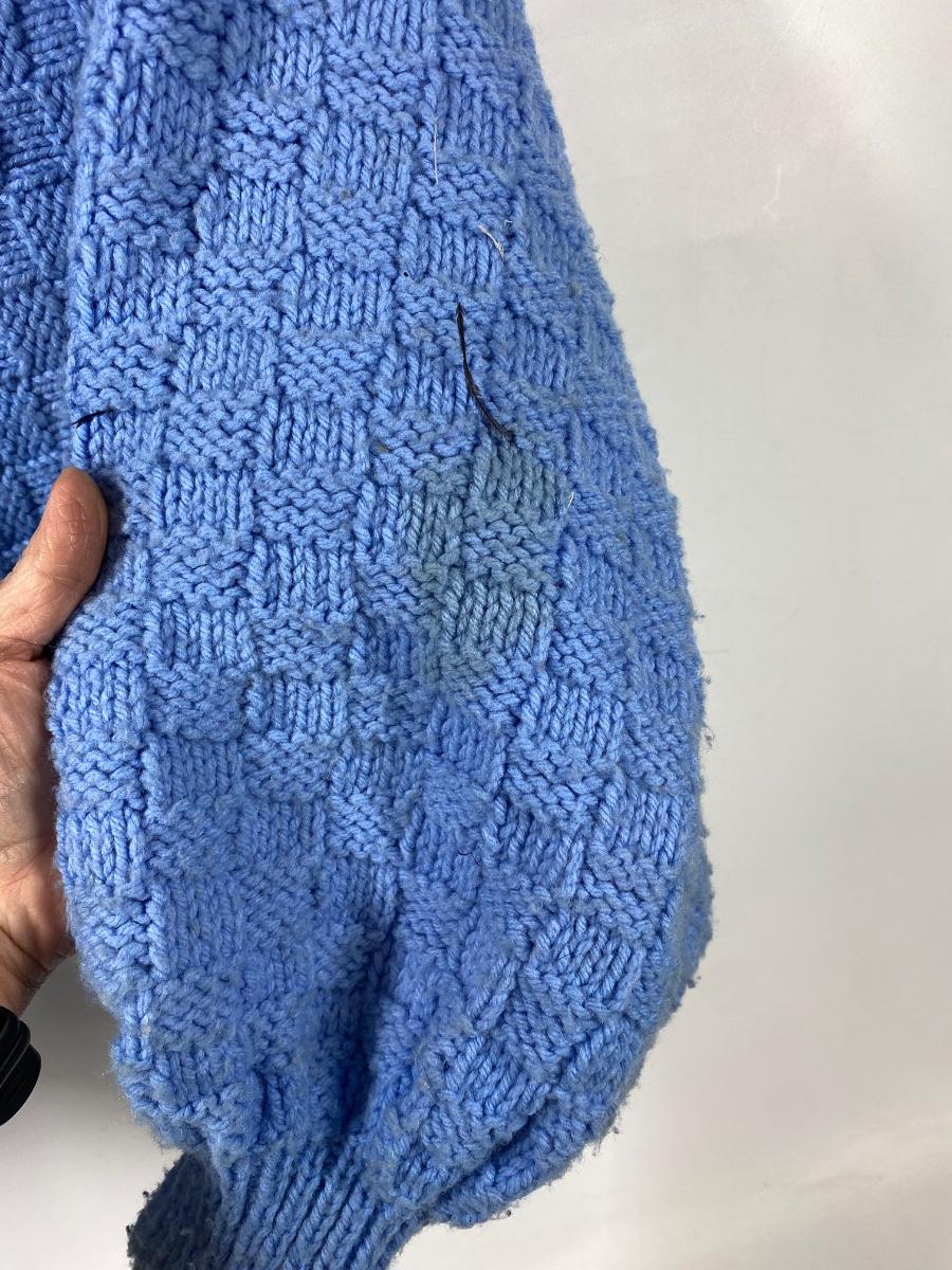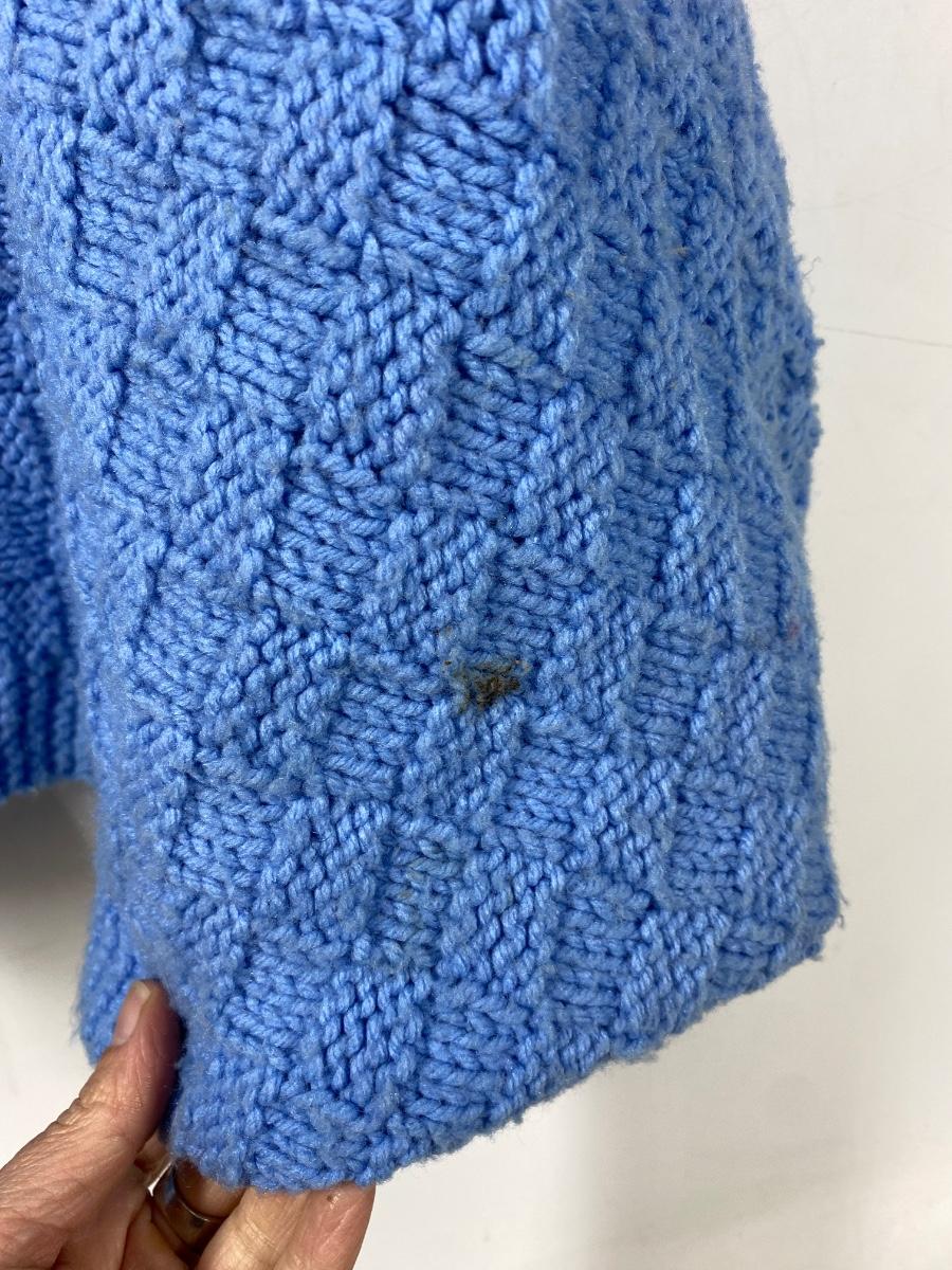 Retro Periwinkle Blue Crochet Knit Sweater Bolero Shoulder Wrap. Looks like a shoulder wrap with cuffs. There are some spots/stains, unsure how clean it may come with washing, some of the spots look more on the surface than set.