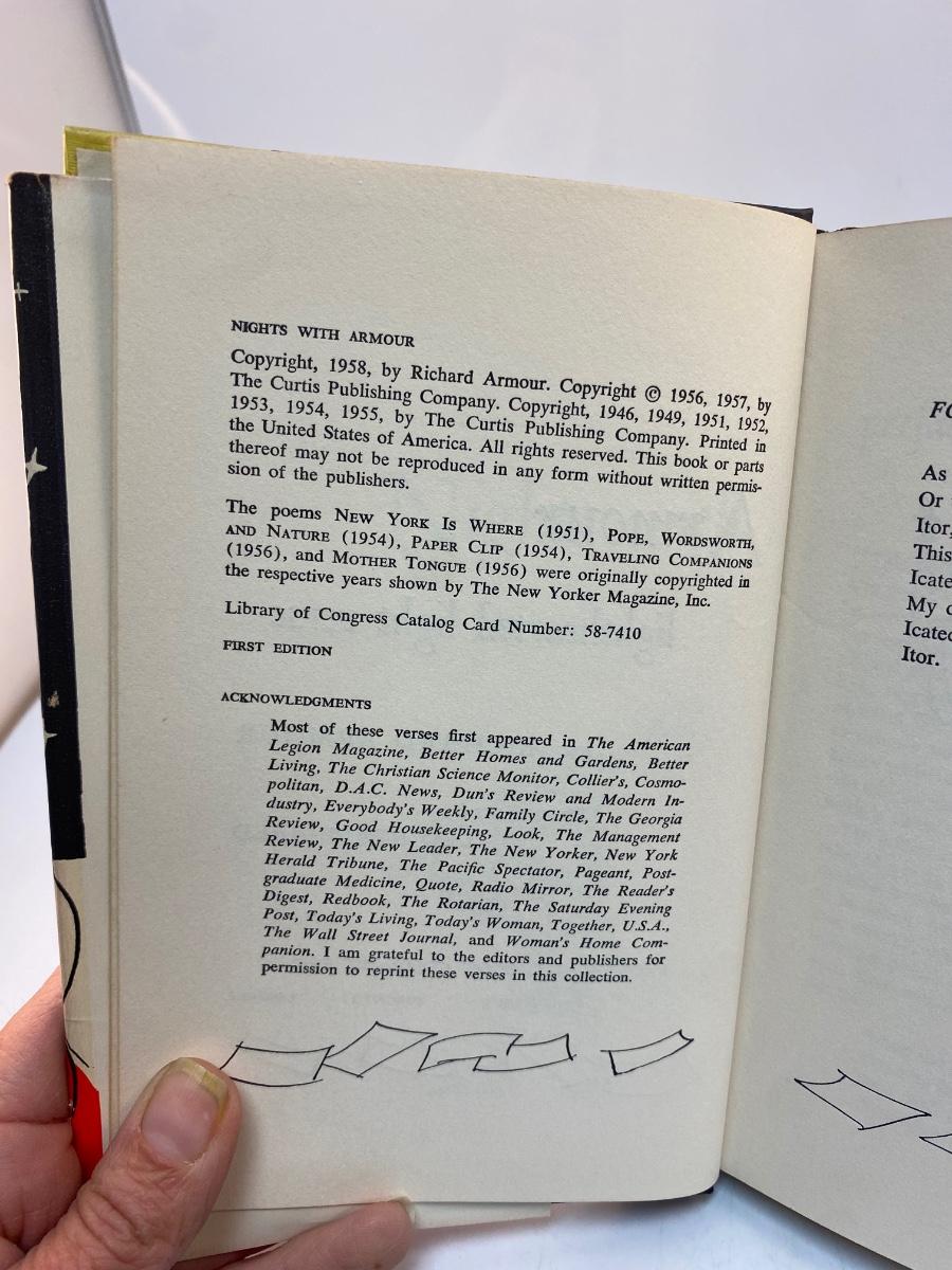 Vintage Midcentury Nights with Armour Lighthearted Poems Verses Signed. In vintage condition. Signed by author inside. Copyright 1958.