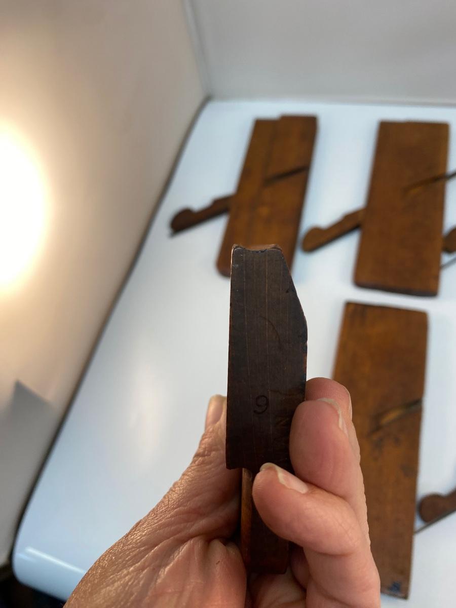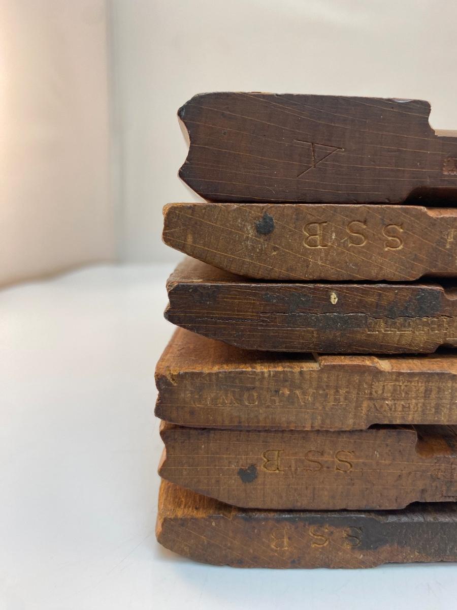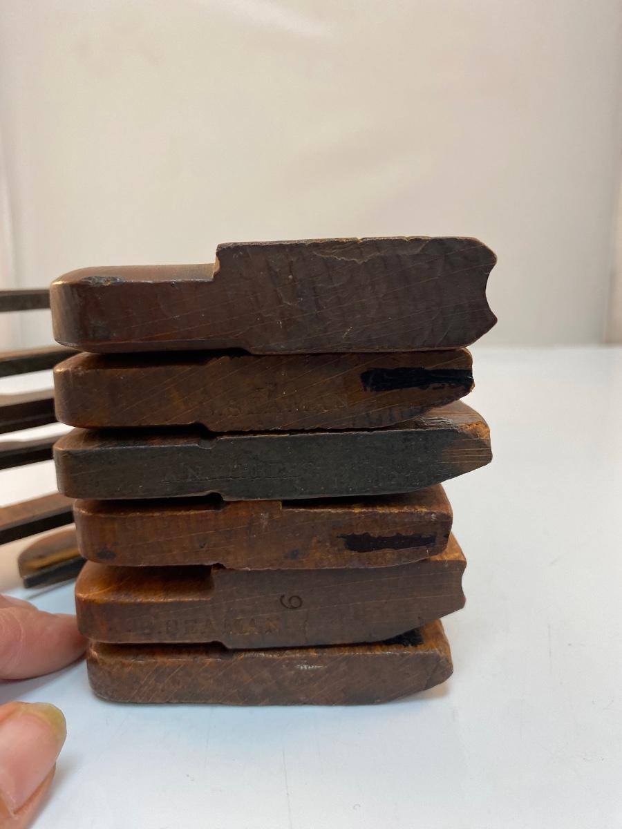 Lot of Six Fine Edge Rounding Curved Wood Planes with Blades. Smaller edge sizes. In good antique condition. May have previous owner name or initials stamped into end.