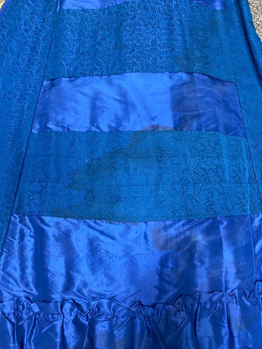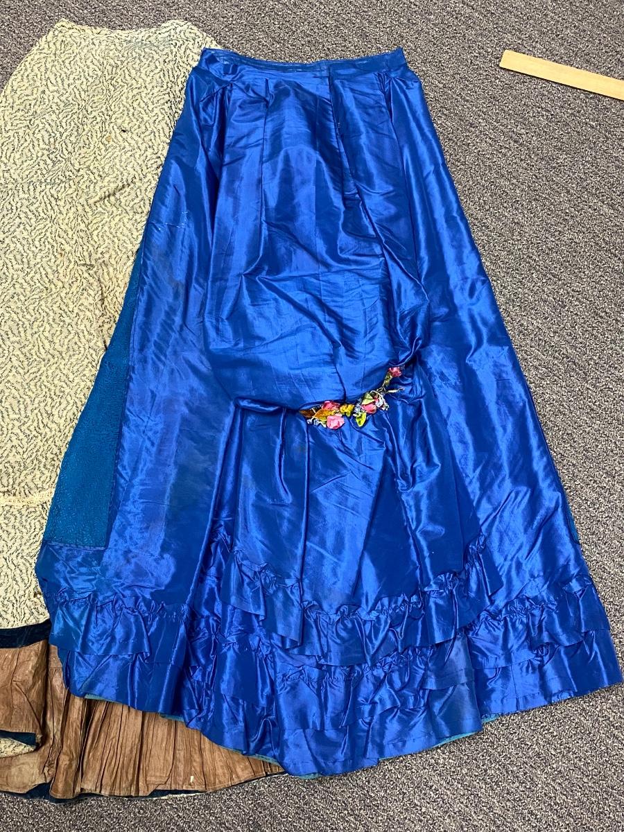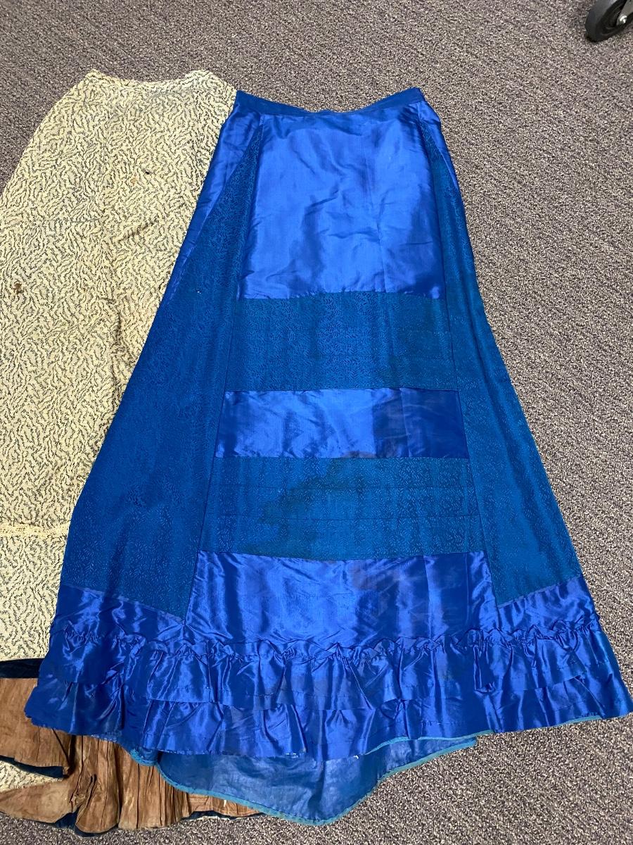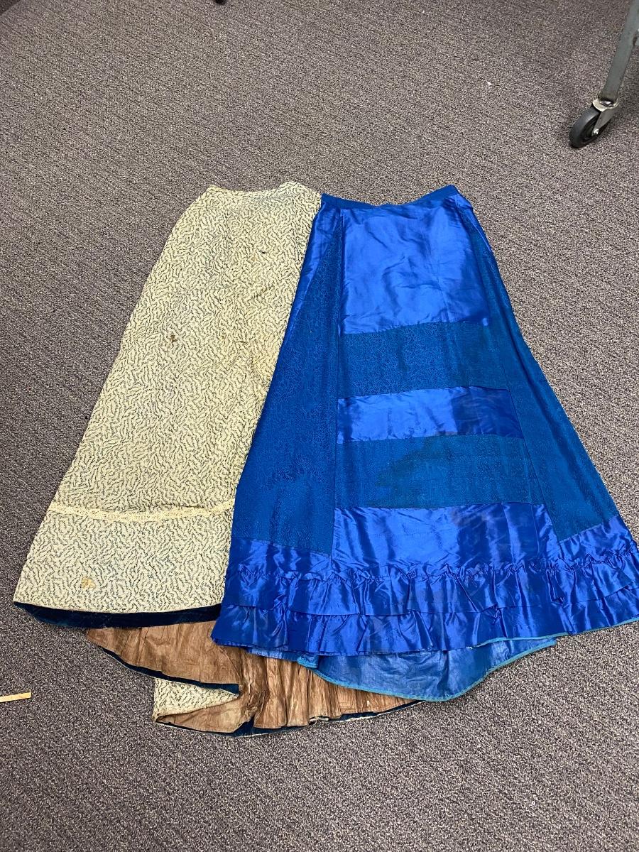 Pair of Vintage Antique Victorian Full Skirts. Both are in blue color. The more solid skirt is a lighter weight, the other is on the heavier side. There is discoloration and signs of age, but no major damage noticed.