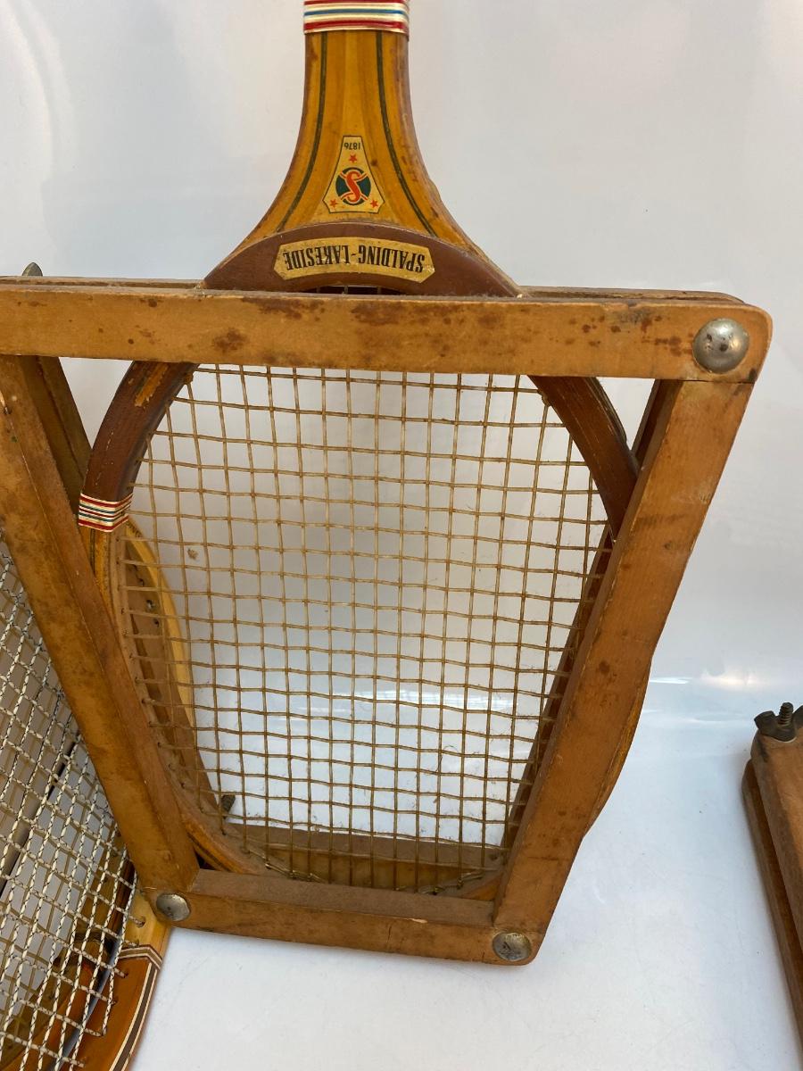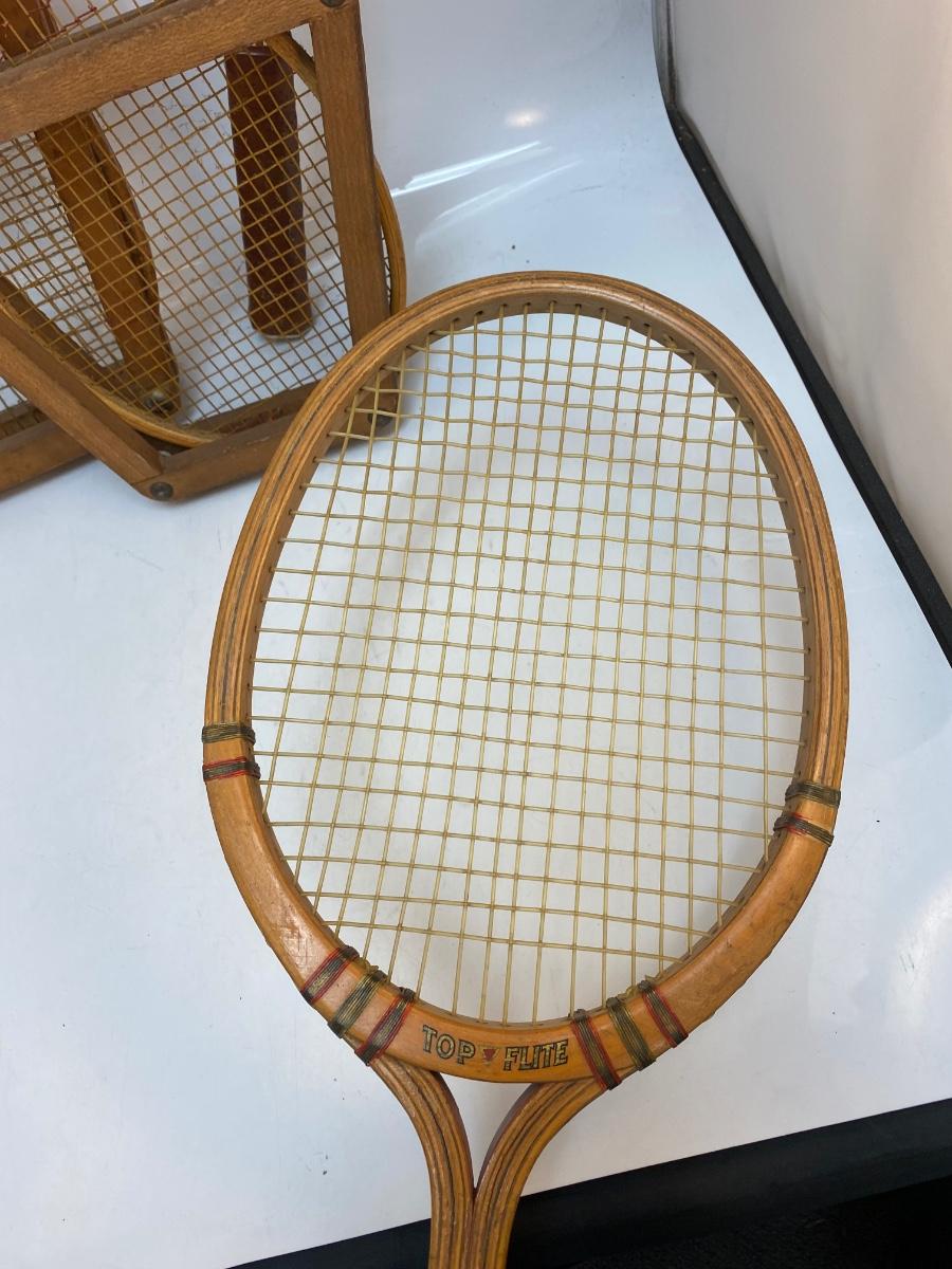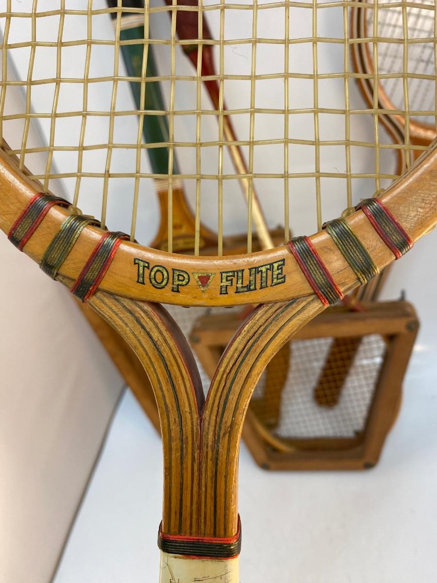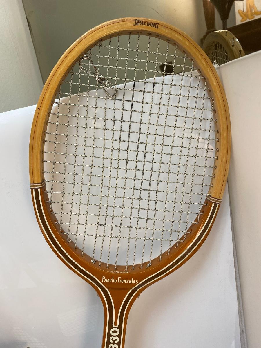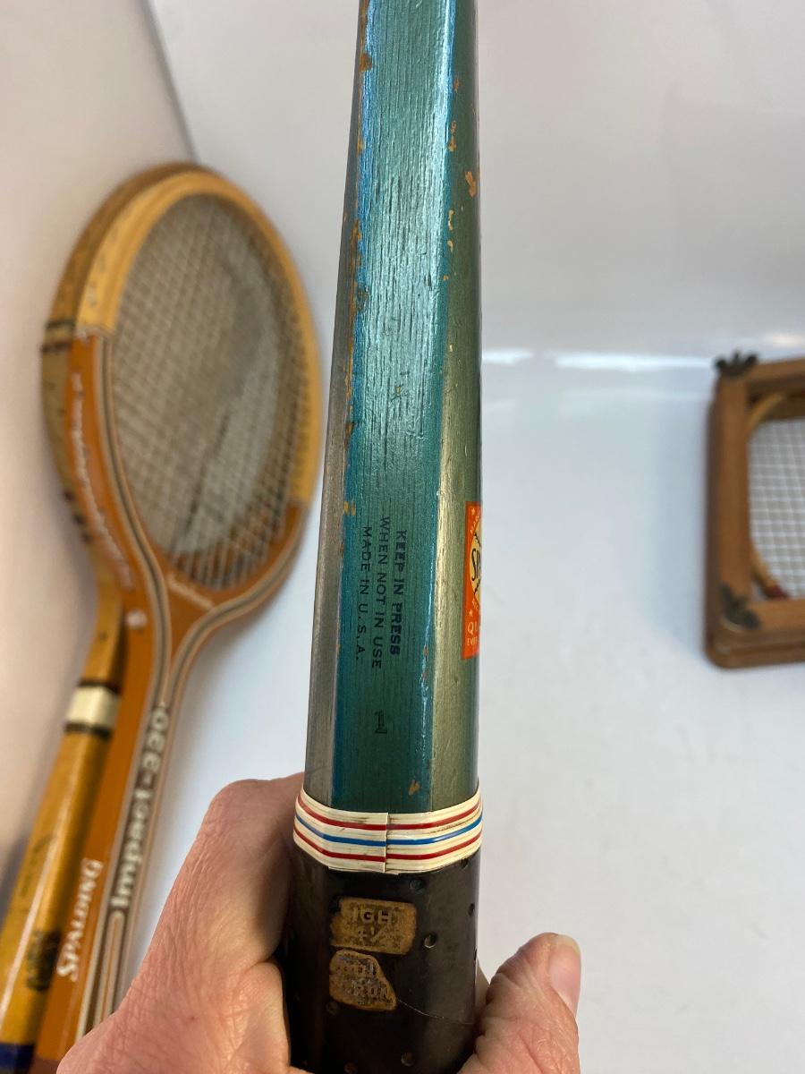 4 Vintage Tennis Badminton Rackets Spalding Pancho Gonzales Top Flite. in good vintage condition. Great for display. Includes two wood press frames.