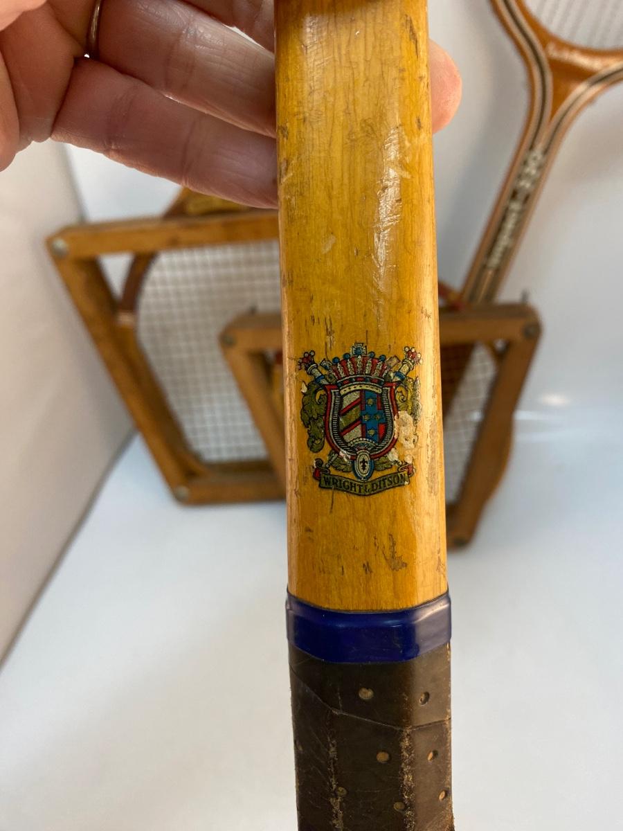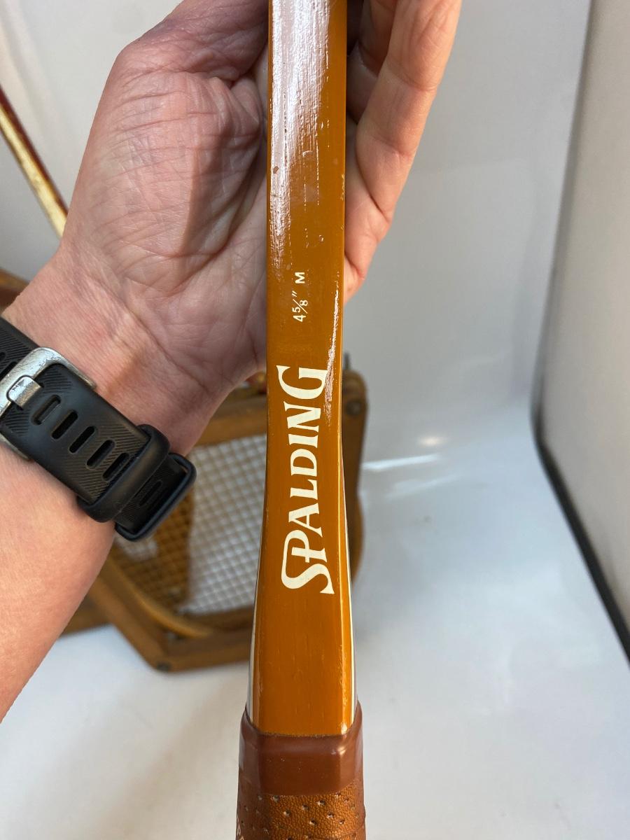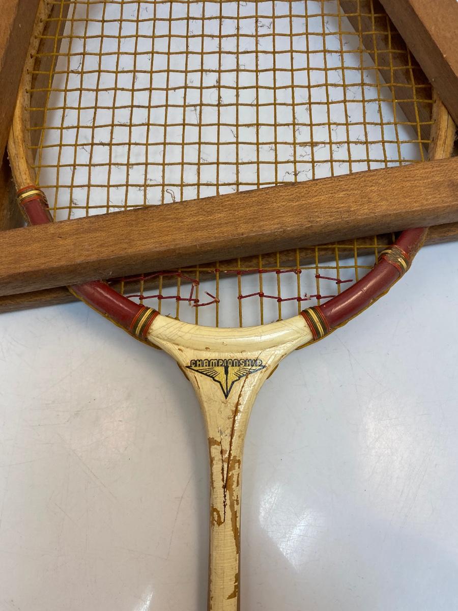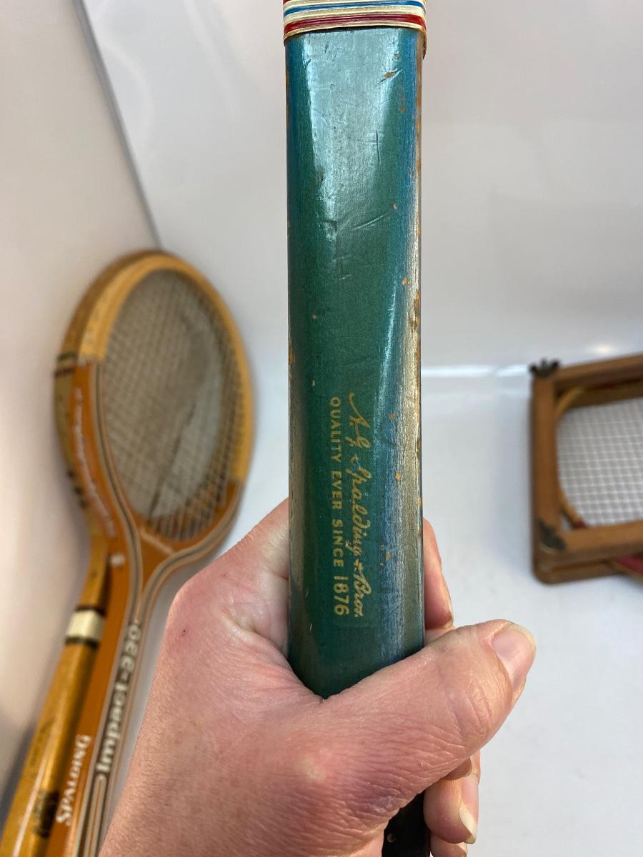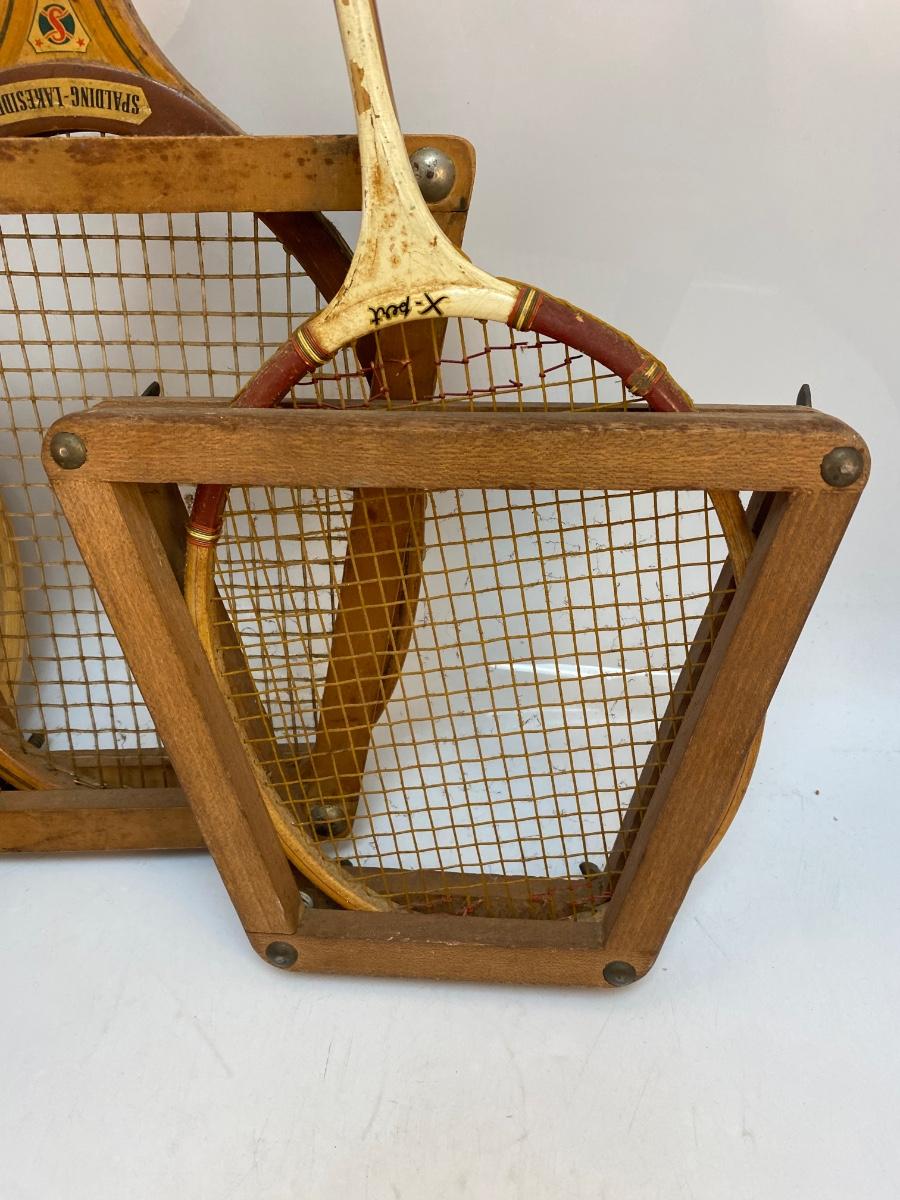 4 Vintage Tennis Badminton Rackets Spalding Pancho Gonzales Top Flite. in good vintage condition. Great for display. Includes two wood press frames.