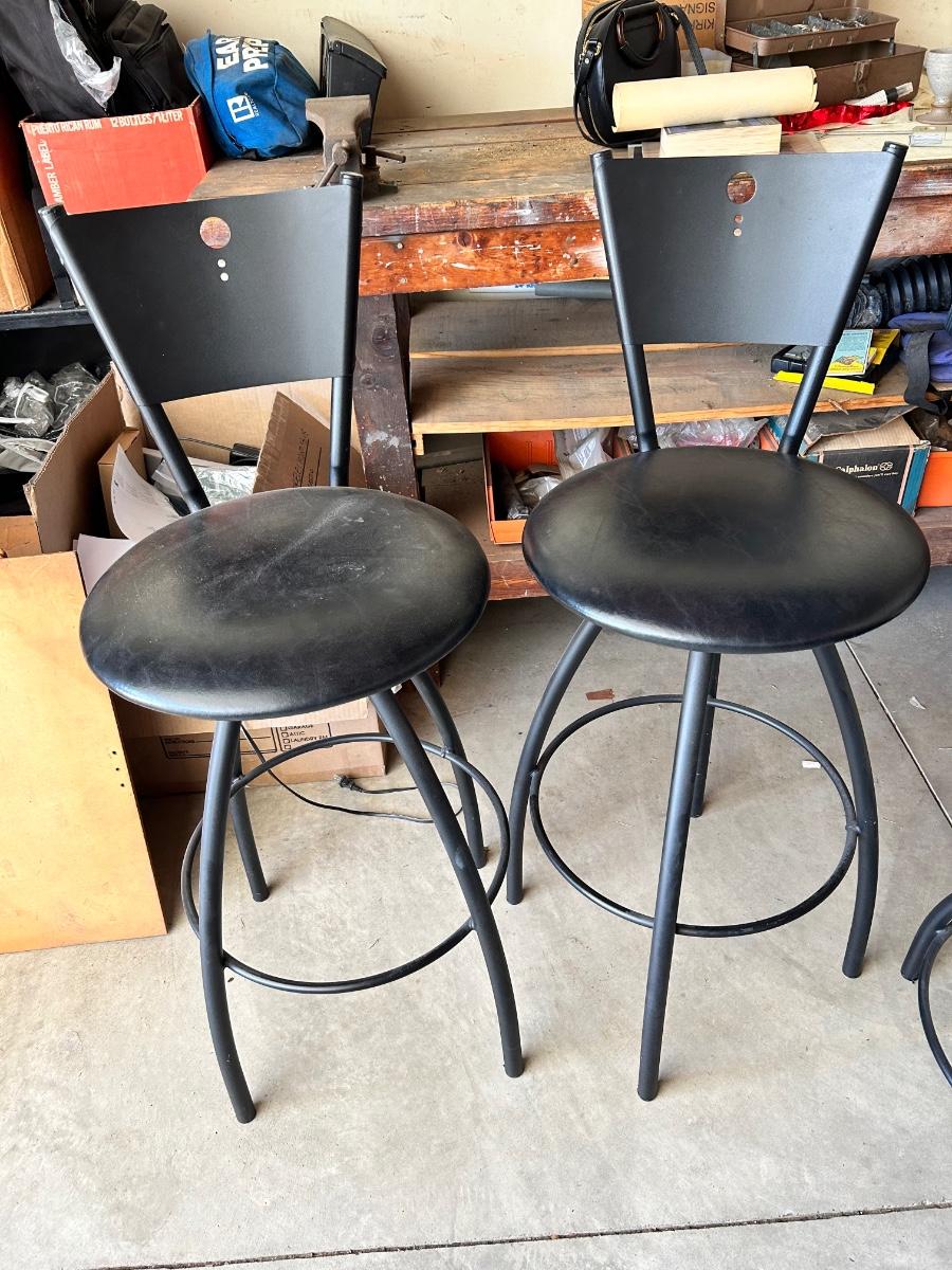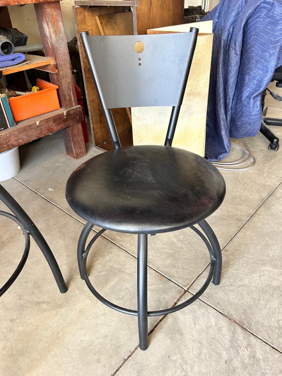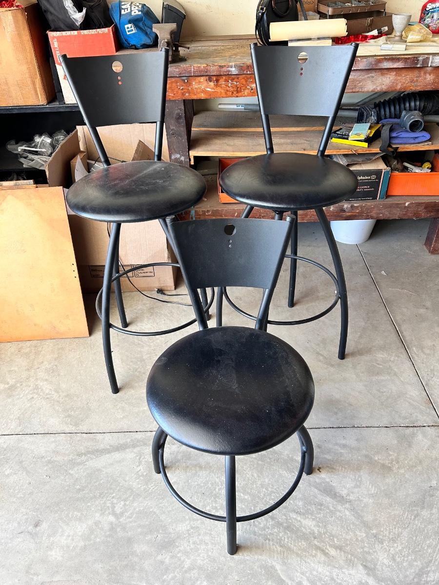 Set of Three Black Metal Stools Chairs Barstool & Short. Two barstool height and one on the low side. In used condition, no tears just dusty from garage. **Pick up to be arrange in Fullerton after auction closes**