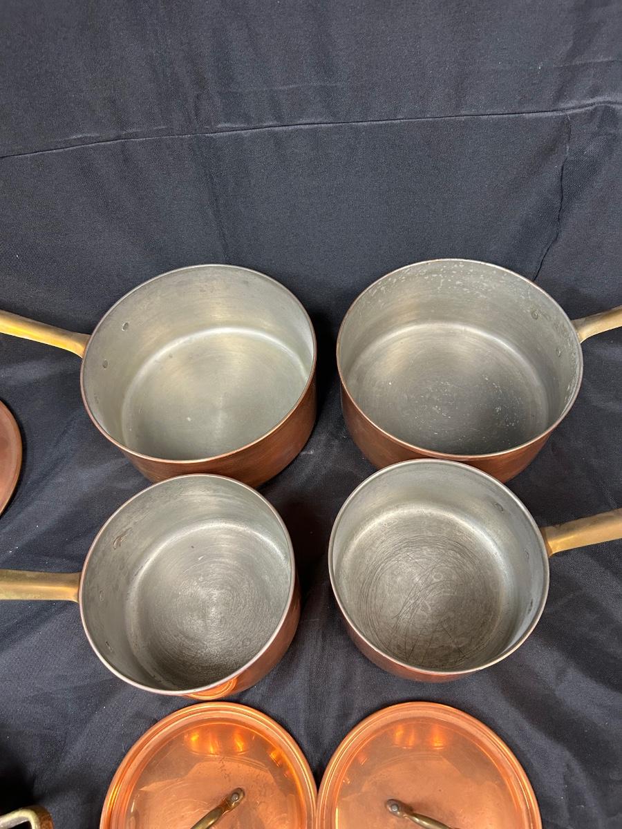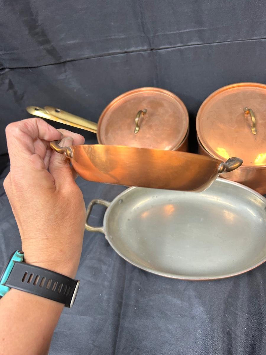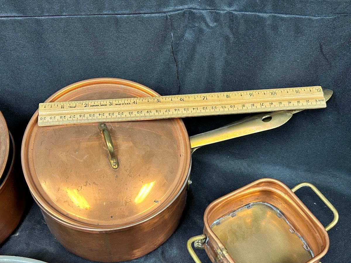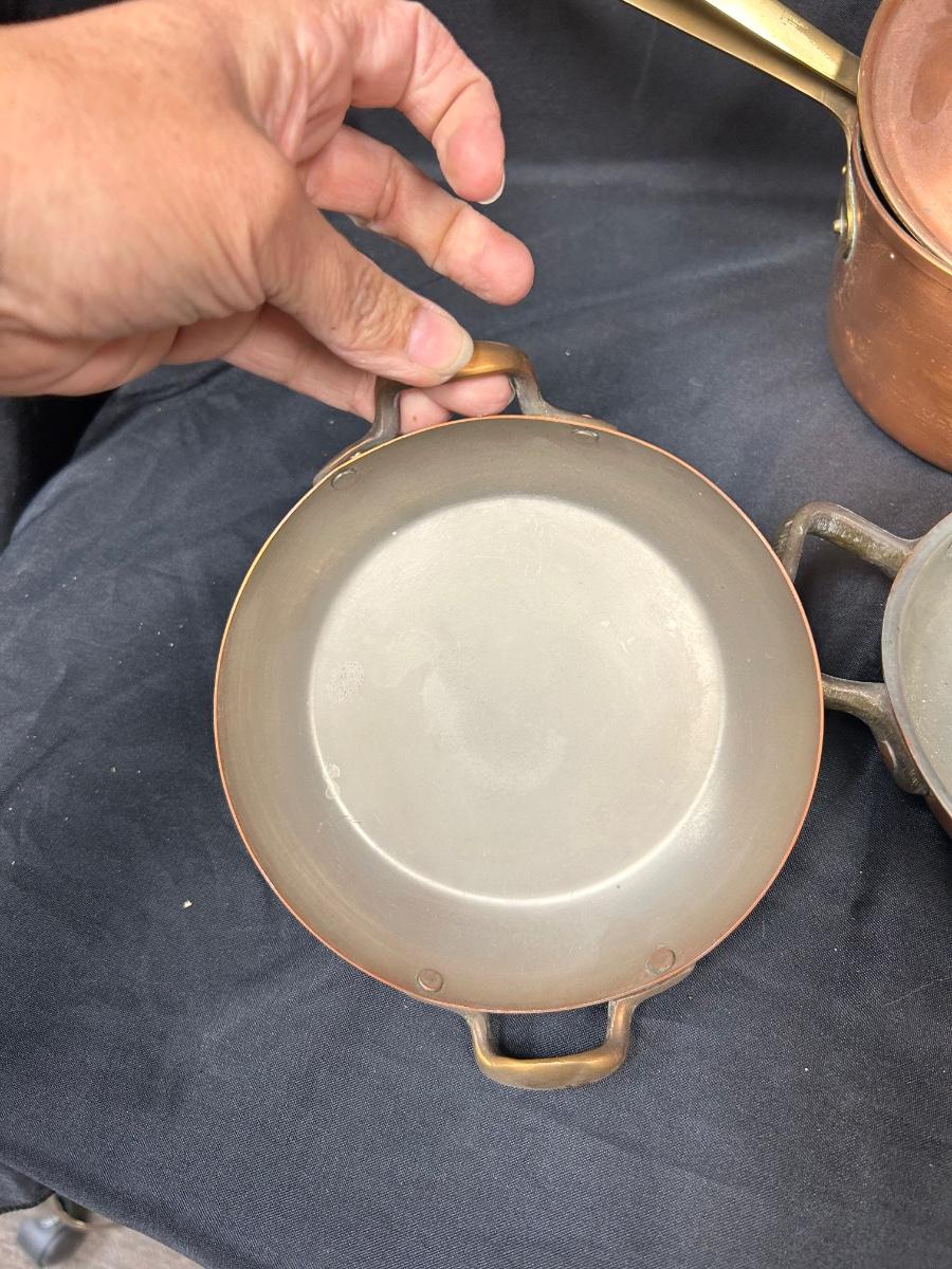 Copper Pan Set Saucepans with Lids Shallow Casserole Dish Bowl. Previously used. In good condition. Small size great for display and decor.