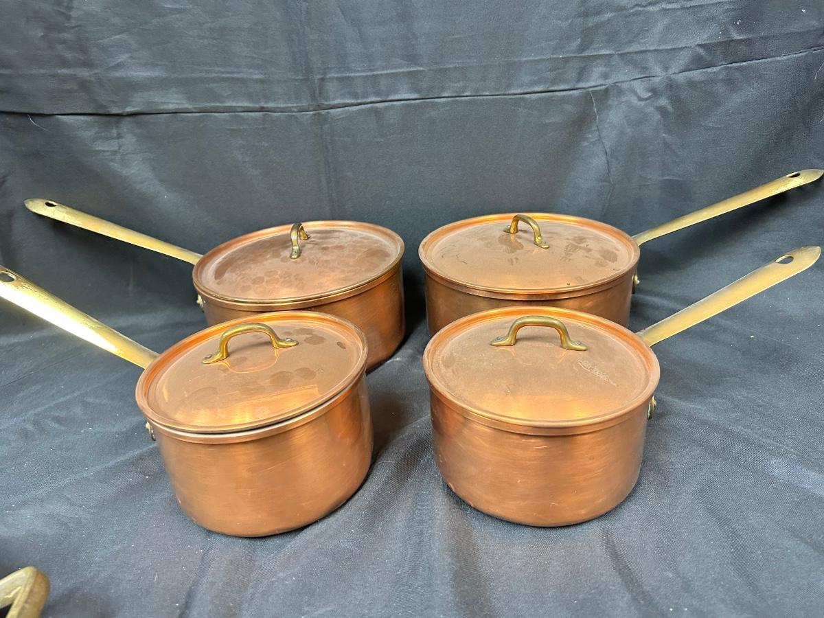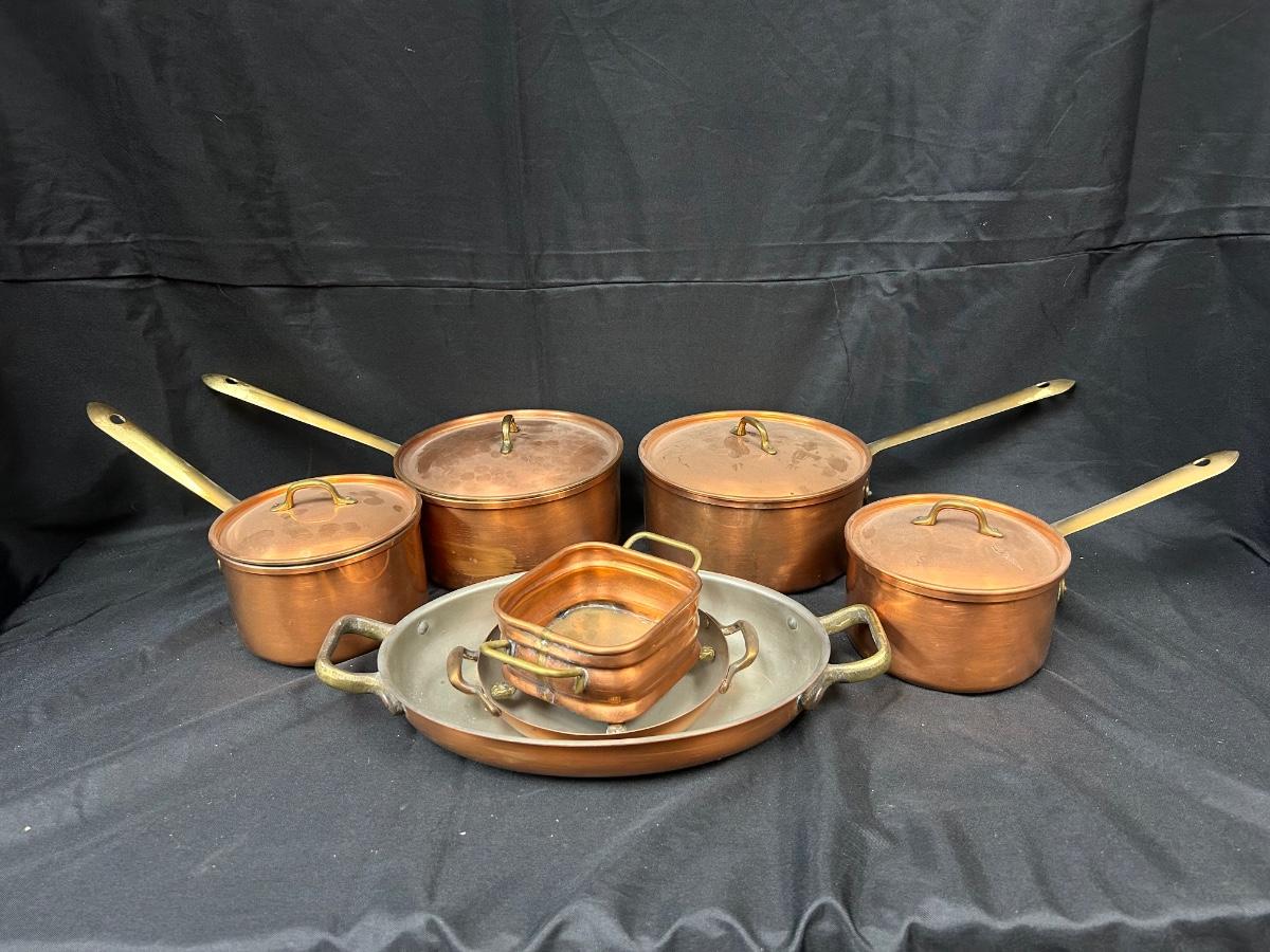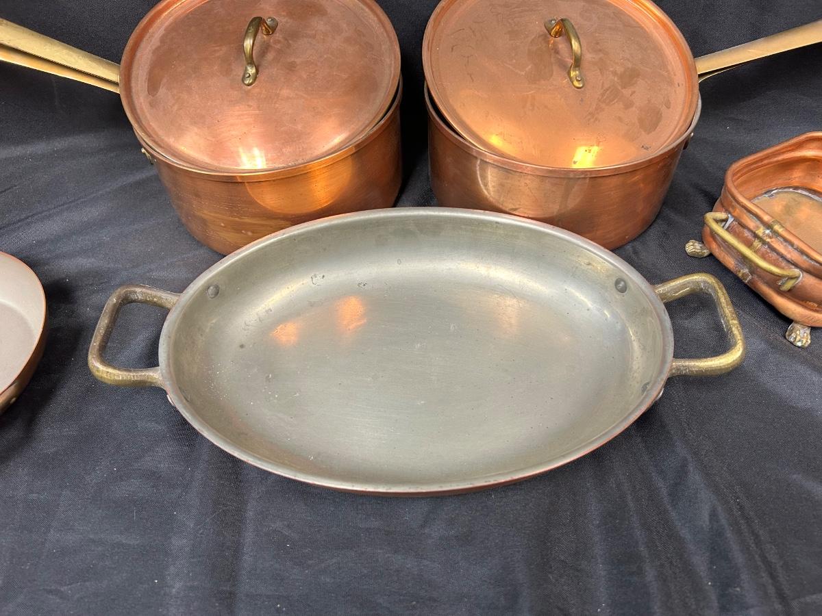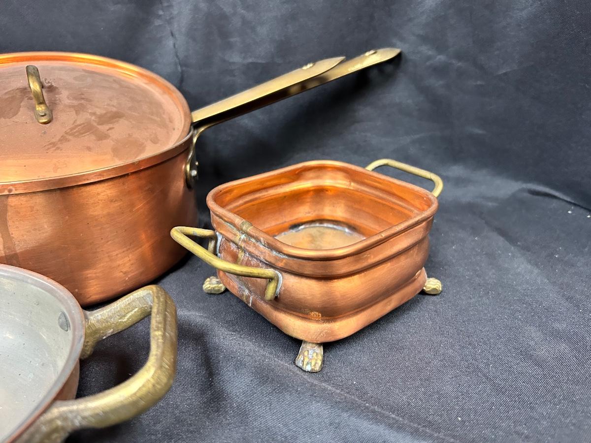 Copper Pan Set Saucepans with Lids Shallow Casserole Dish Bowl. Previously used. In good condition. Small size great for display and decor.