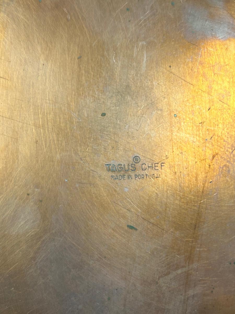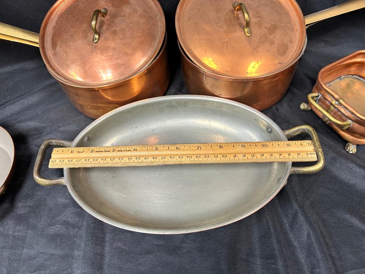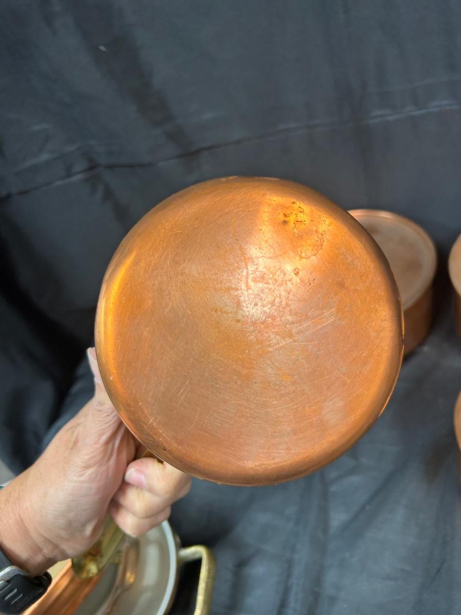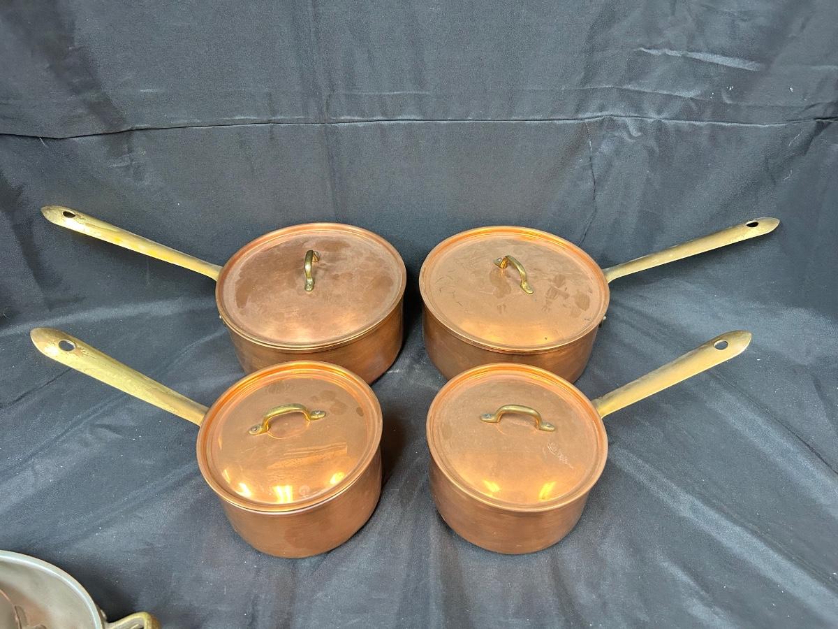 Copper Pan Set Saucepans with Lids Shallow Casserole Dish Bowl. Previously used. In good condition. Small size great for display and decor.