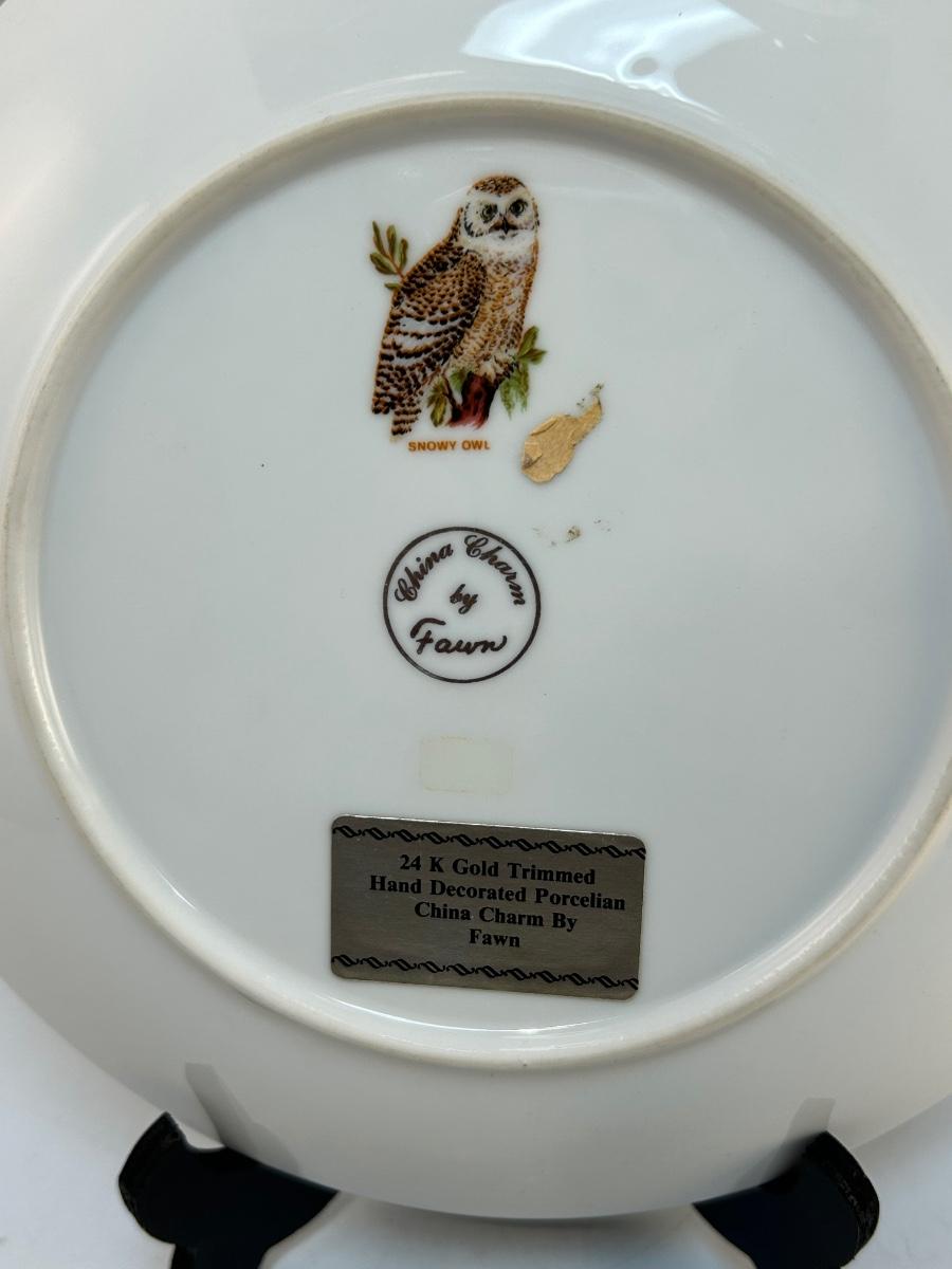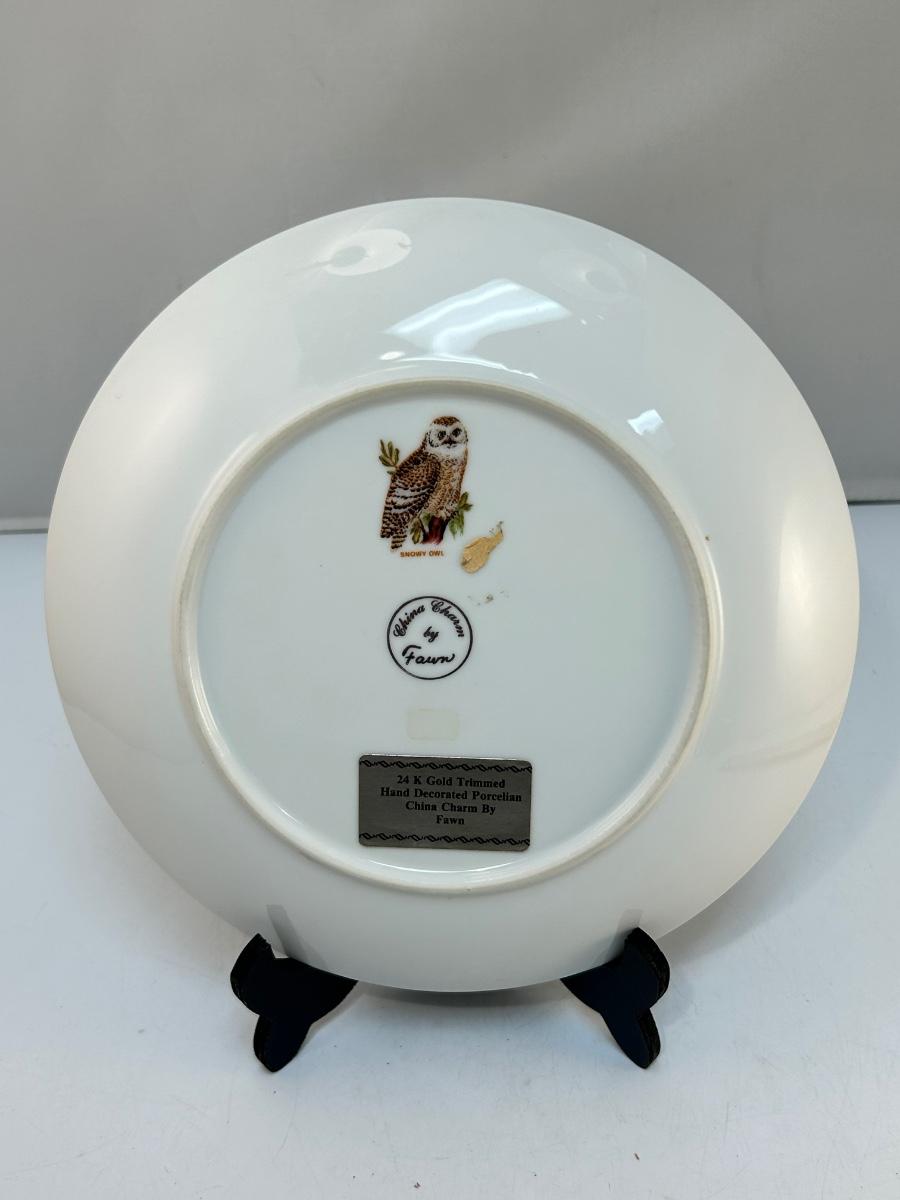 Vintage Retro Snowy Owl 24k Trimmed Porcelain Plate China Charm by Fawn. In good condition, original sticker still attached on the back.
