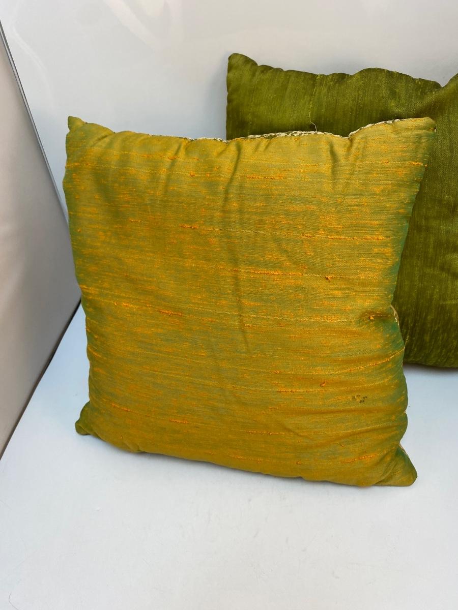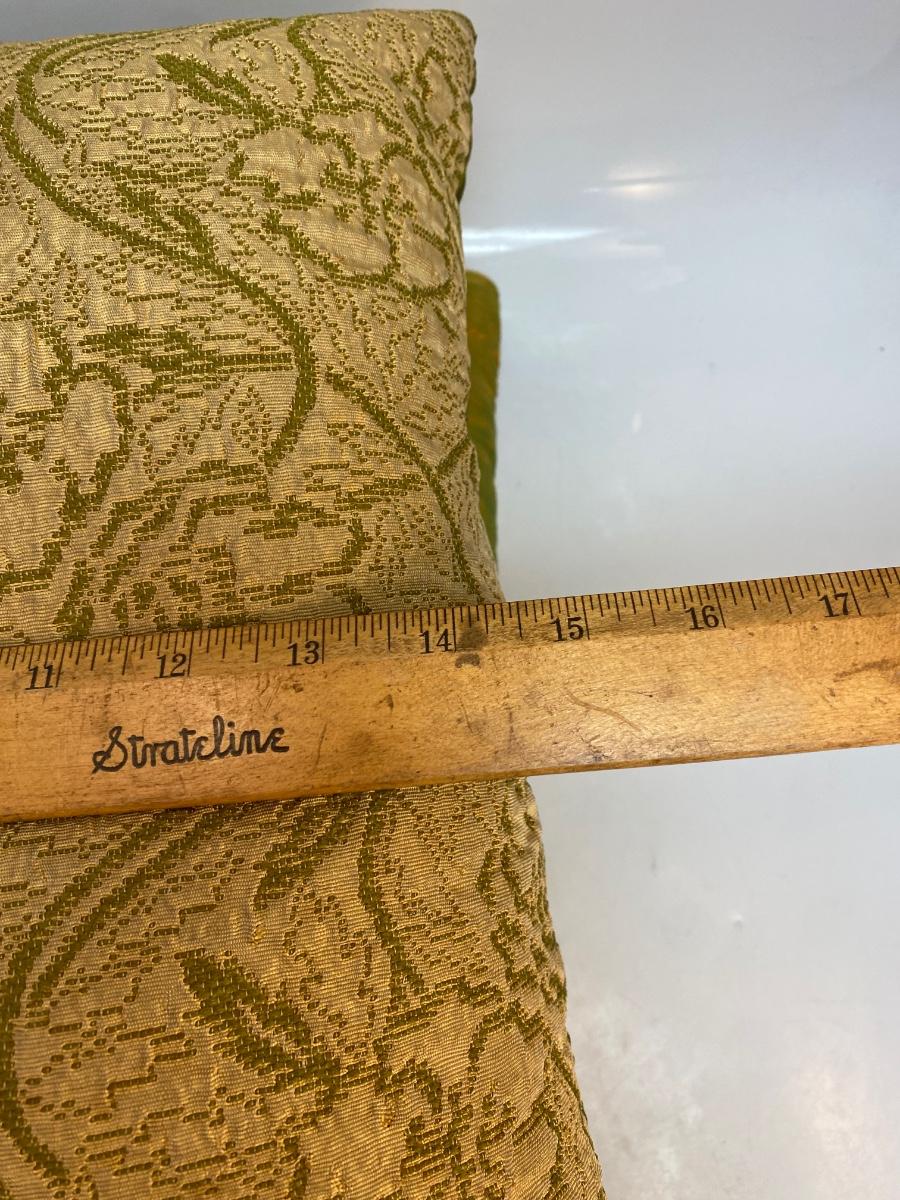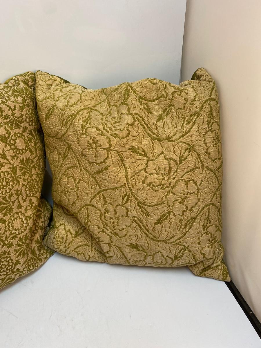 Funky Vintage Olive Green and Gold Accent Throw Pillows Floral Pattern. In good vintage condition. No spots or stains. Different patterns but same material. The backs are green with one having a green & orange look. About 15" square.