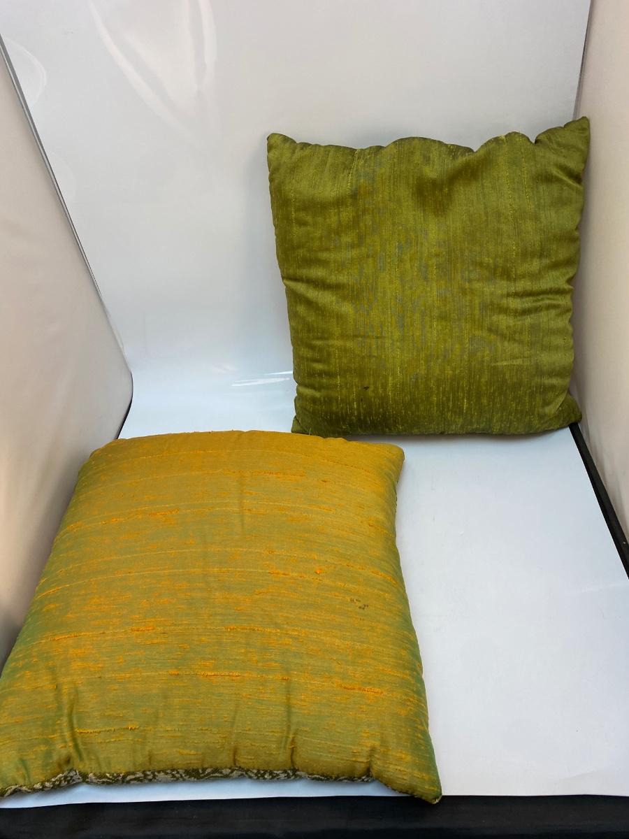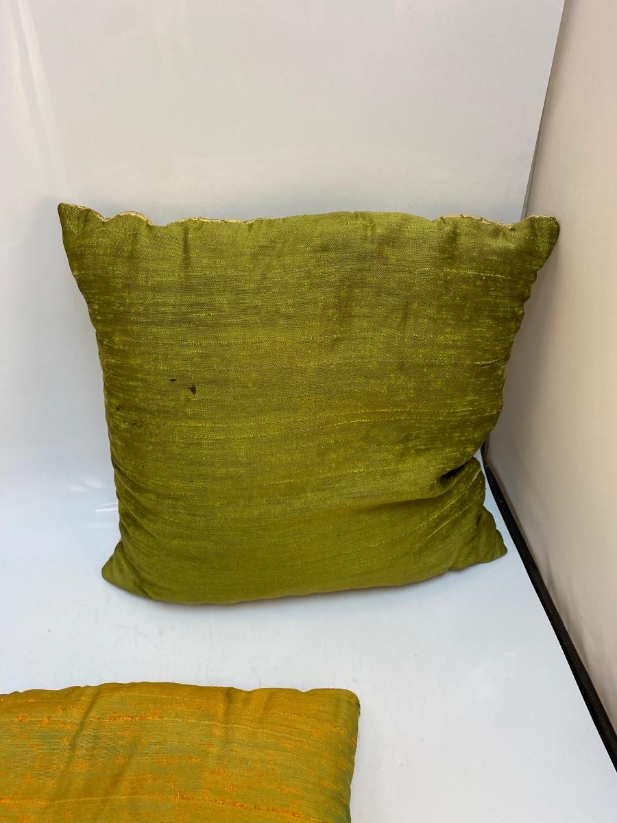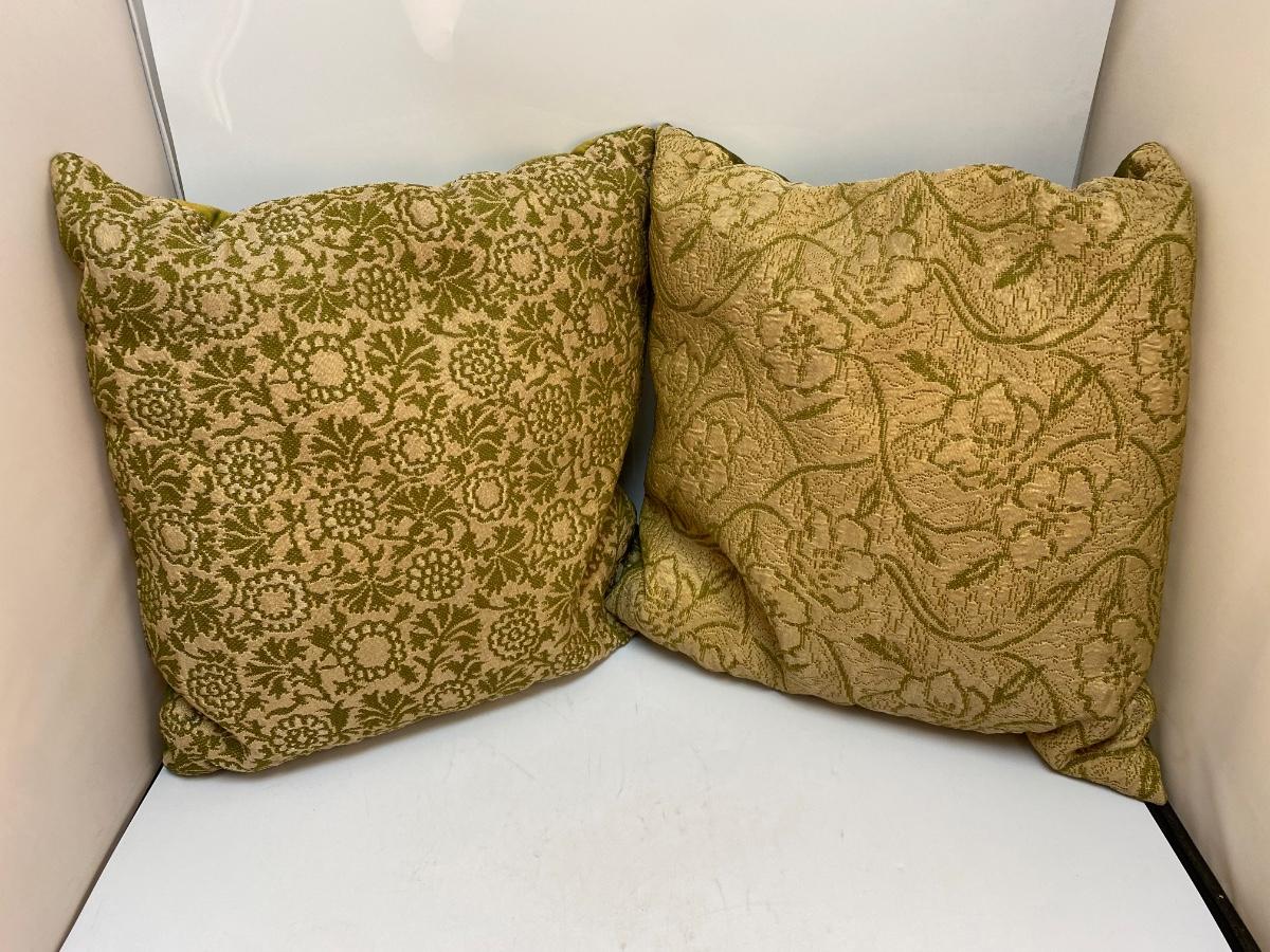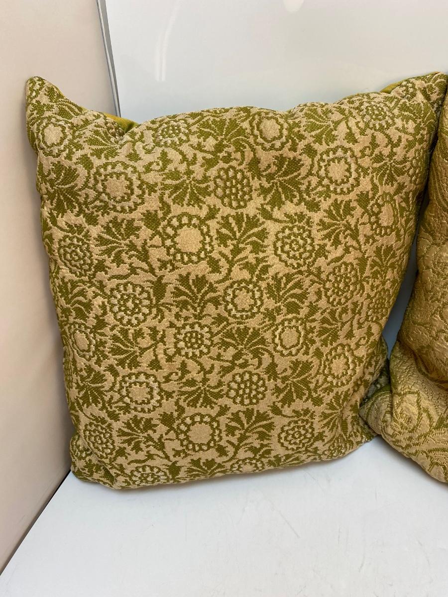Funky Vintage Olive Green and Gold Accent Throw Pillows Floral Pattern. In good vintage condition. No spots or stains. Different patterns but same material. The backs are green with one having a green & orange look. About 15" square.