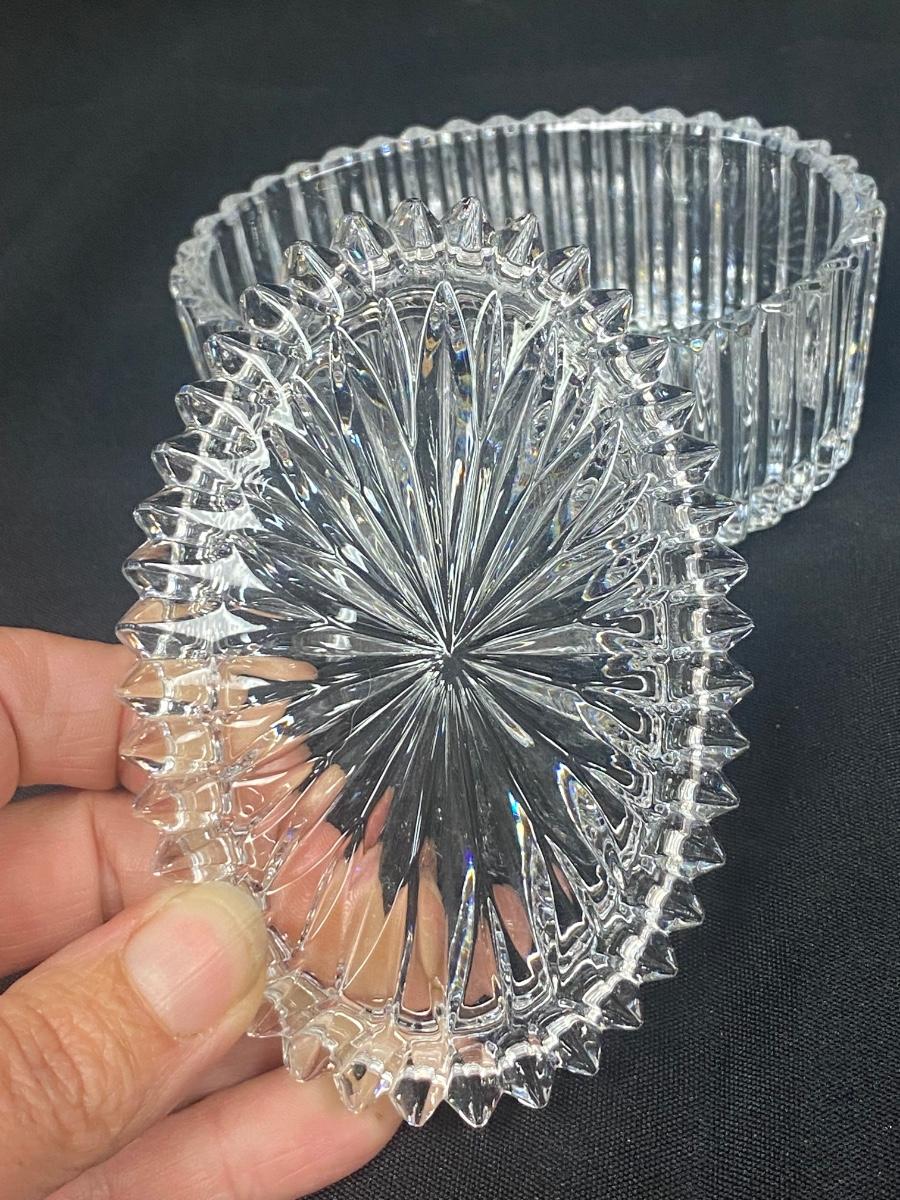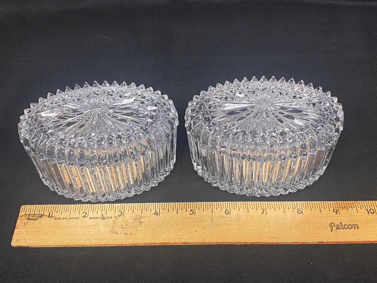 Pair of Ribbed Lidded Crystal Glass Trinket Dishes Jewelry Boxes. Good condition, identical boxes.