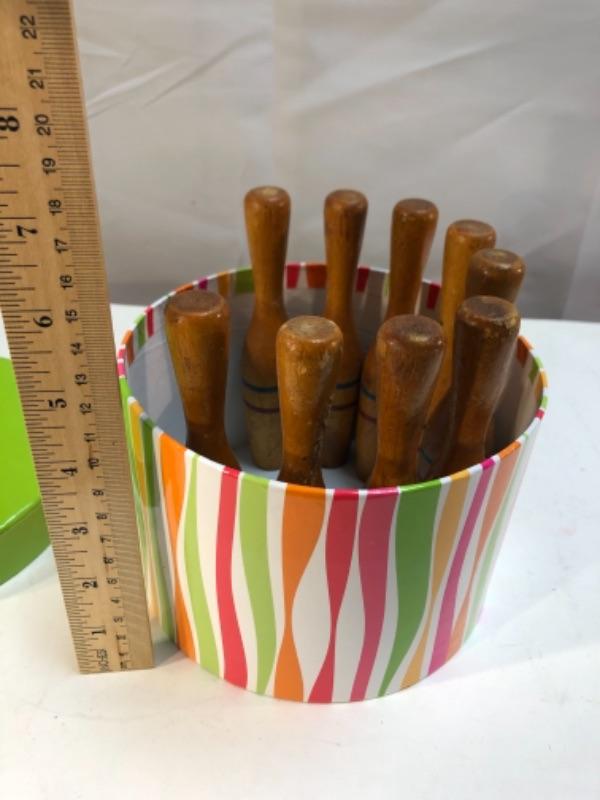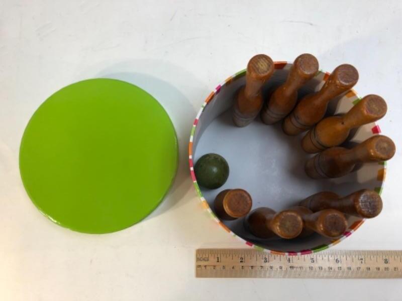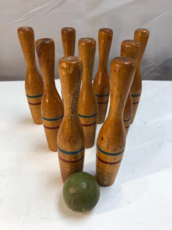 Rustic style bowling set. Wood pins and ball. Signs of age and wear. Great for display. Small, about 6" size