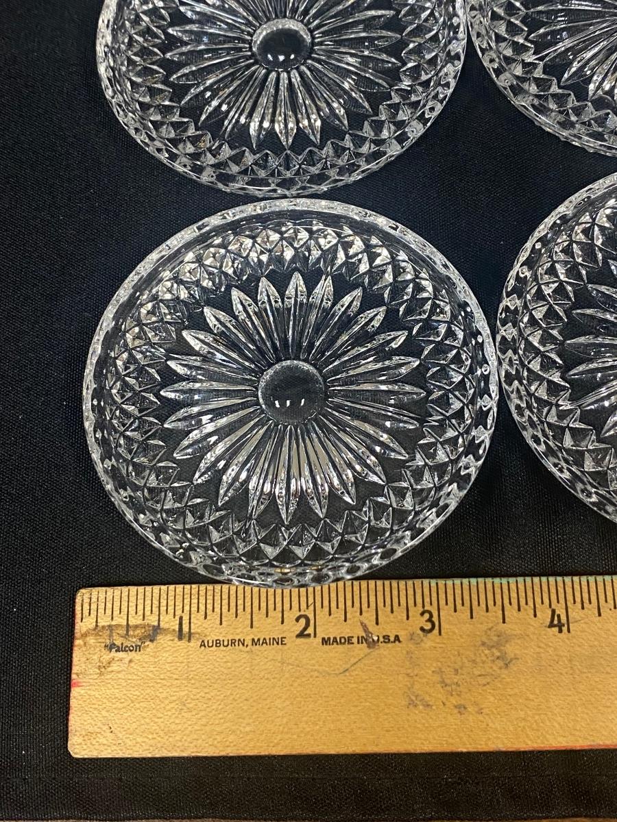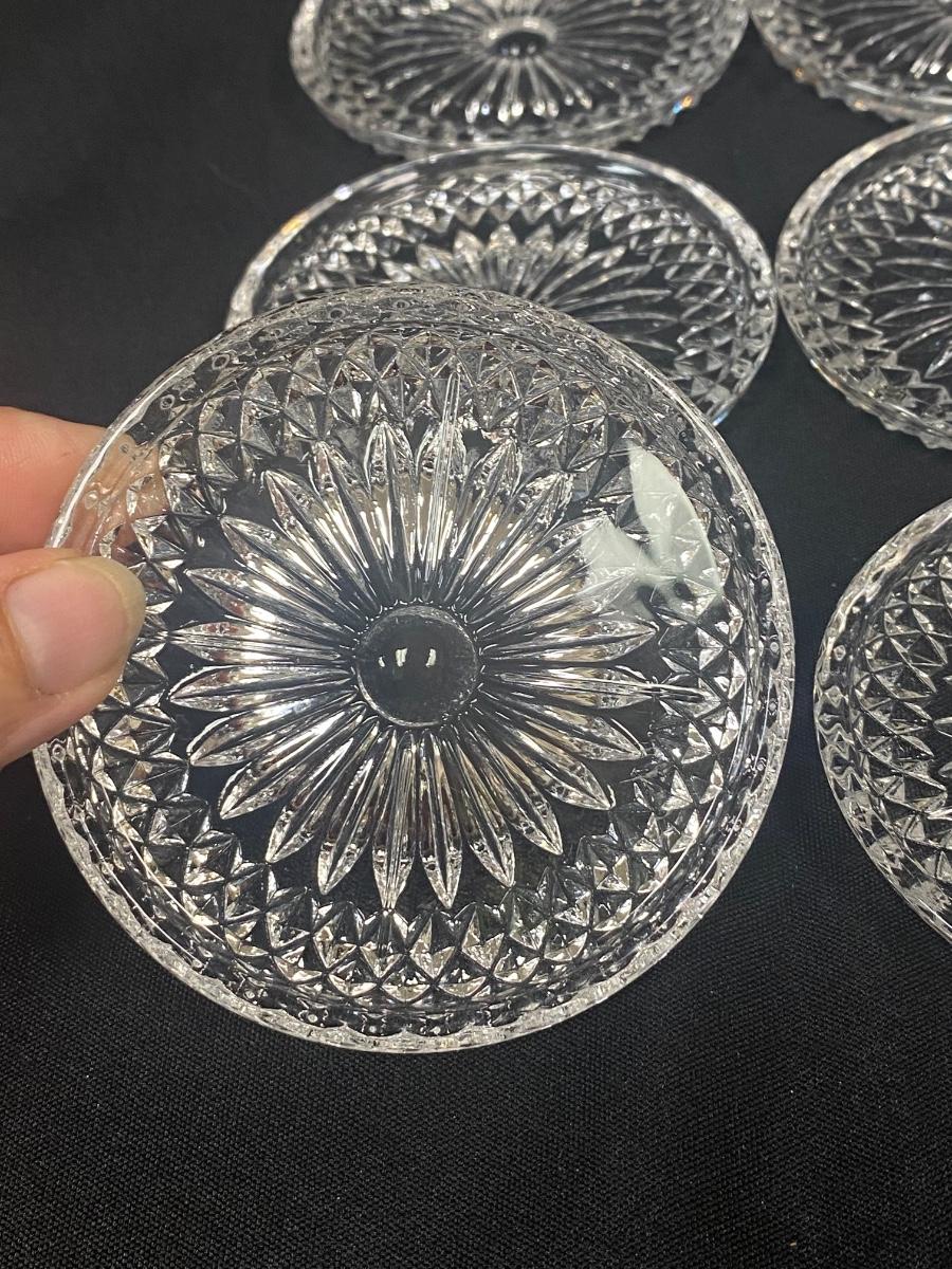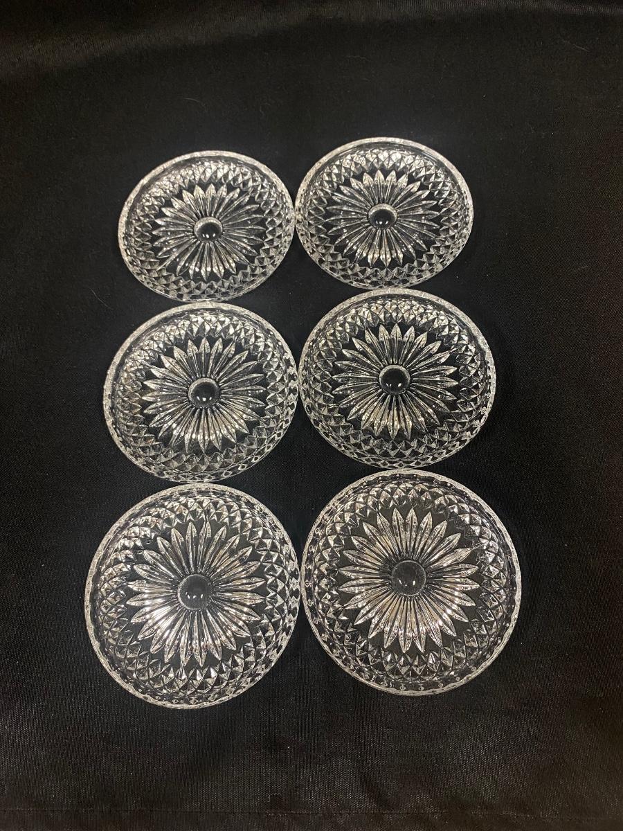 Set of 6 Cut Crystal Glass Daisy Center Drink Coasters. In good condition, no chips. About 3.5" size.
