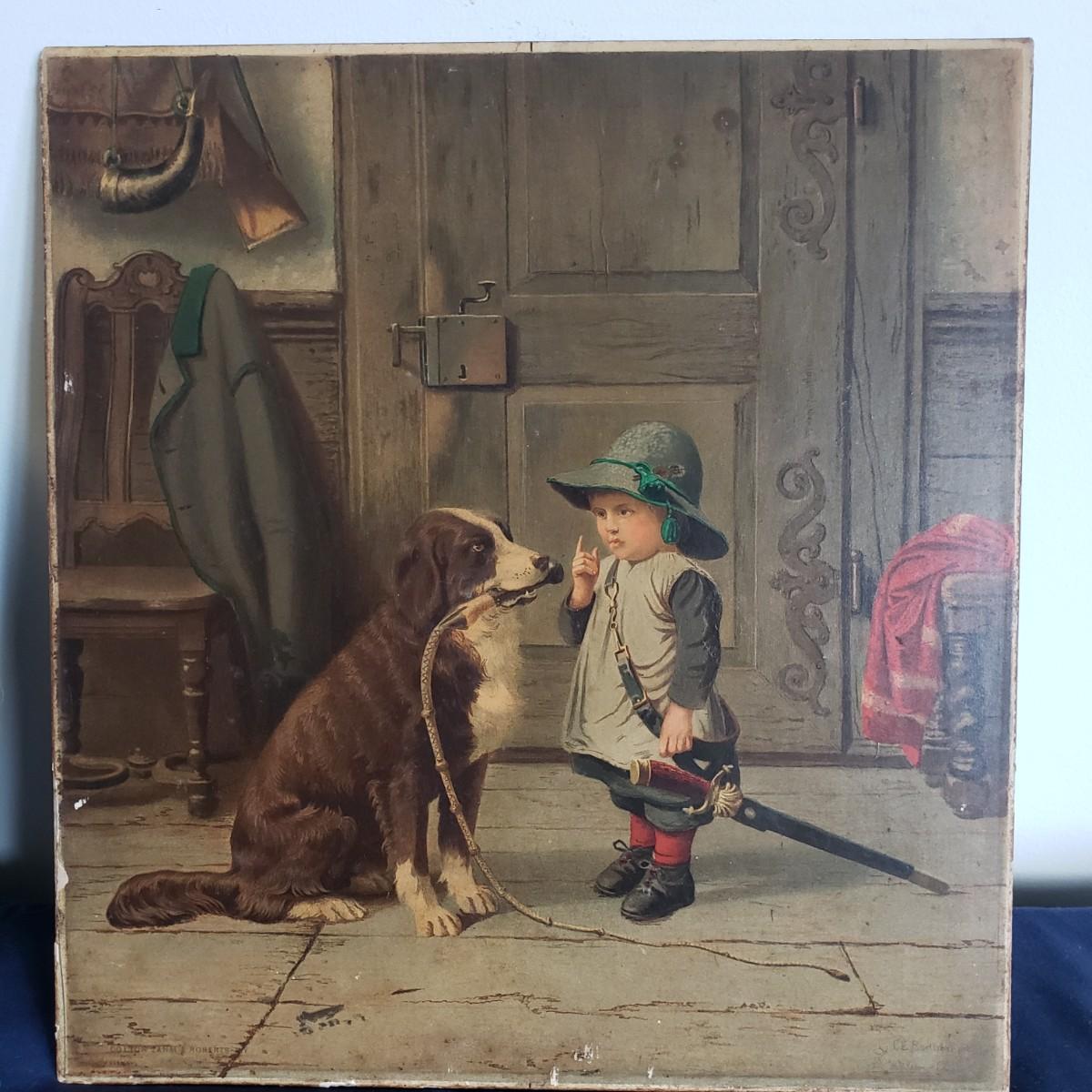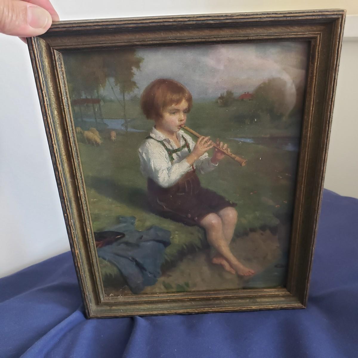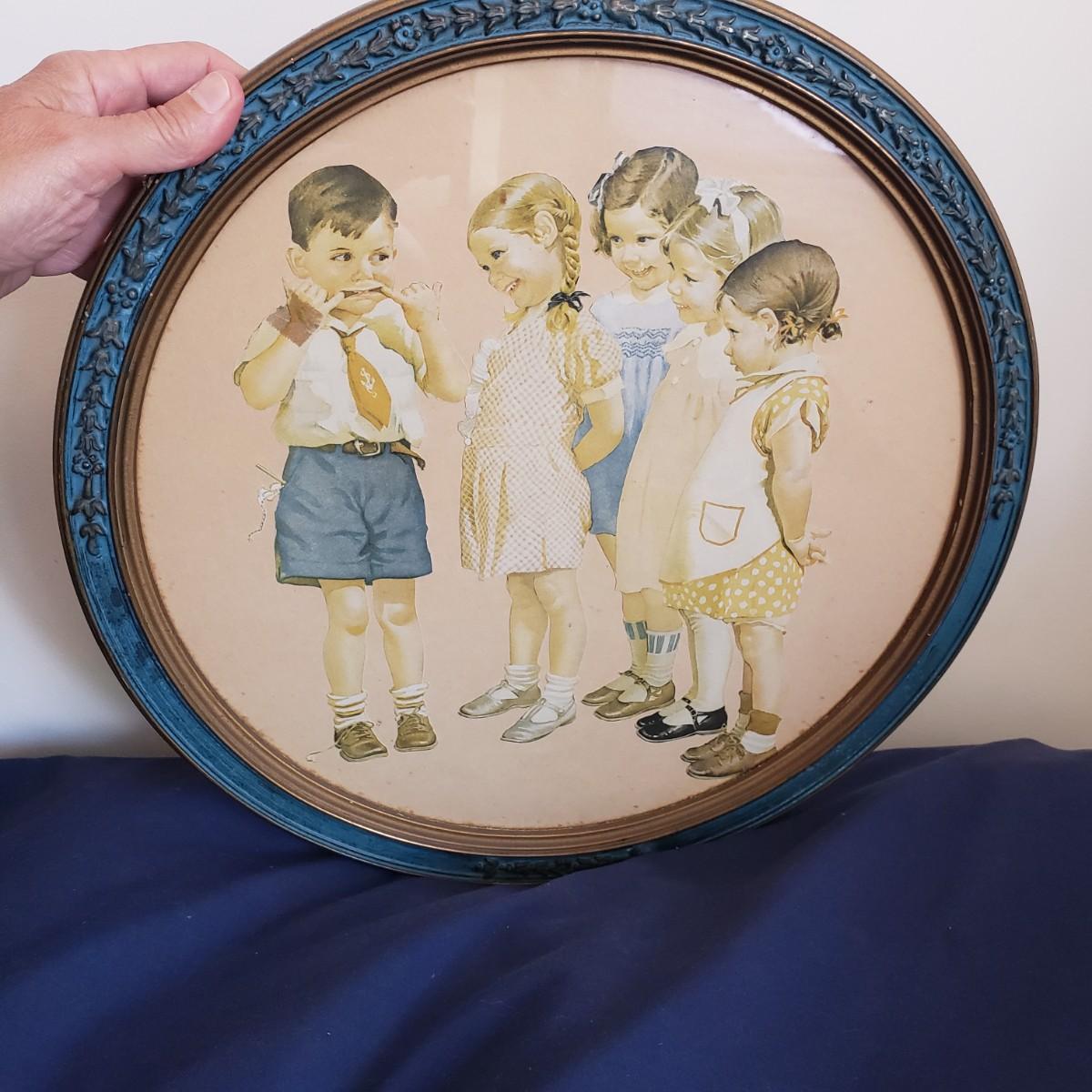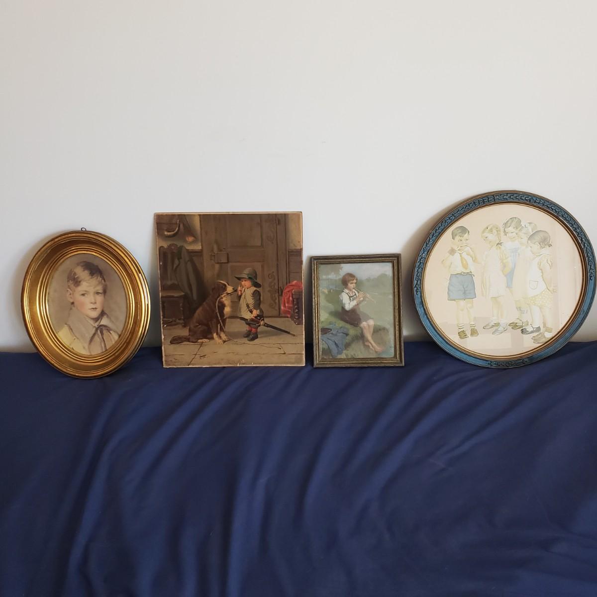 Four pieces of vintage artwork with a children's theme. The first circular piece (16") appears to have the children cut out and attached to the mat. The Spring Melody piece by Glucklich measures 8" x 10" and is in a wooden frame. The Attention Sir! Piece is on a hard cardboard like backing and measures 14" x 13". The last piece labeled Peter is in a gold frame that has some wear. All the pieces, except the Attention Sir are in glass frames.