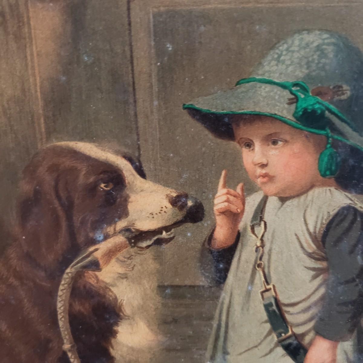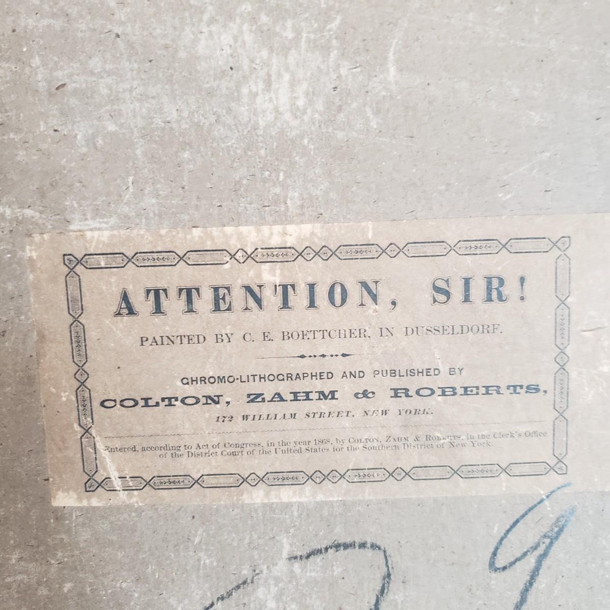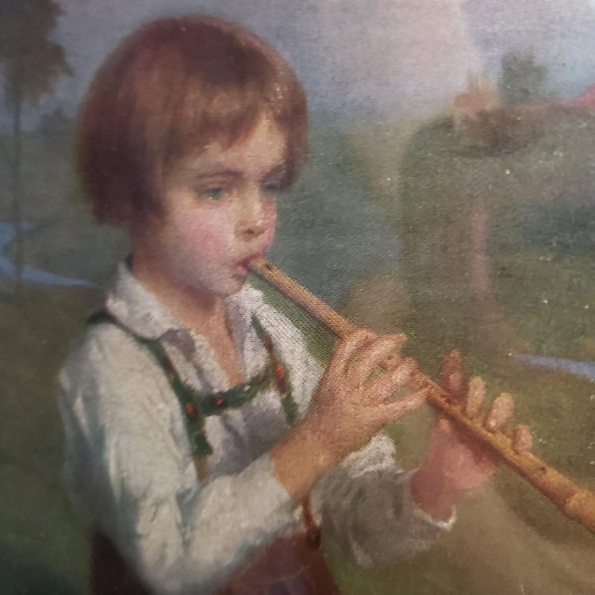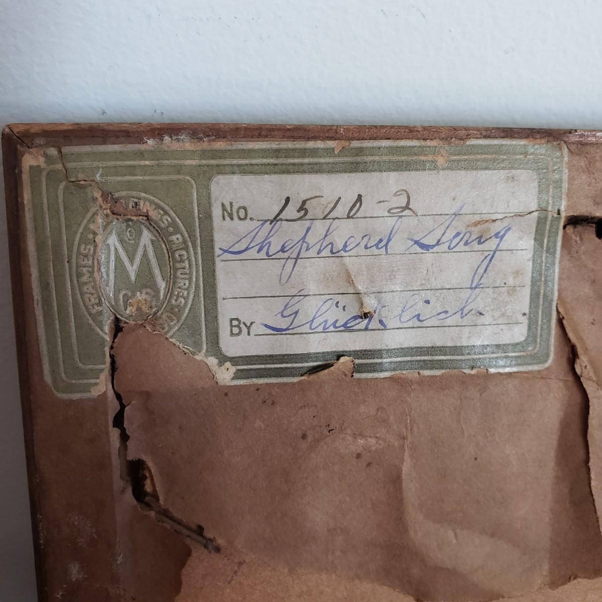 Four pieces of vintage artwork with a children's theme. The first circular piece (16") appears to have the children cut out and attached to the mat. The Spring Melody piece by Glucklich measures 8" x 10" and is in a wooden frame. The Attention Sir! Piece is on a hard cardboard like backing and measures 14" x 13". The last piece labeled Peter is in a gold frame that has some wear. All the pieces, except the Attention Sir are in glass frames.