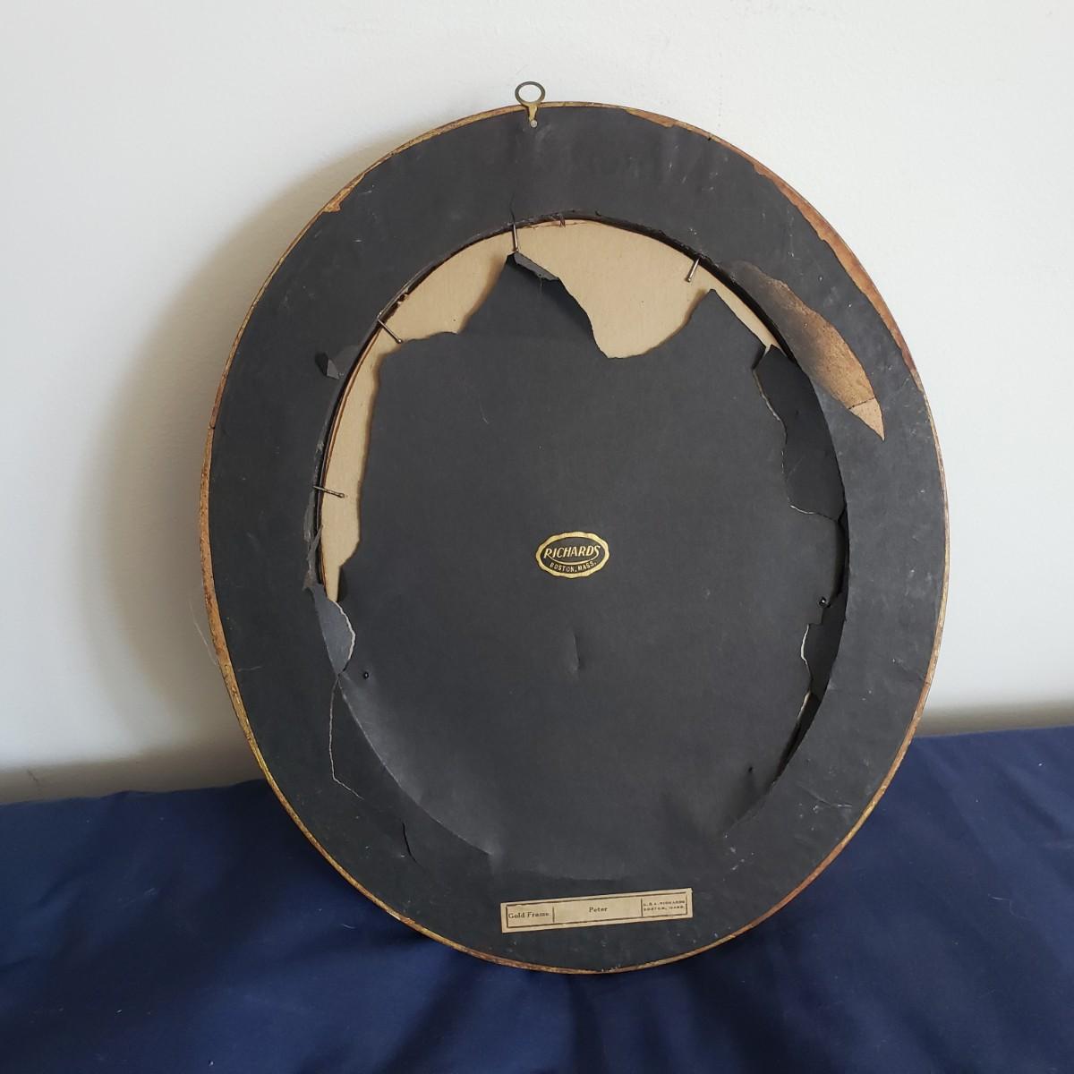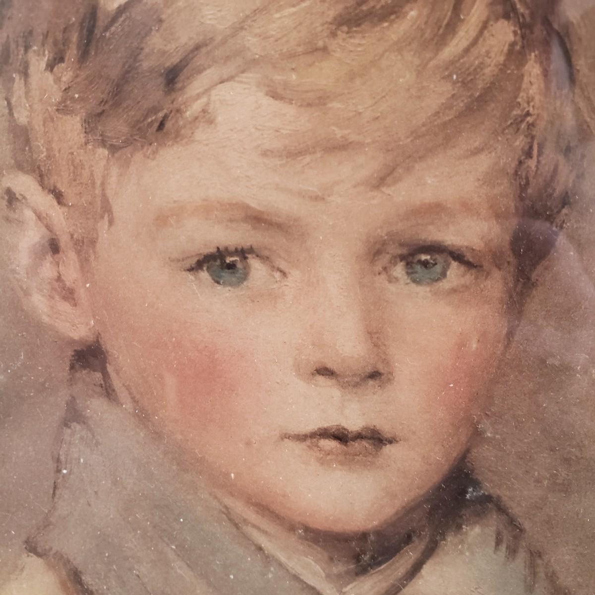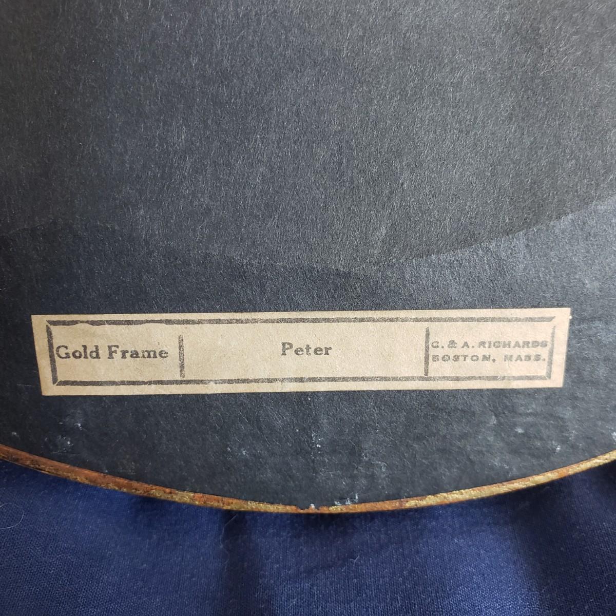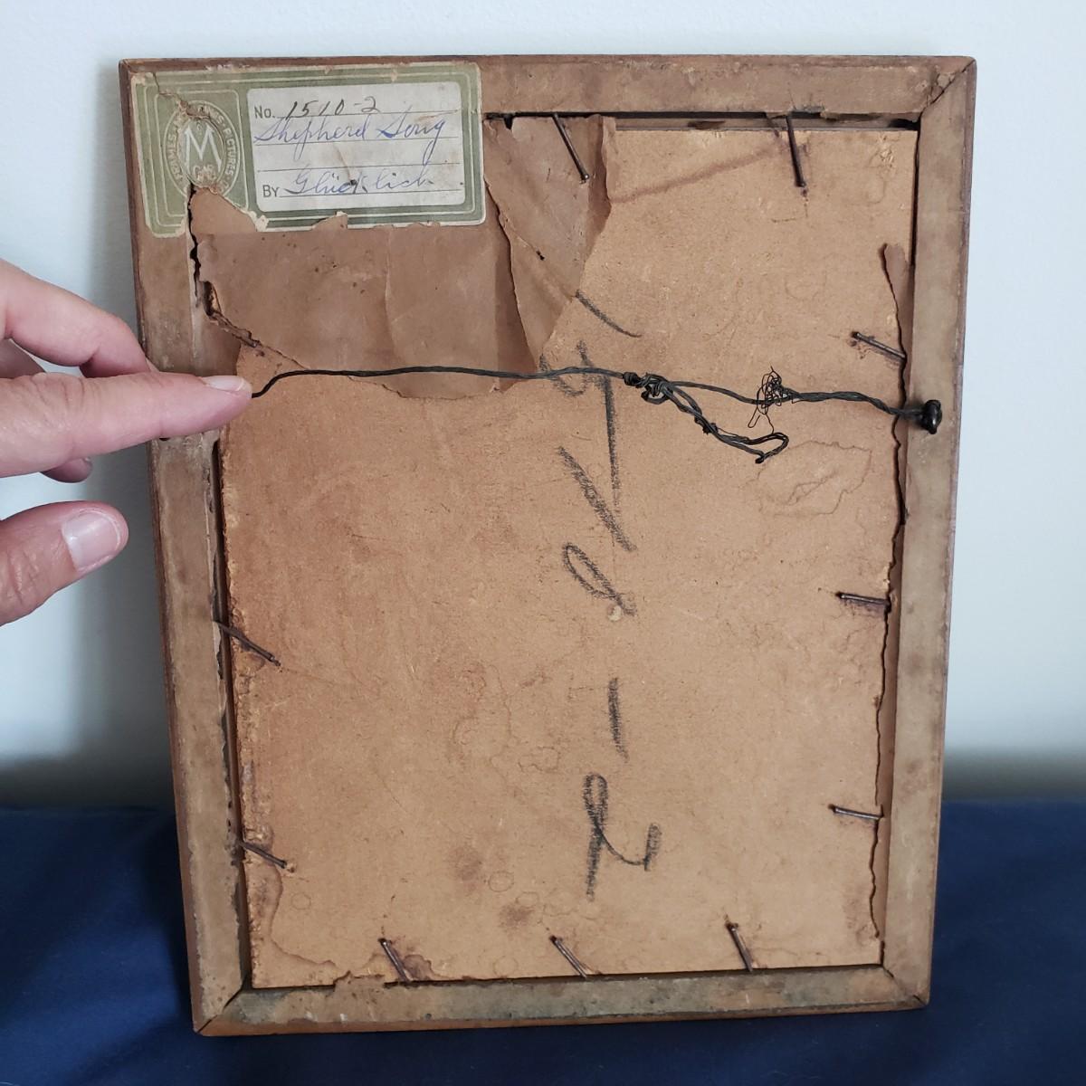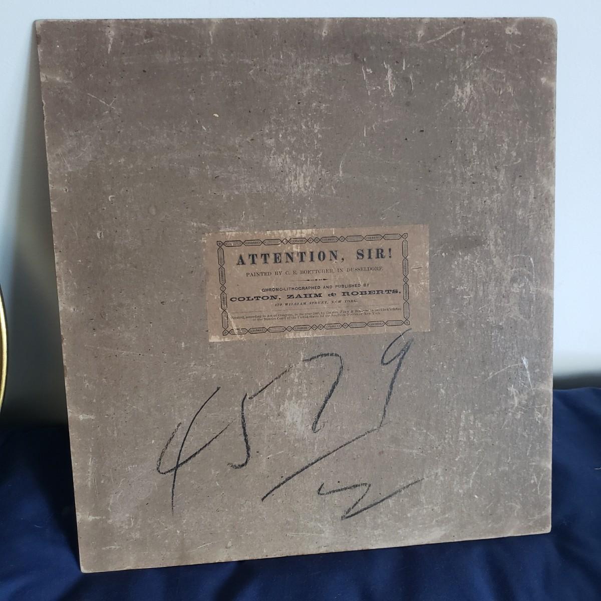 Four pieces of vintage artwork with a children's theme. The first circular piece (16") appears to have the children cut out and attached to the mat. The Spring Melody piece by Glucklich measures 8" x 10" and is in a wooden frame. The Attention Sir! Piece is on a hard cardboard like backing and measures 14" x 13". The last piece labeled Peter is in a gold frame that has some wear. All the pieces, except the Attention Sir are in glass frames.