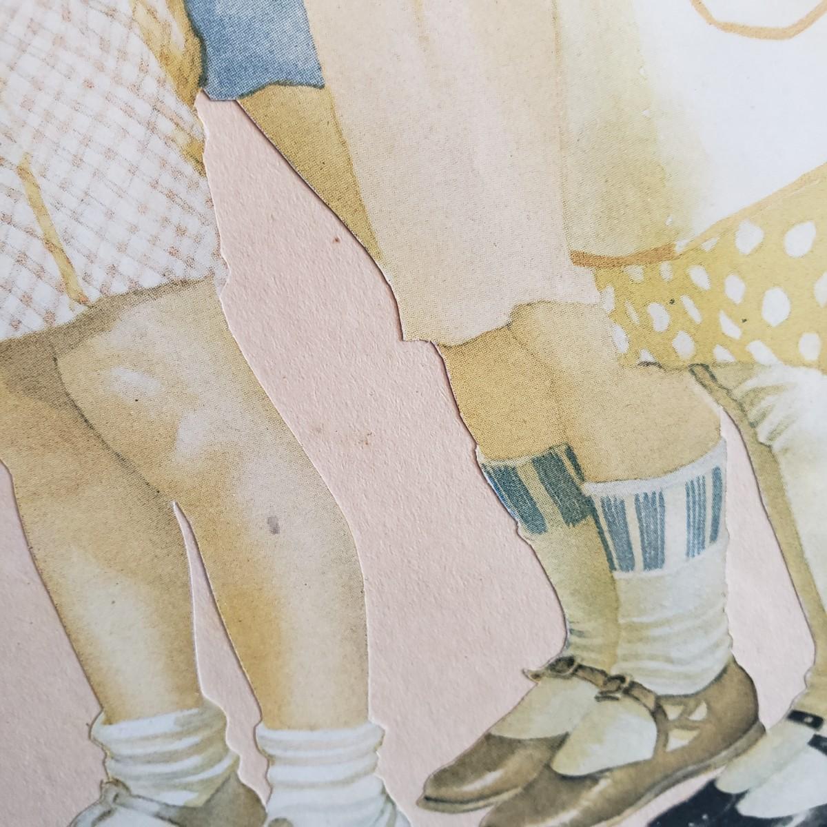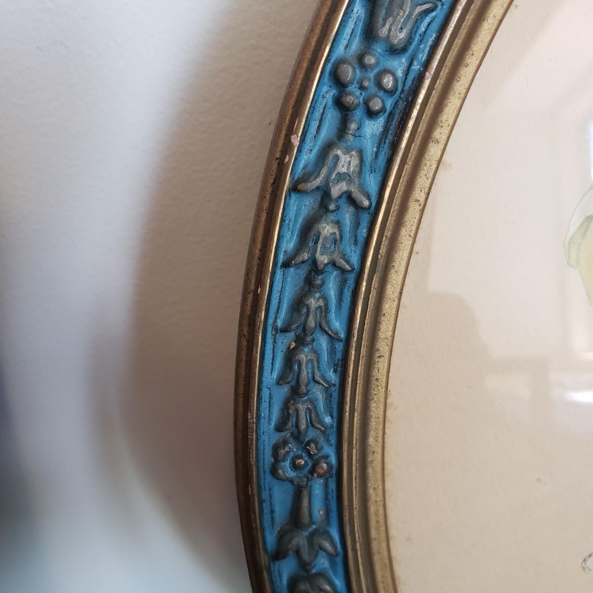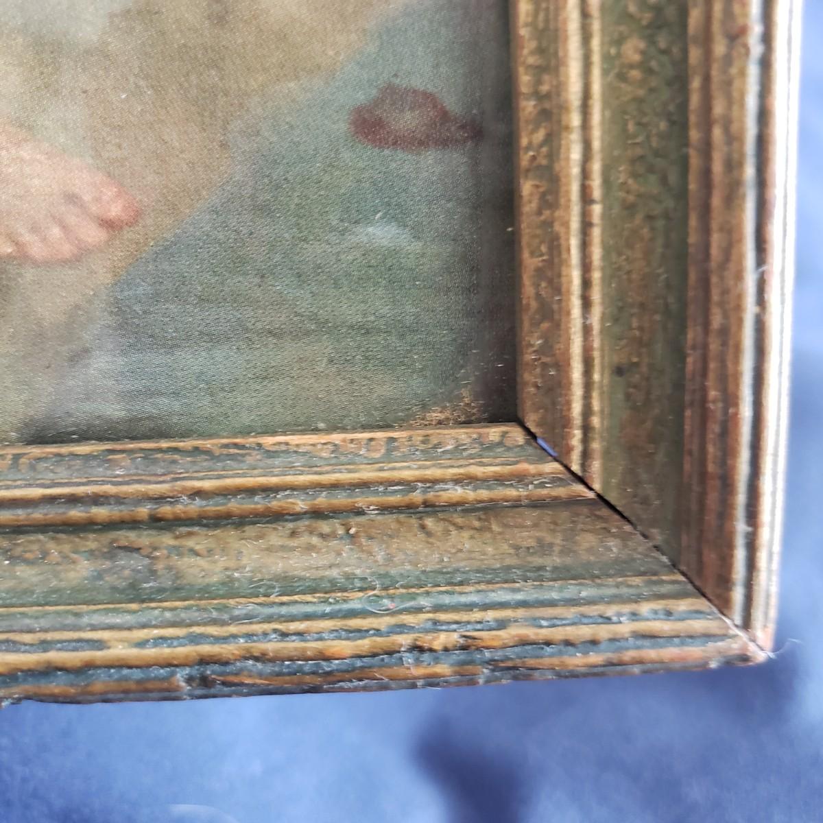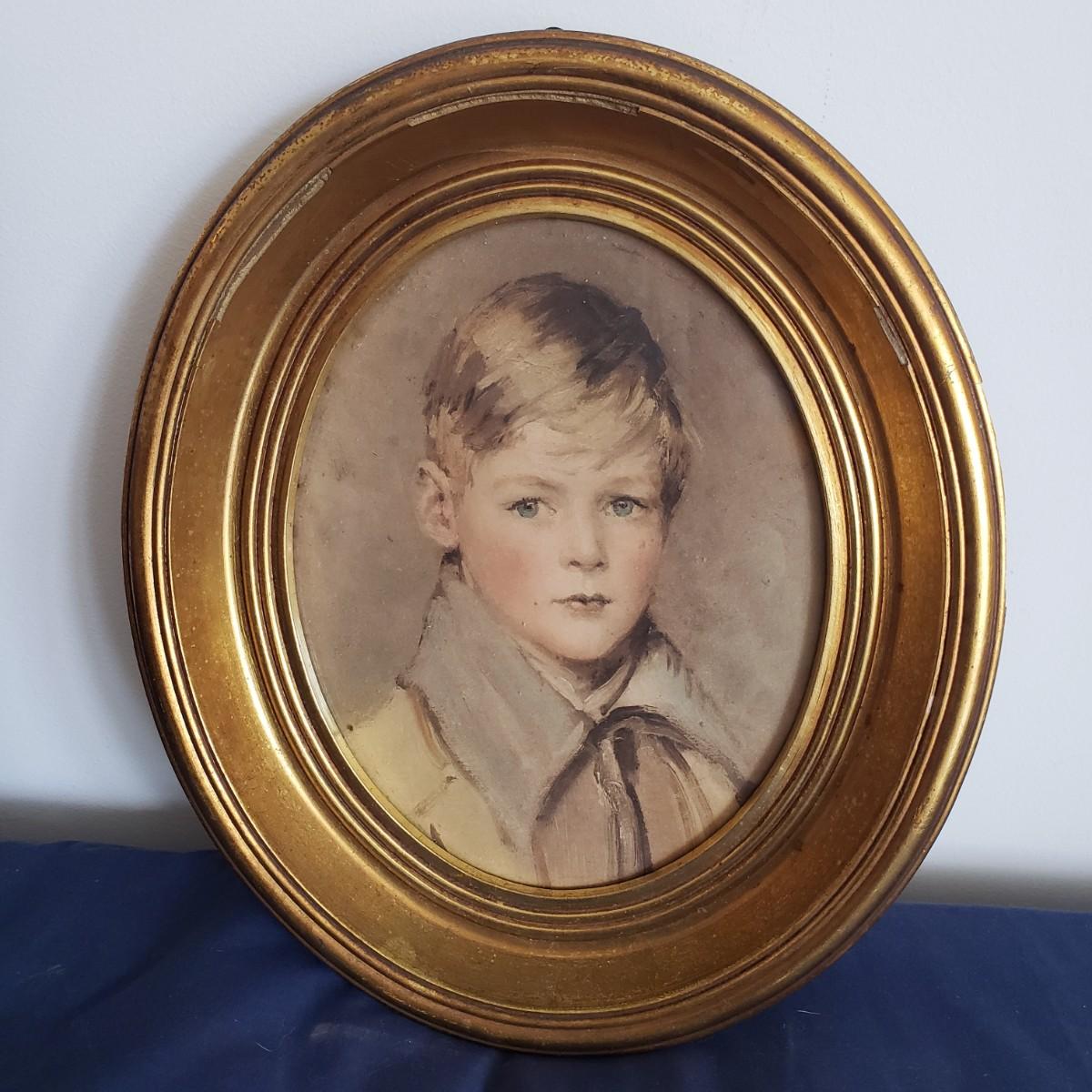 Four pieces of vintage artwork with a children's theme. The first circular piece (16") appears to have the children cut out and attached to the mat. The Spring Melody piece by Glucklich measures 8" x 10" and is in a wooden frame. The Attention Sir! Piece is on a hard cardboard like backing and measures 14" x 13". The last piece labeled Peter is in a gold frame that has some wear. All the pieces, except the Attention Sir are in glass frames.