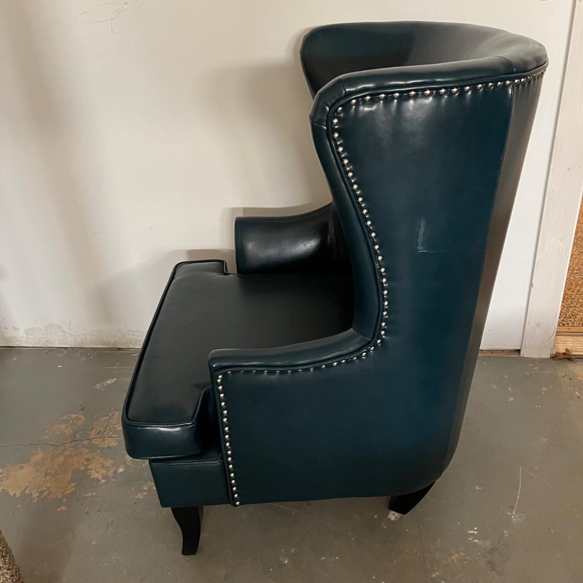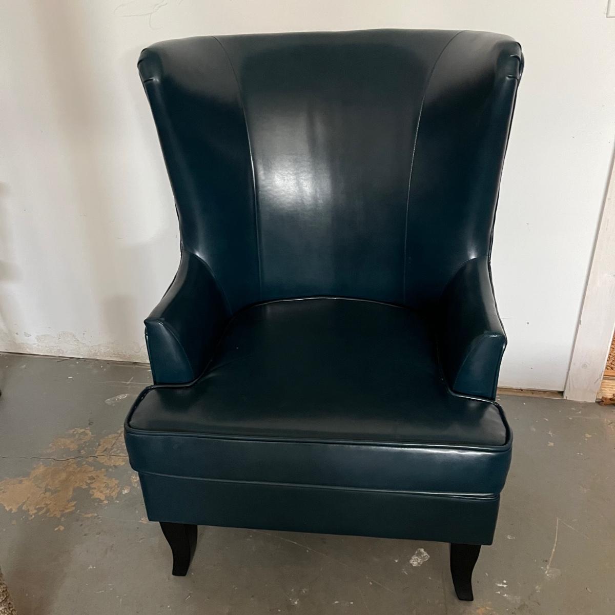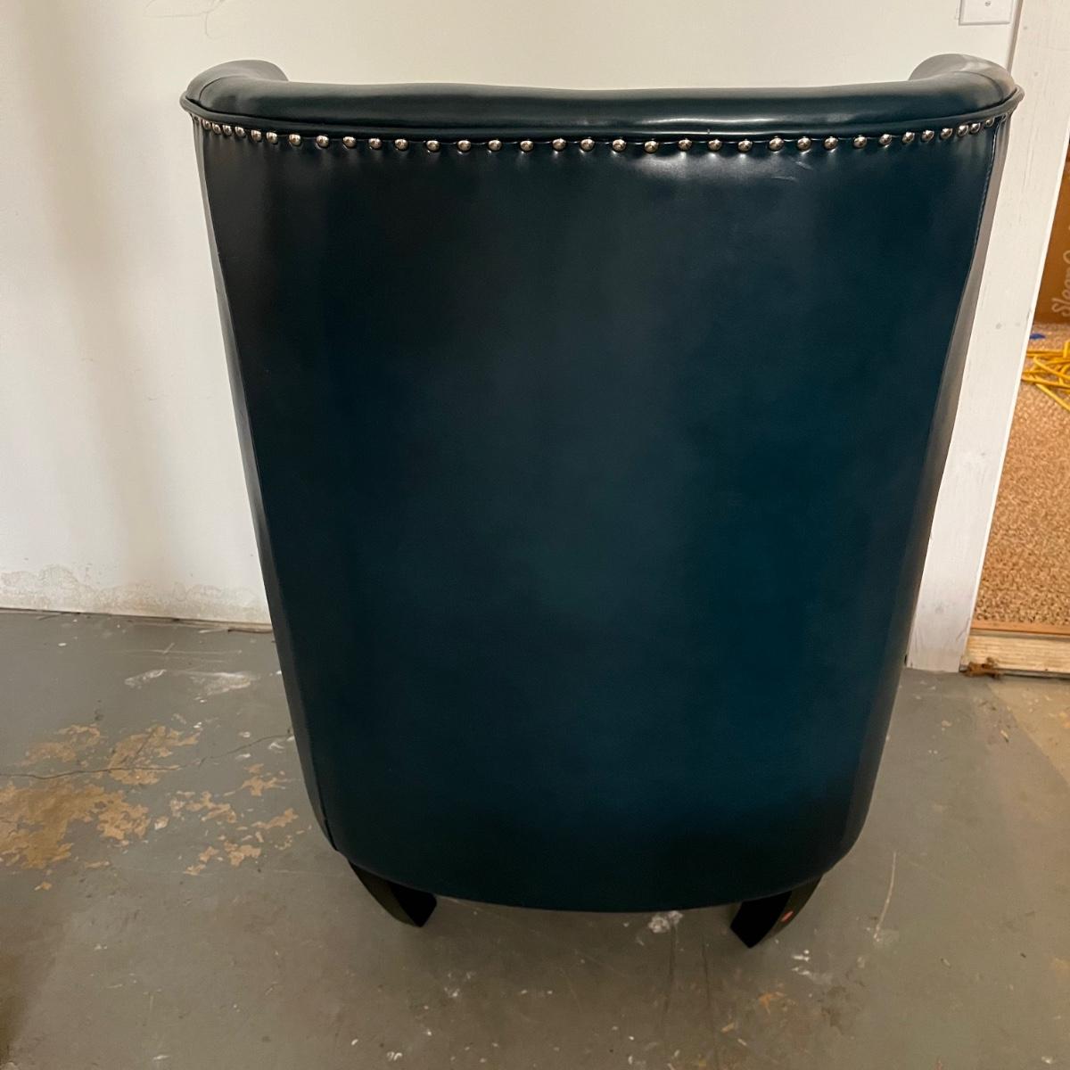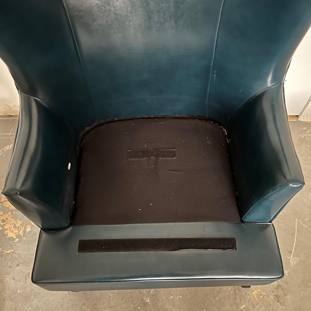 Lot includes a hi back wing chair in what appears to be vinyl with metal tacks. Chair measures 29” x 29” x 41” with a seat height of 18”. Chair has one scrape on side, see pictures.
