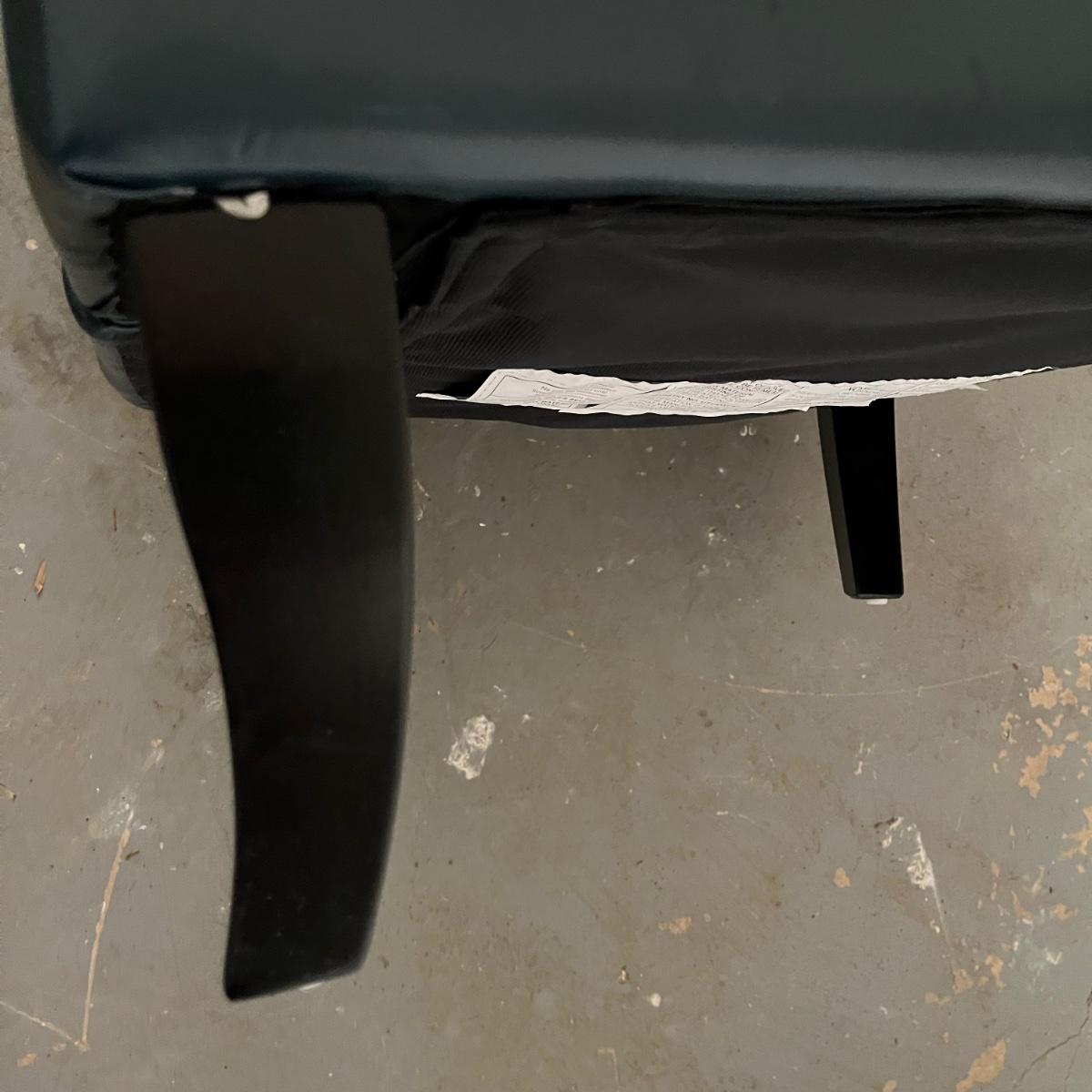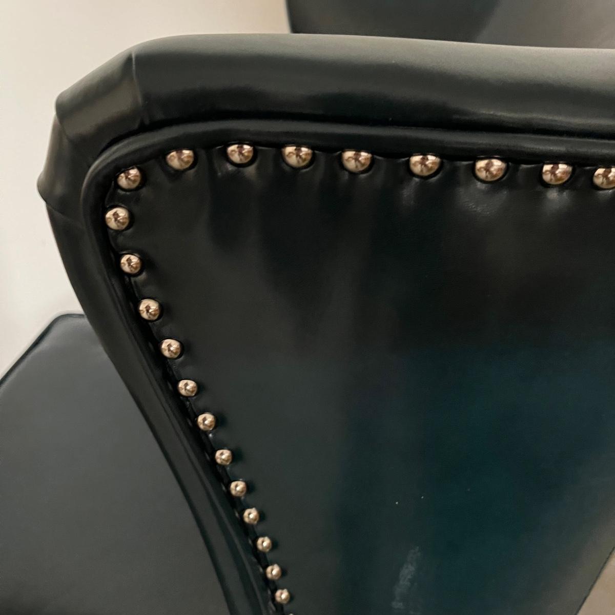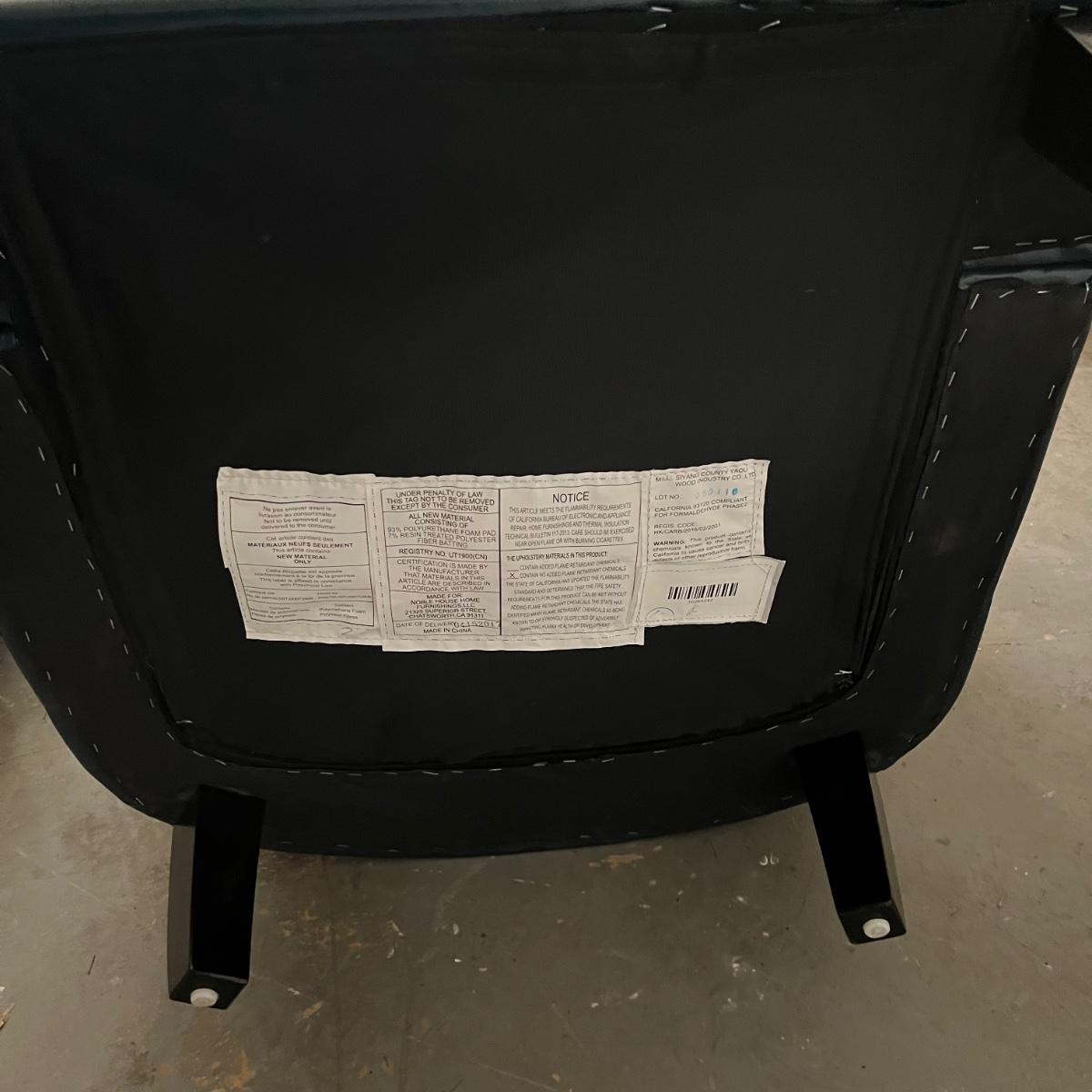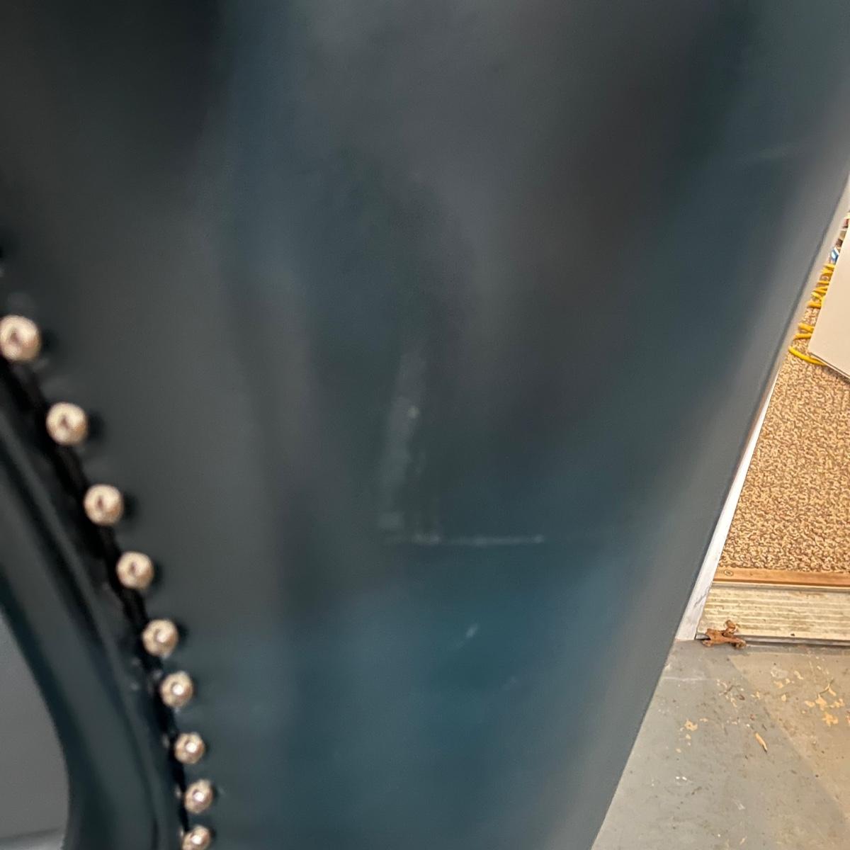 Lot includes a hi back wing chair in what appears to be vinyl with metal tacks. Chair measures 29” x 29” x 41” with a seat height of 18”. Chair has one scrape on side, see pictures.