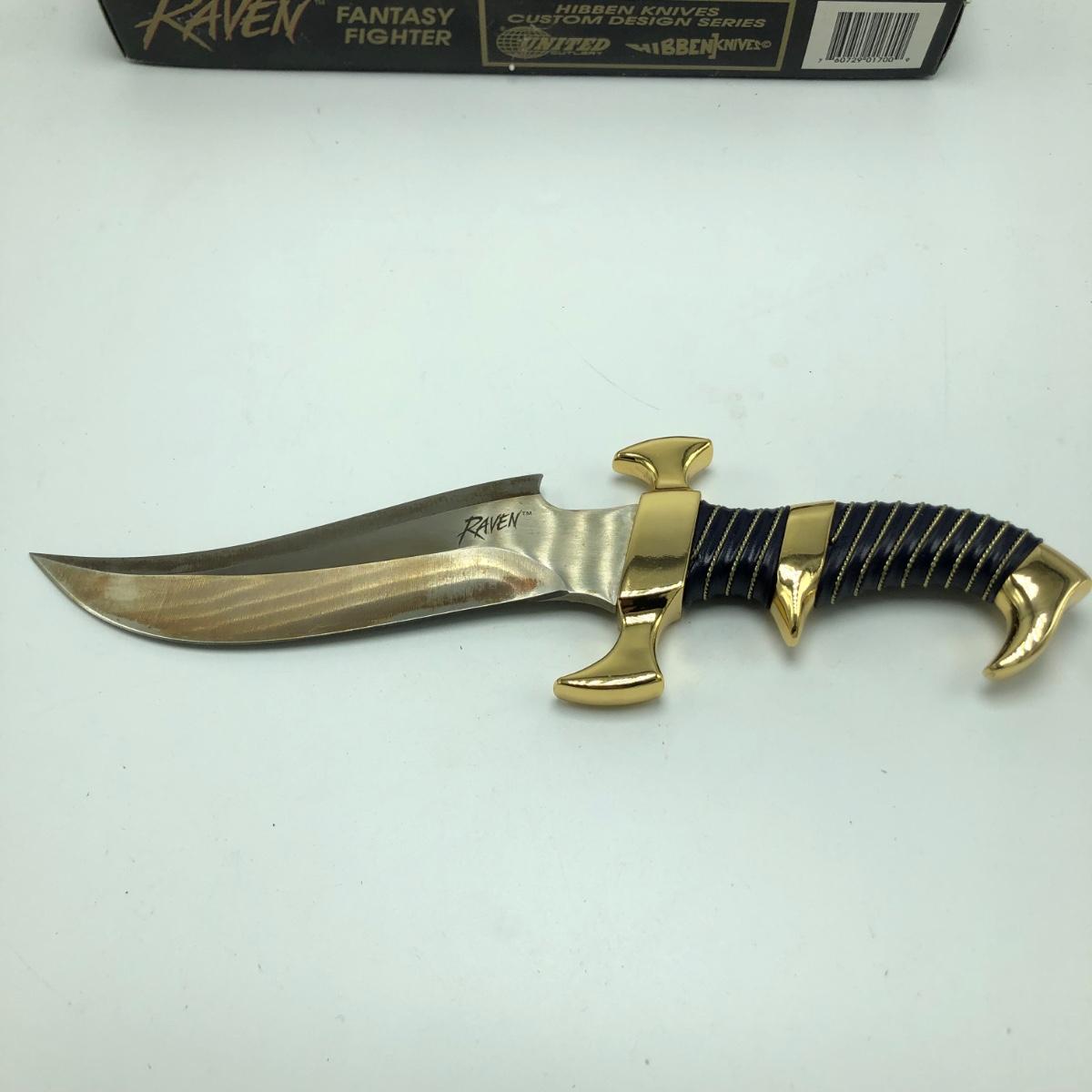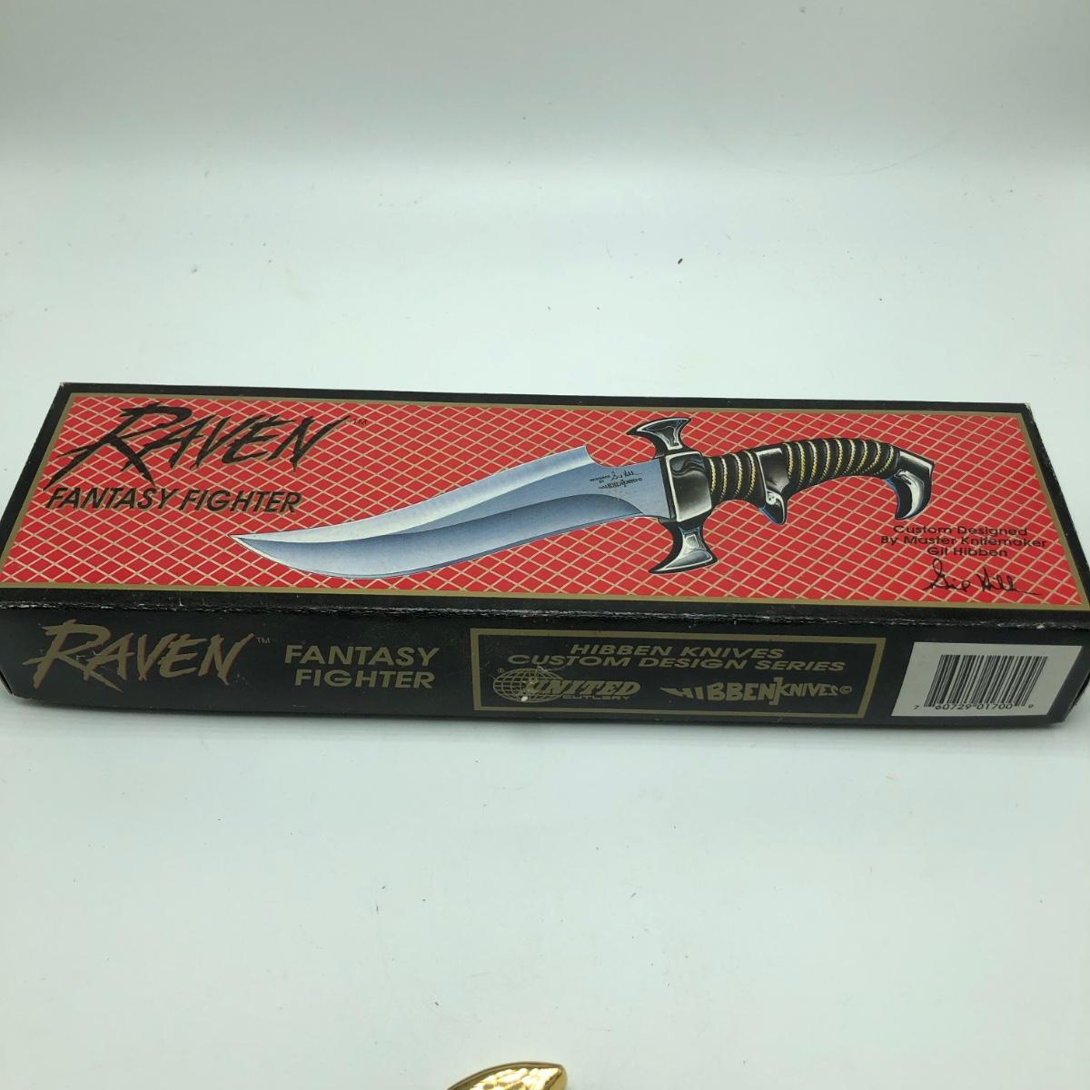 Lot includes a Hibben Raven UC 700-G Fantasy Fighter knife #929/1000. Knife measures 13” long. Blade has discoloration and handle is a black plastic. See pictures.