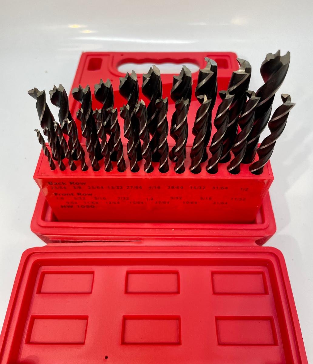 Hickory 25 Bit Brad Point Drill Set, sizes range from 1/8 to 1/2 in 1/64 increments