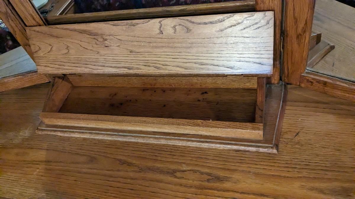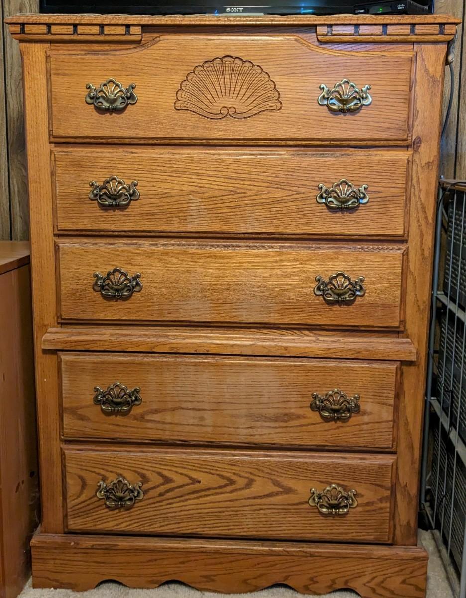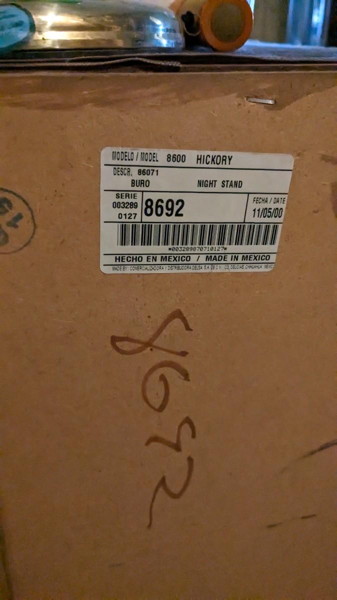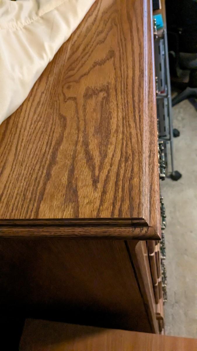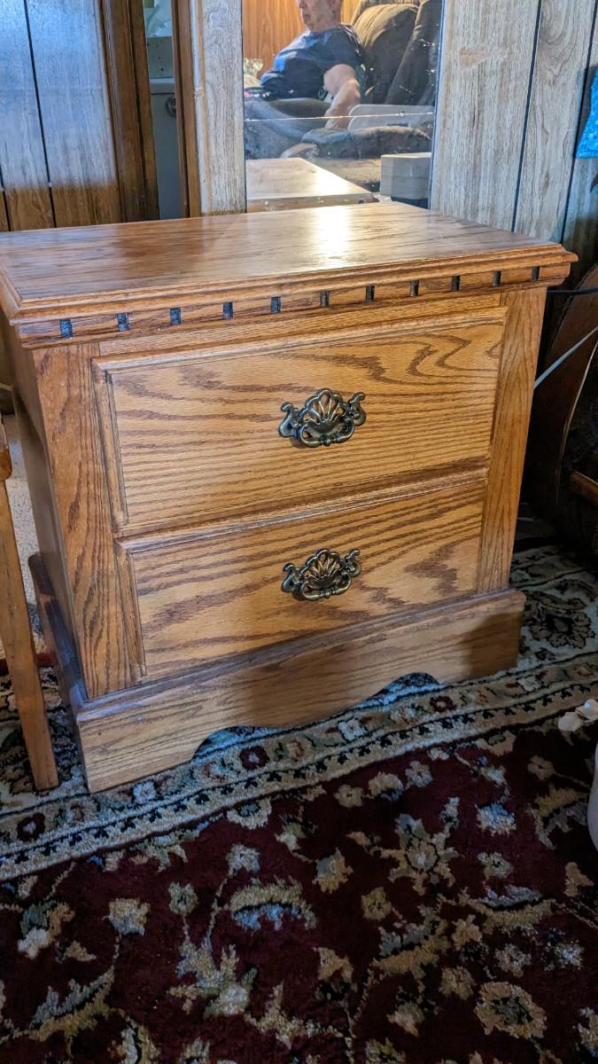 3 pieces, includes 64 1/8"x17.25"x32.5" low 8 drawer dresser with 50"x45" tri-fold mirror, and small 27"x7" lift box attached, note this is a 2 piece dresser. Also includes 35.25"x17.25"x50" matching 5 drawer dresser that shows some slight discoloration, as well as 25"x16"x24.5" nightstand.