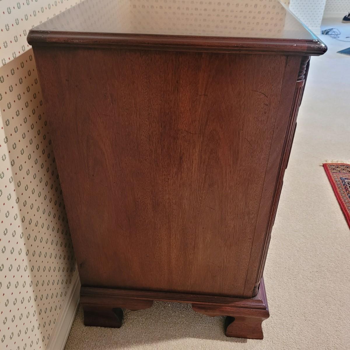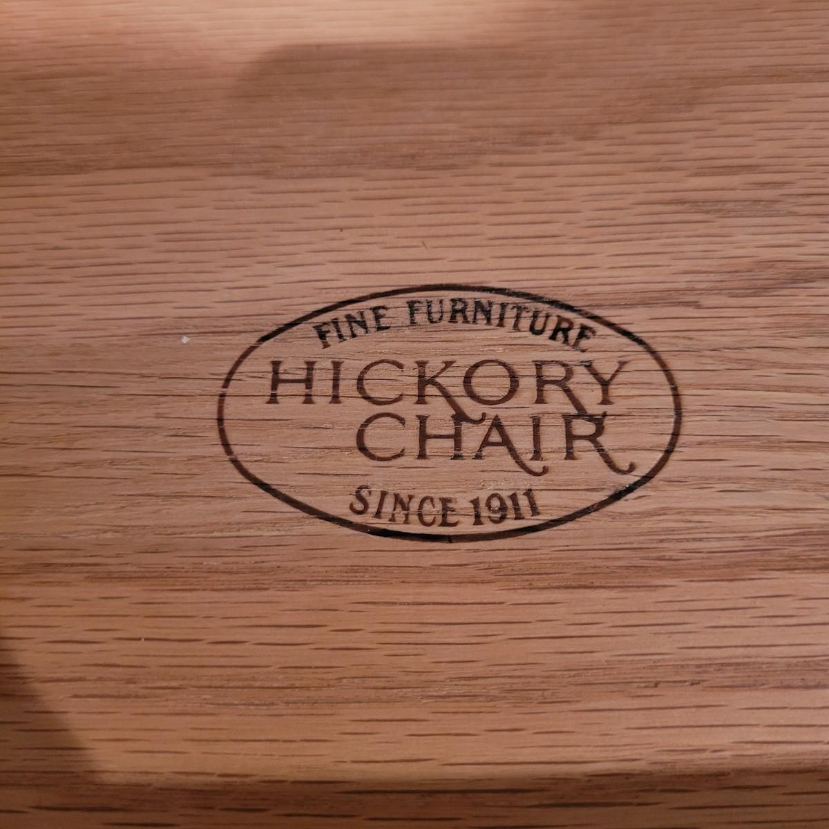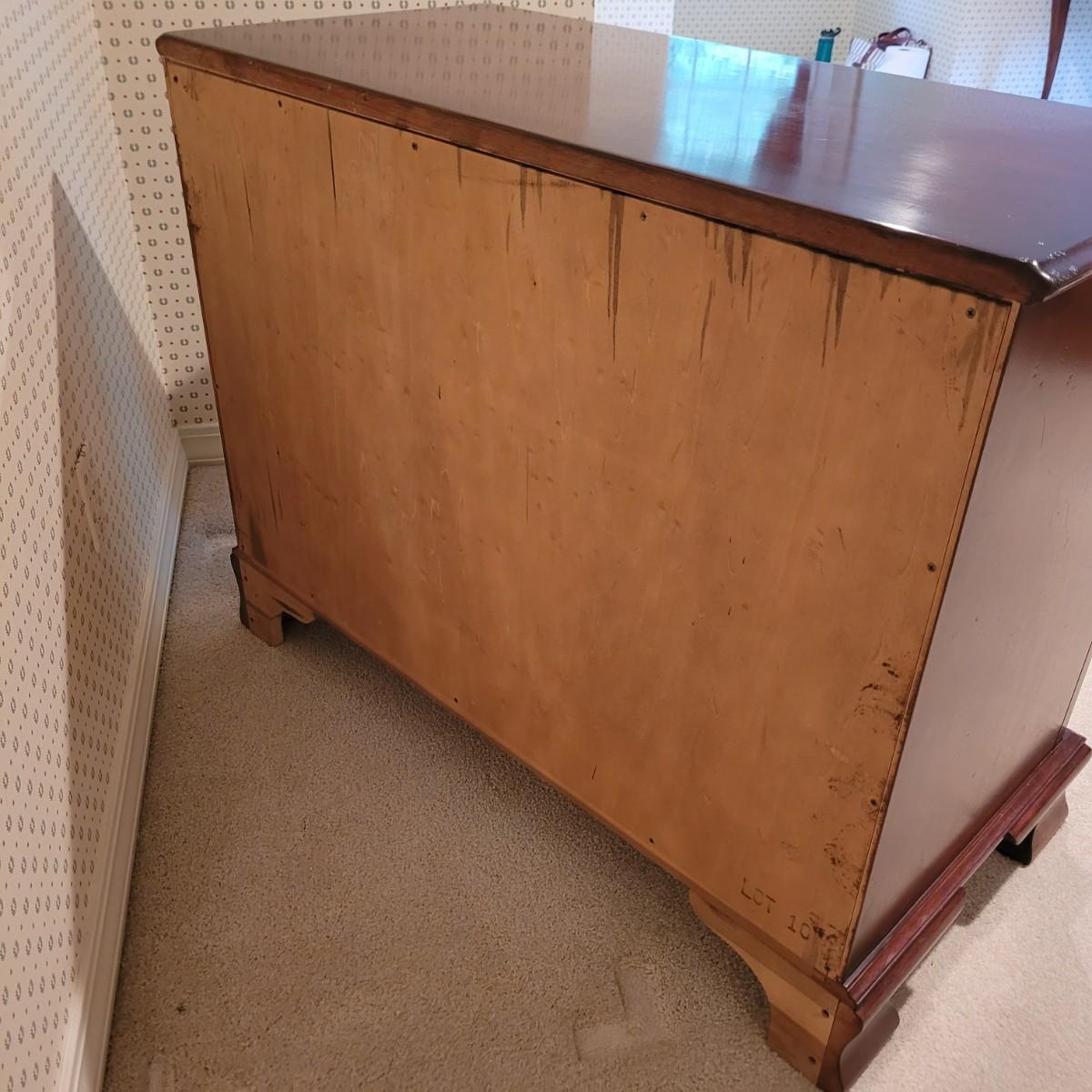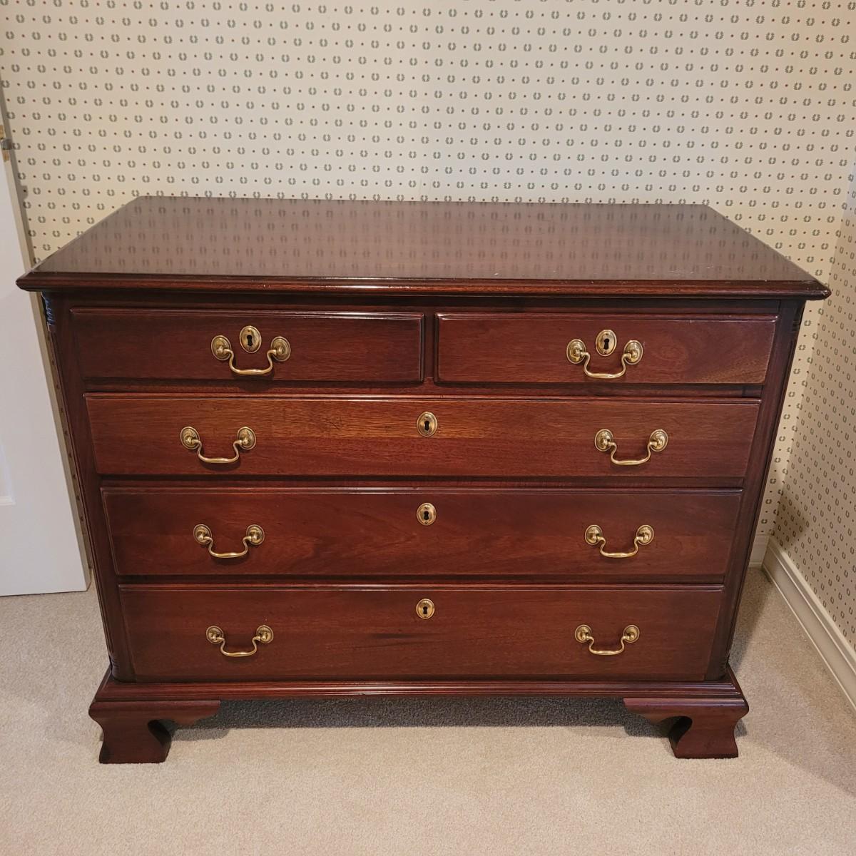 This solid wood five drawer dresser by Hickory Chair features dovetail joint drawers and brass hardware. Measures approximately 41” x 20” x 33”H. Local pickup only. Winning bidder must bring assistance to help move and load this item due to its weight and size. Dresser is located up one flight of stairs.