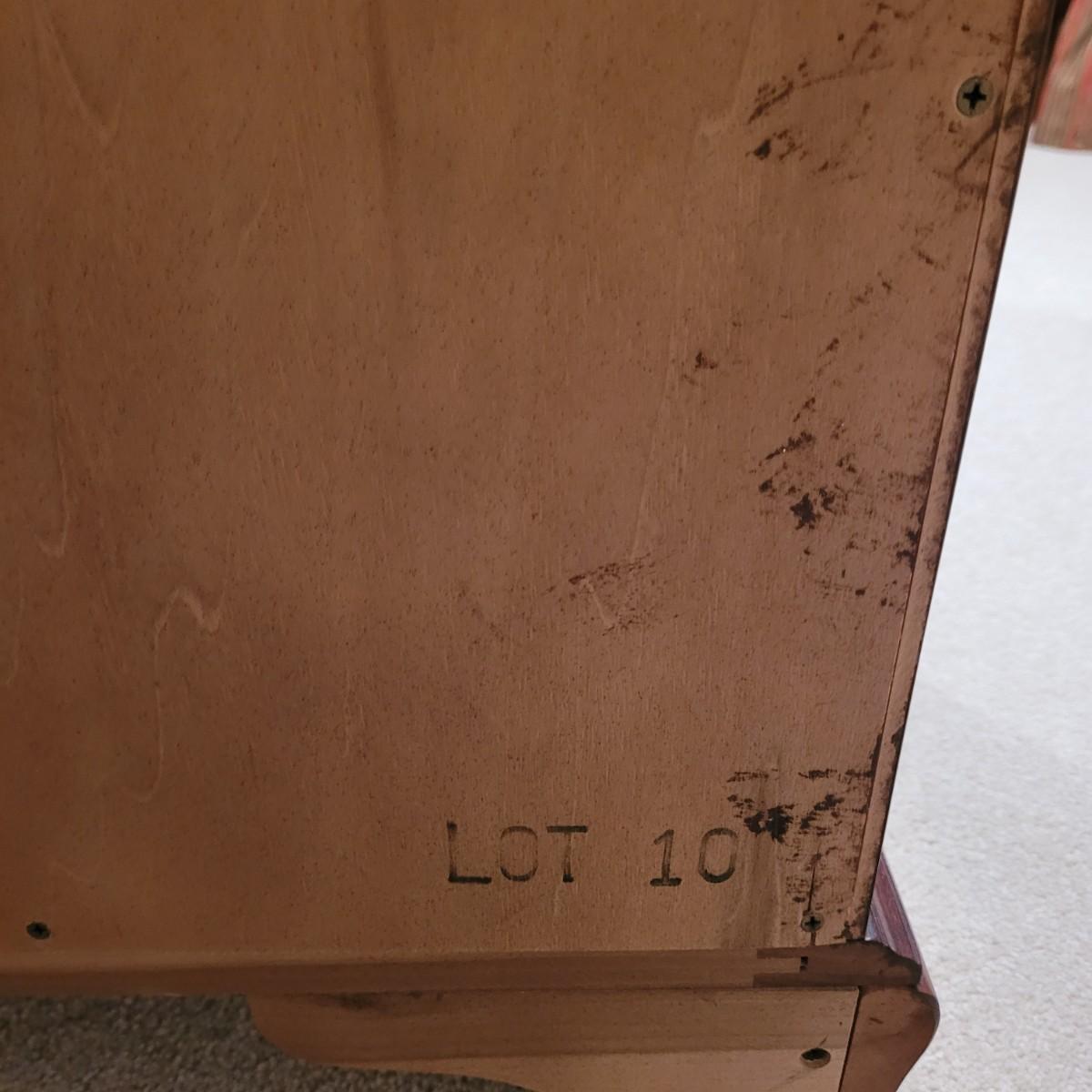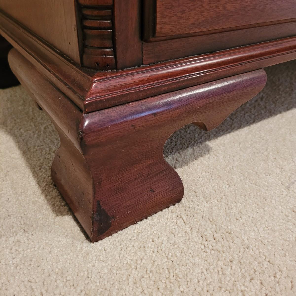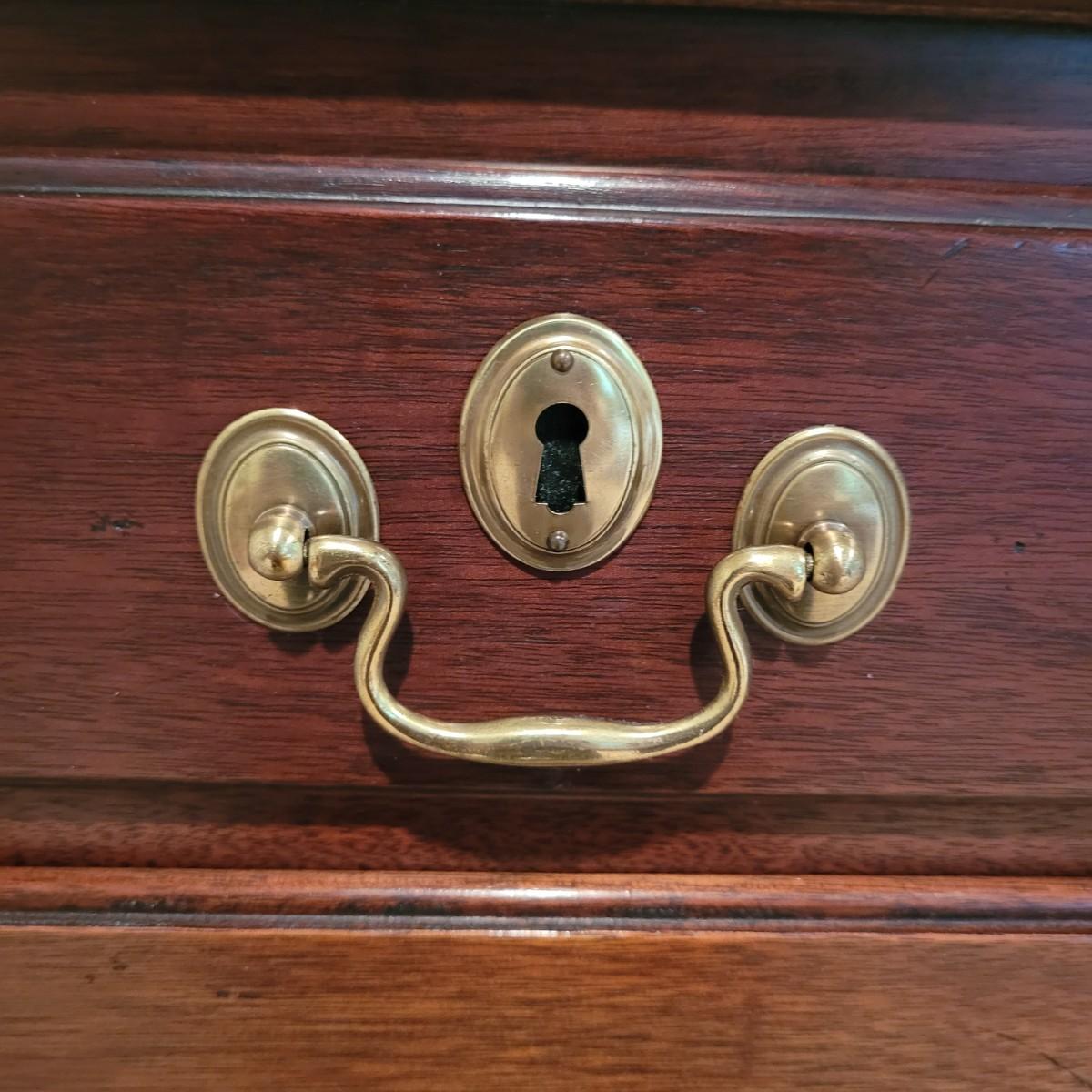 This solid wood five drawer dresser by Hickory Chair features dovetail joint drawers and brass hardware. Measures approximately 41” x 20” x 33”H. Local pickup only. Winning bidder must bring assistance to help move and load this item due to its weight and size. Dresser is located up one flight of stairs.