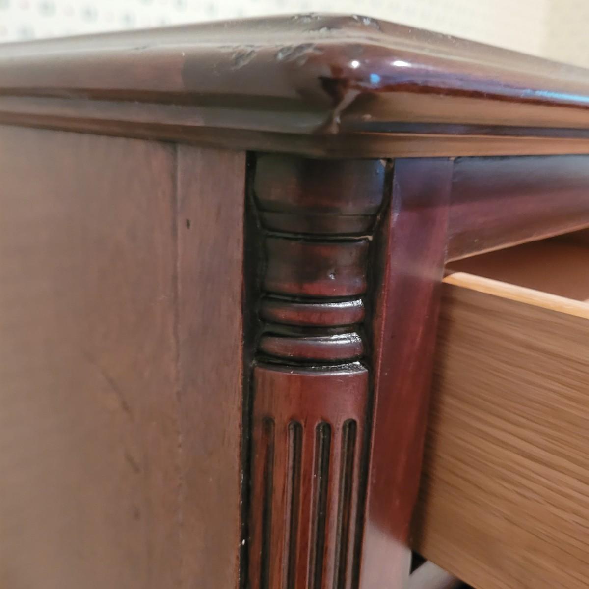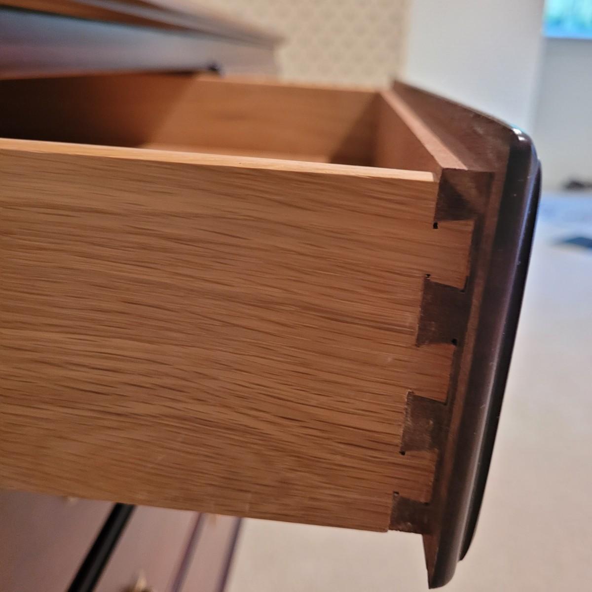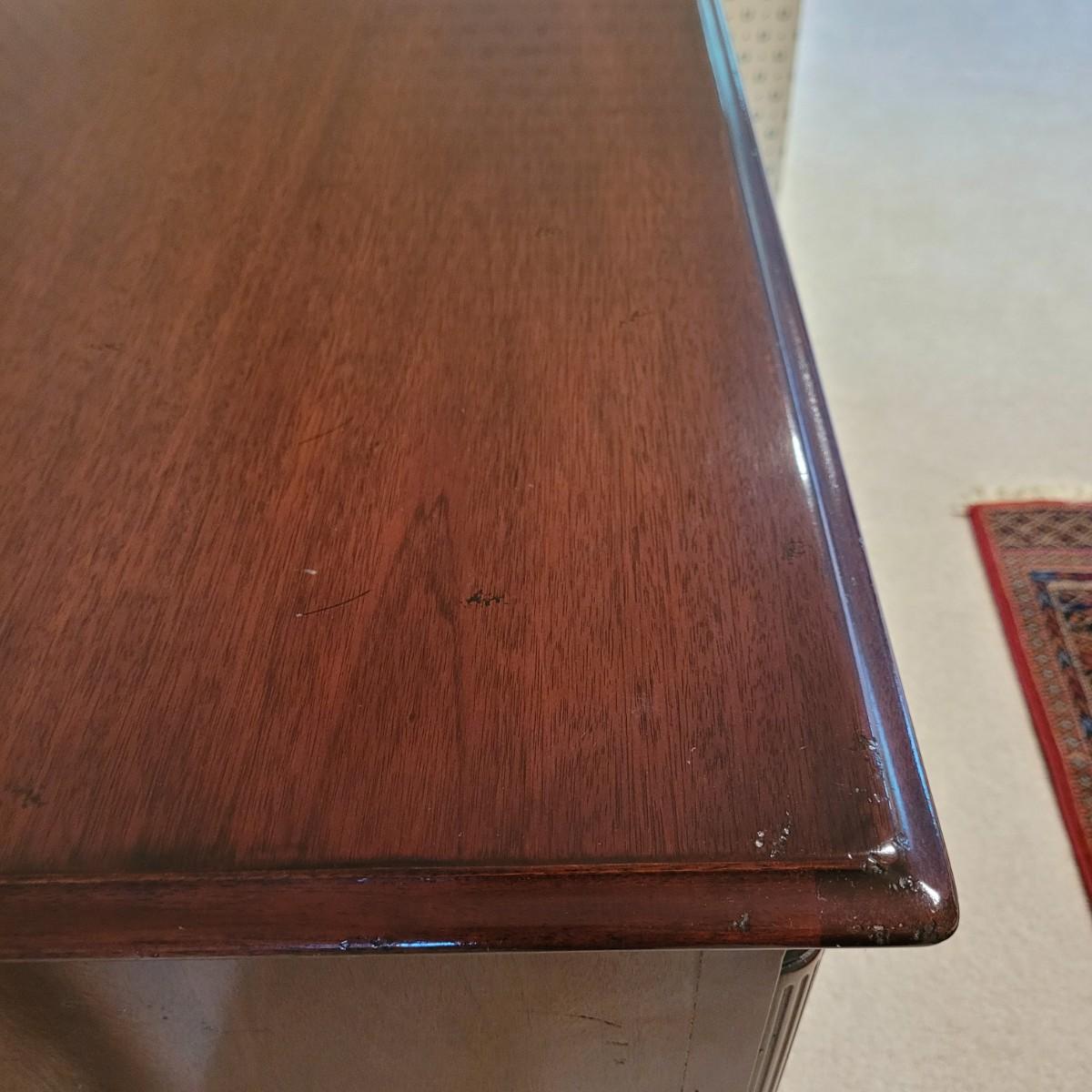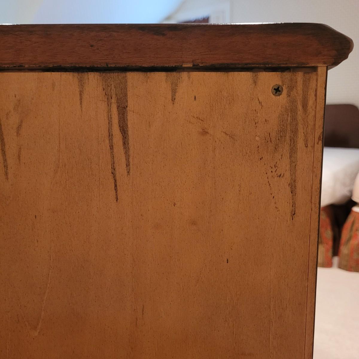 This solid wood five drawer dresser by Hickory Chair features dovetail joint drawers and brass hardware. Measures approximately 41” x 20” x 33”H. Local pickup only. Winning bidder must bring assistance to help move and load this item due to its weight and size. Dresser is located up one flight of stairs.