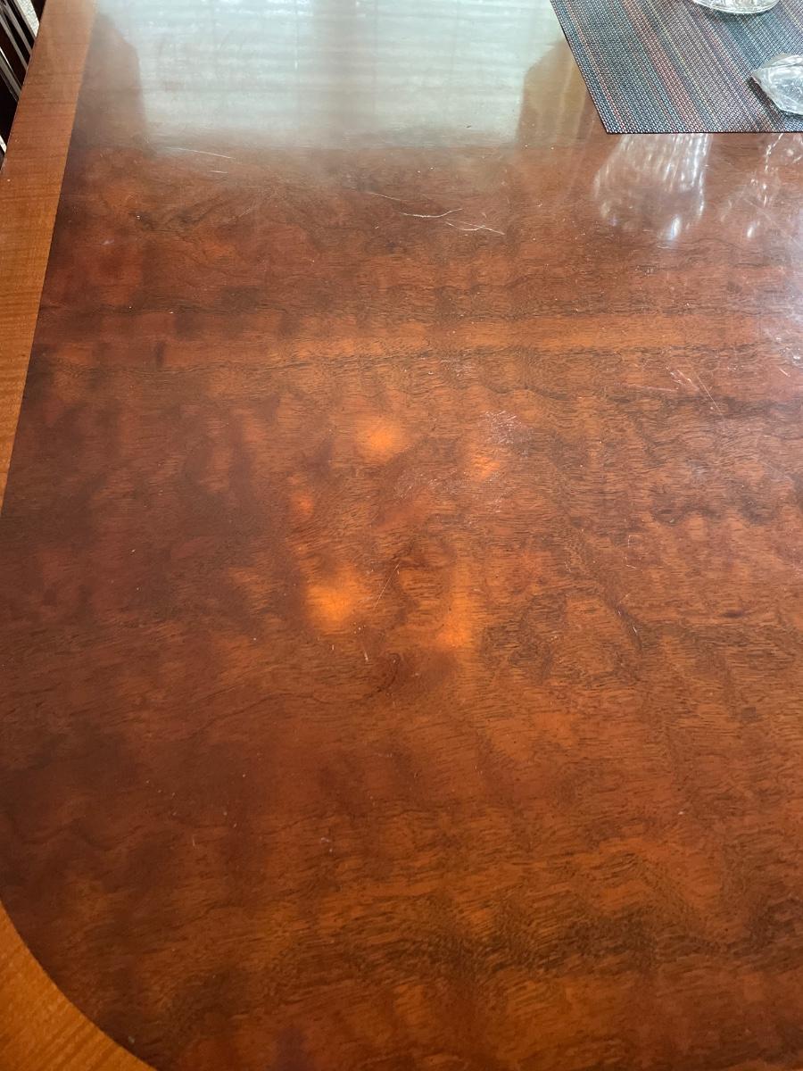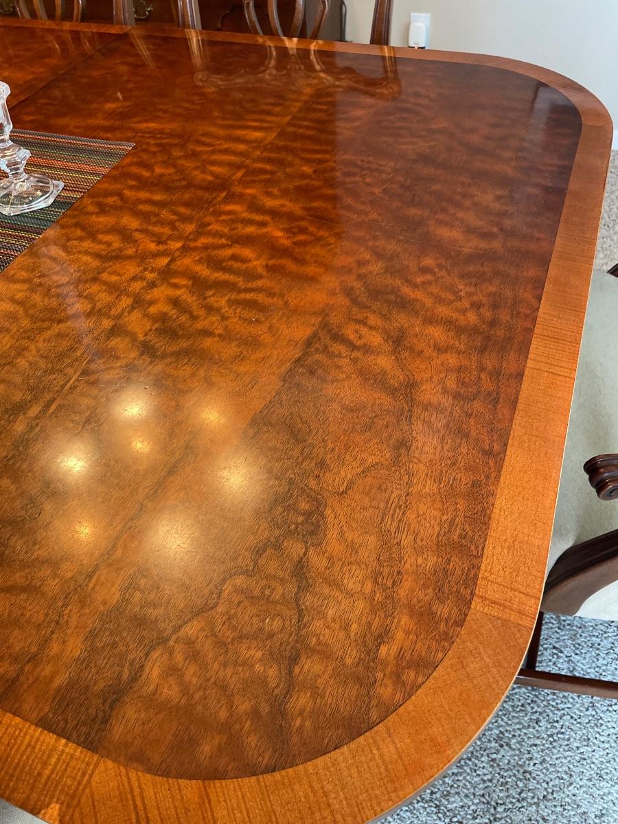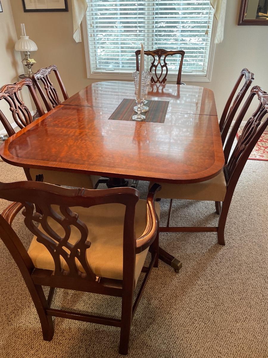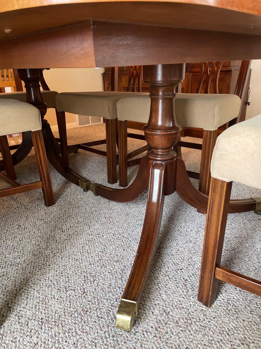 68” l x 44” w as the table is now in beautiful mahogany. Also includes another leaf.