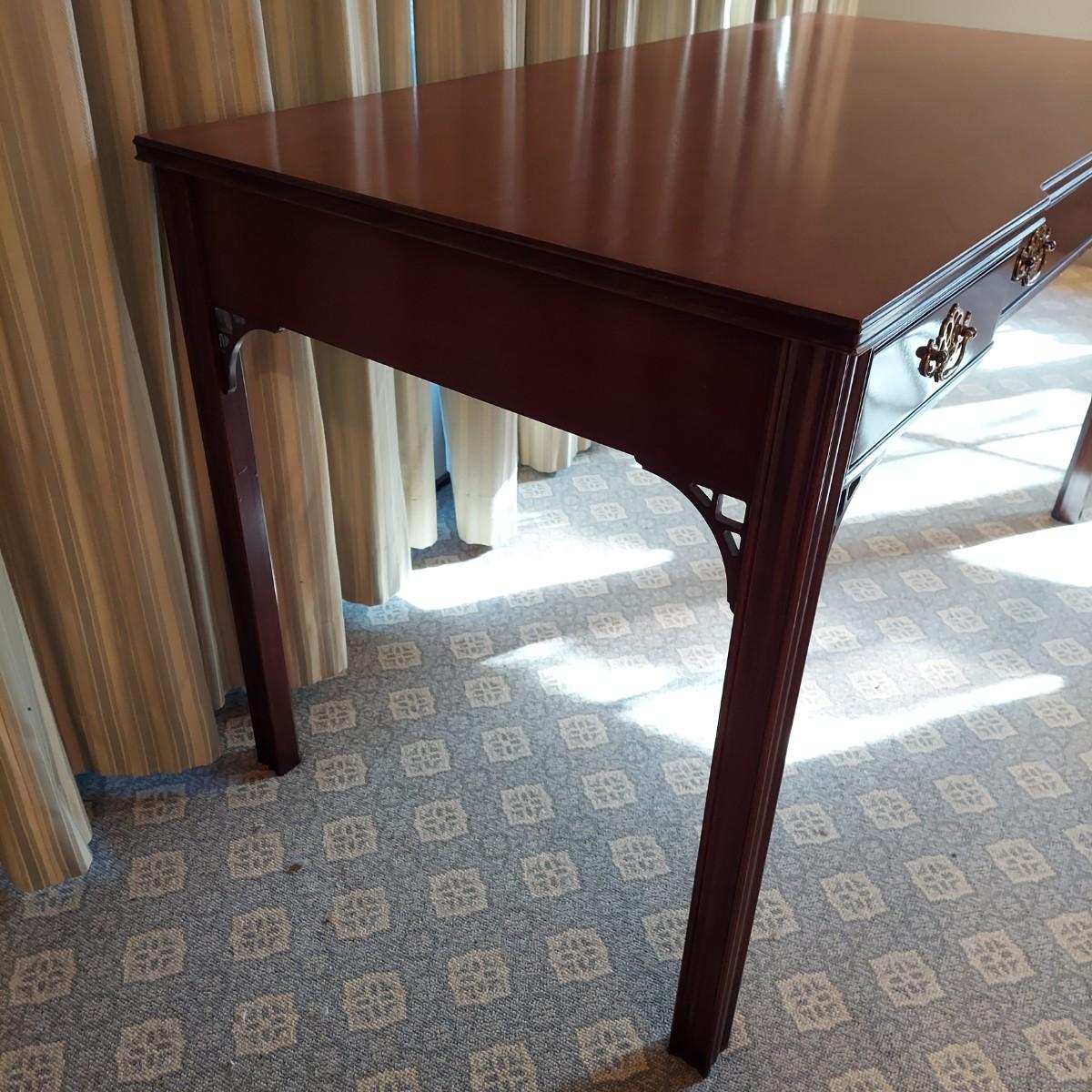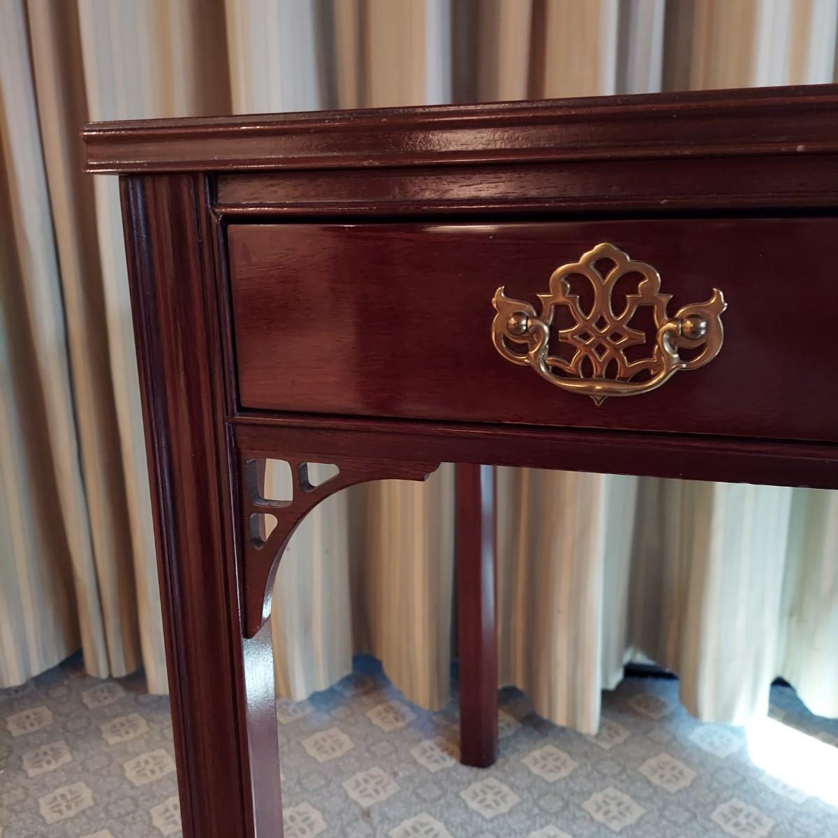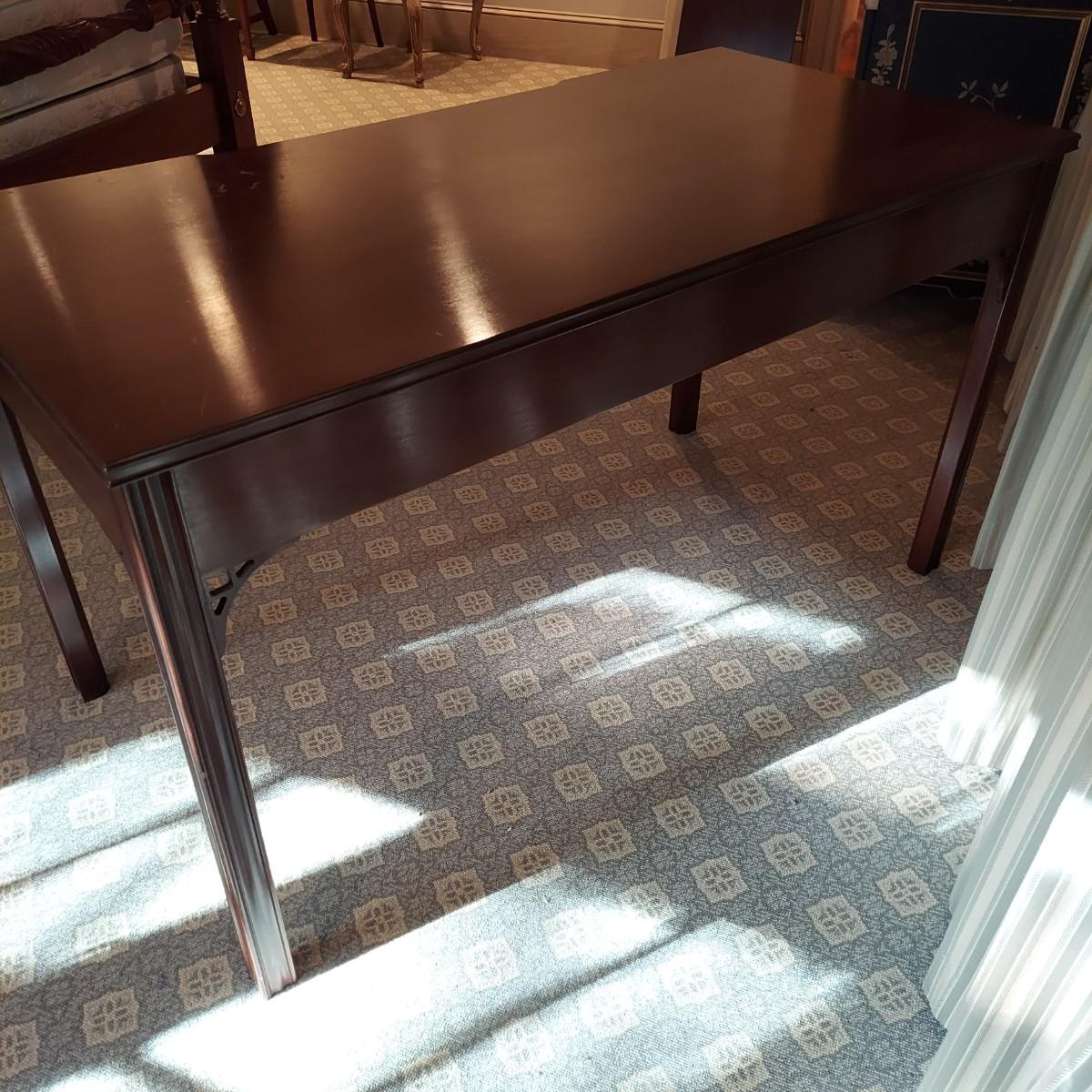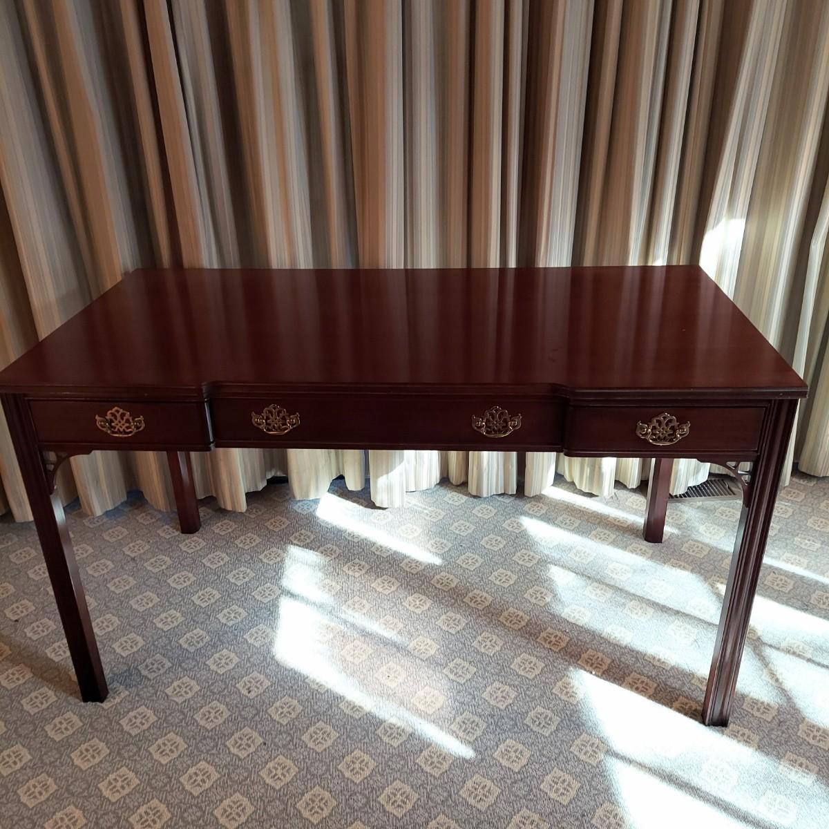 The American Masterpiece Collection by Hickory Furniture solid wood desk in darker finish with brass colored hardware and Chippendale style design elements. There are three dovetailed drawers. Piece measures 54" x 27" x 30"H. Local Pickup Only.