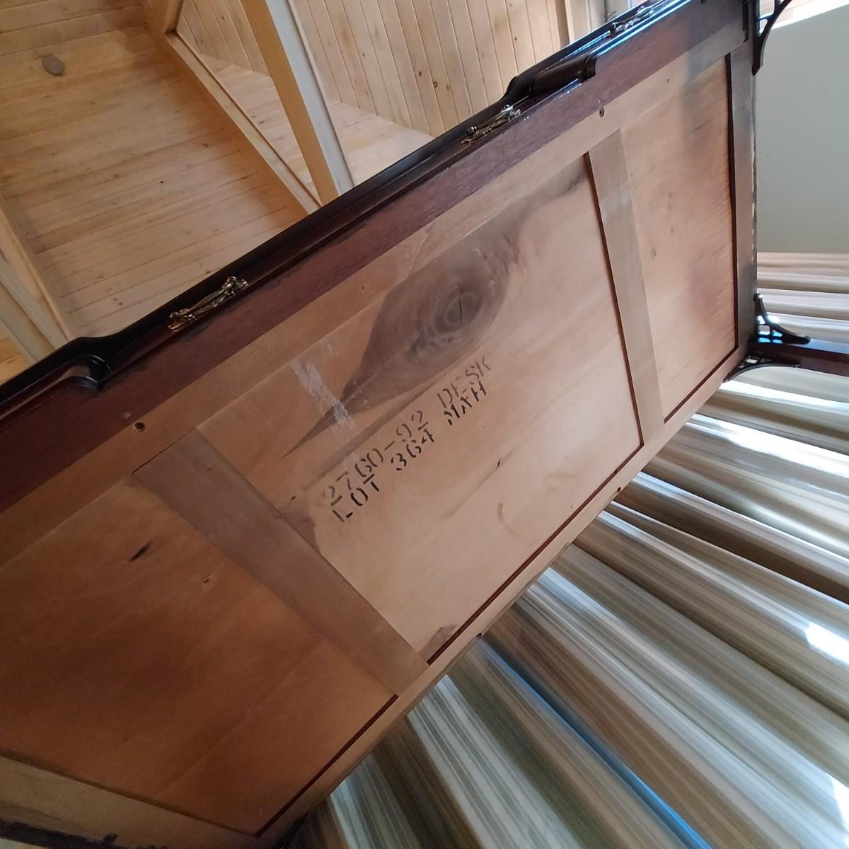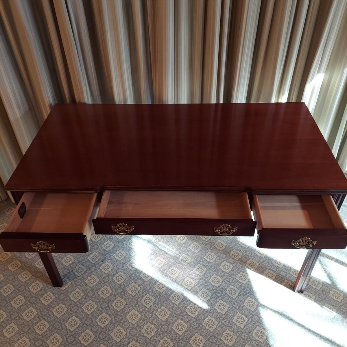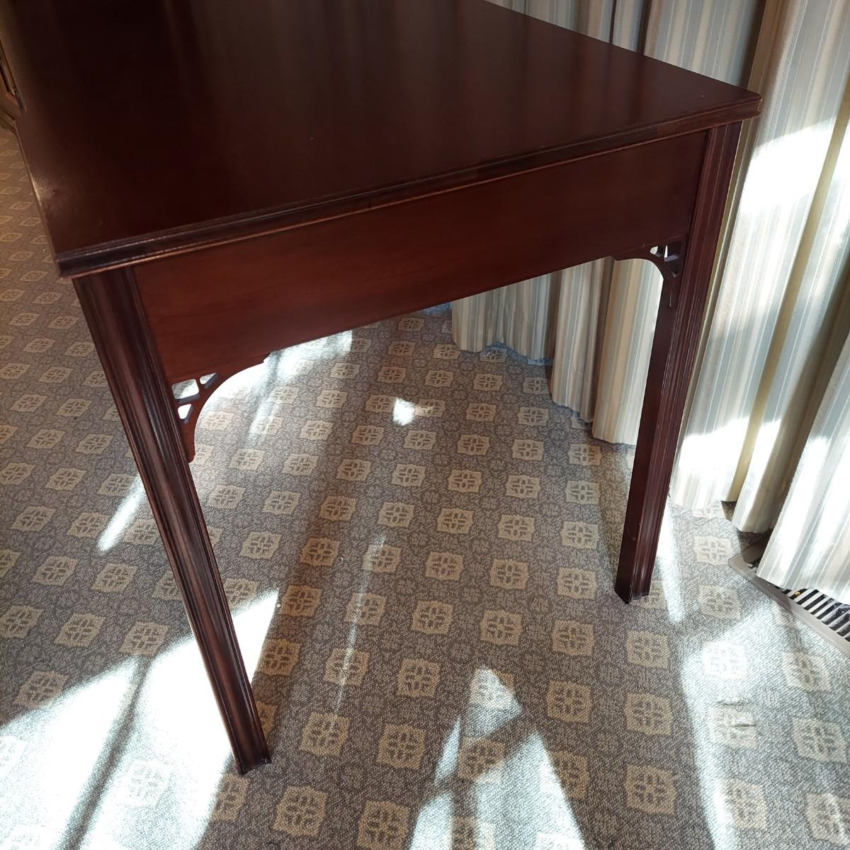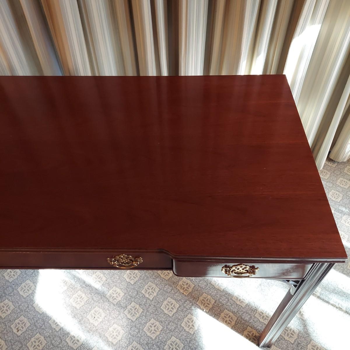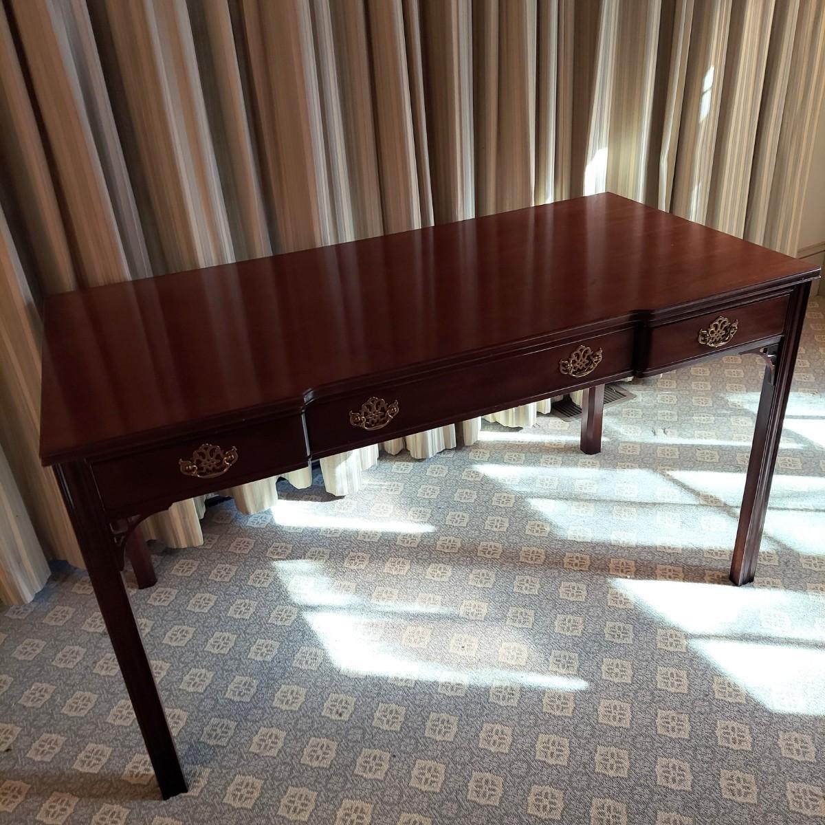 The American Masterpiece Collection by Hickory Furniture solid wood desk in darker finish with brass colored hardware and Chippendale style design elements. There are three dovetailed drawers. Piece measures 54" x 27" x 30"H. Local Pickup Only.