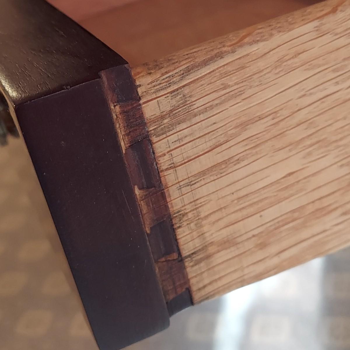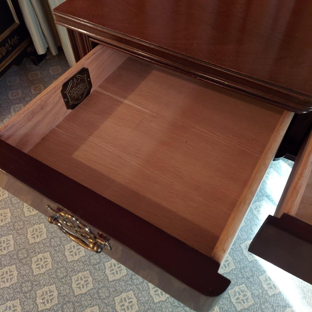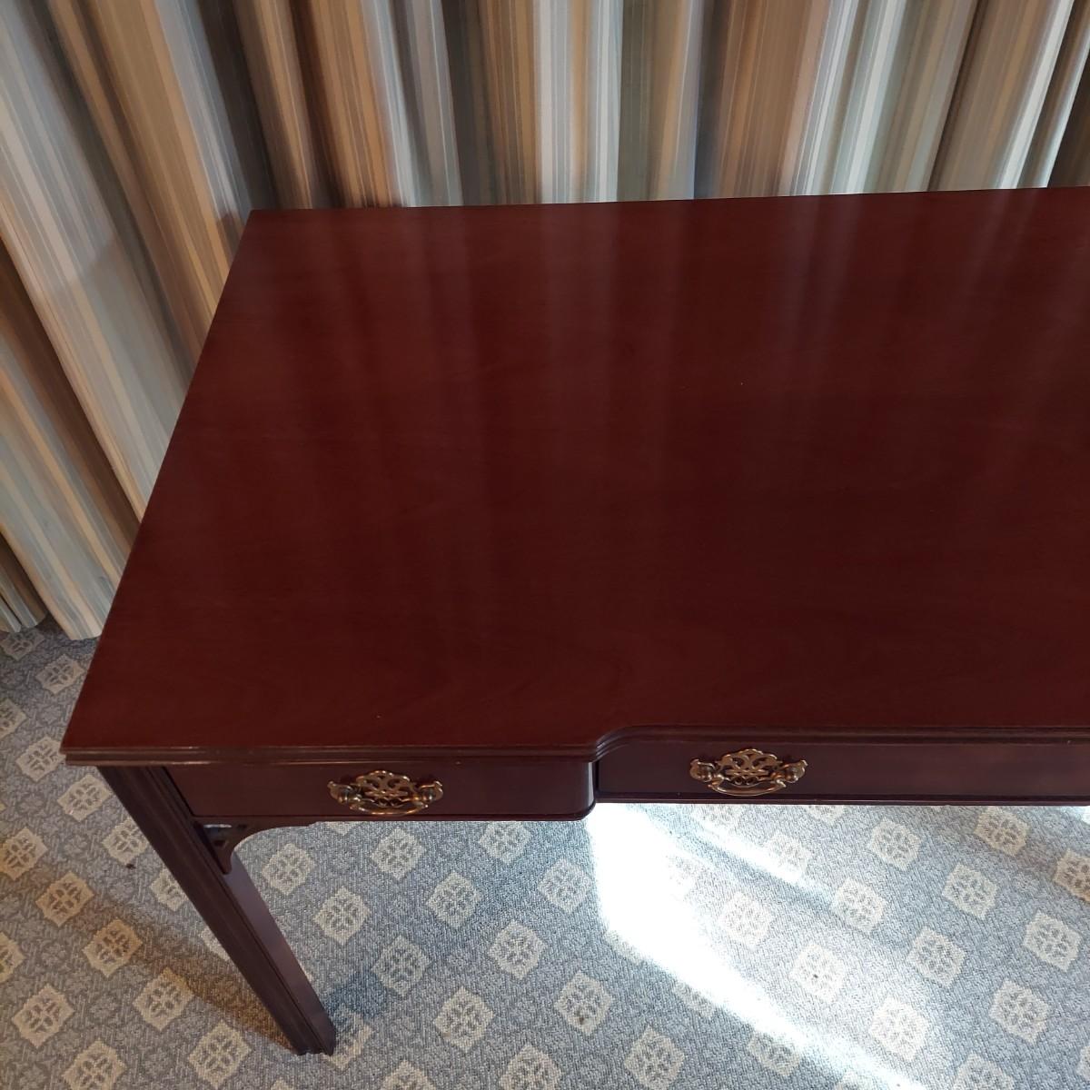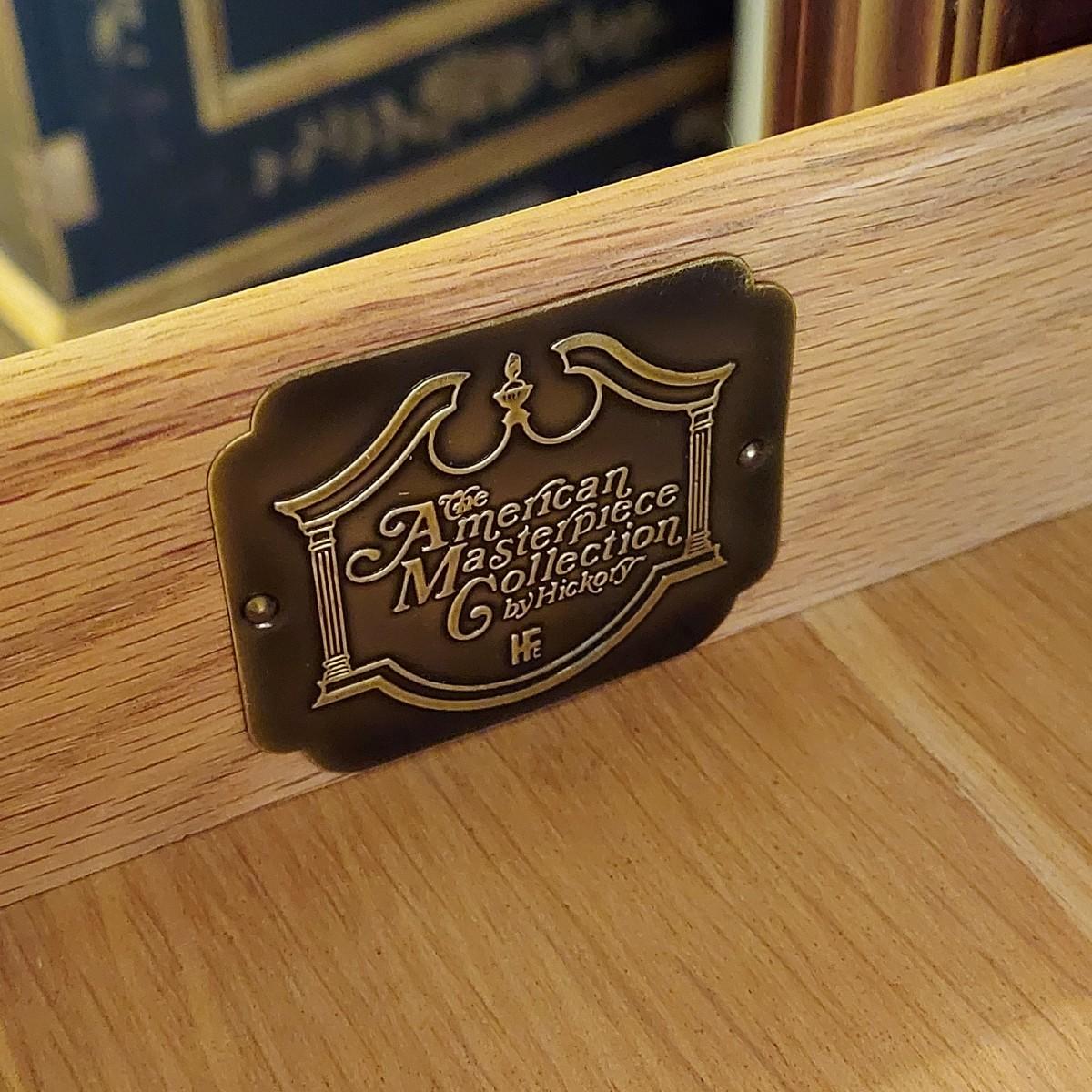 The American Masterpiece Collection by Hickory Furniture solid wood desk in darker finish with brass colored hardware and Chippendale style design elements. There are three dovetailed drawers. Piece measures 54" x 27" x 30"H. Local Pickup Only.
