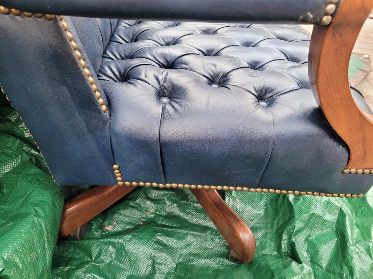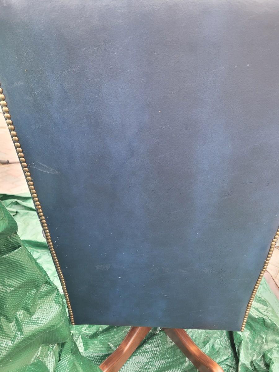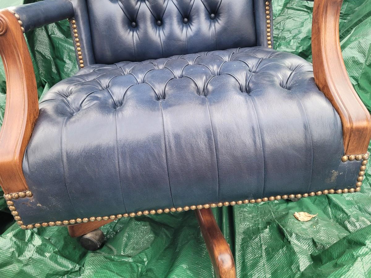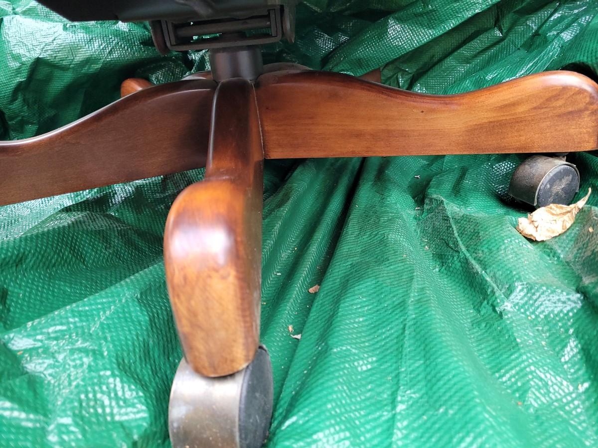See the photos for a complete description there is a little scuff in the leather on the back corner but the wood is in great shape and I don't see any other tears in the leather. There are nicks and blemishes commiserate with the age of the chair but overall it's in very good shape. Adjustable up and down and very comfortable and nice.