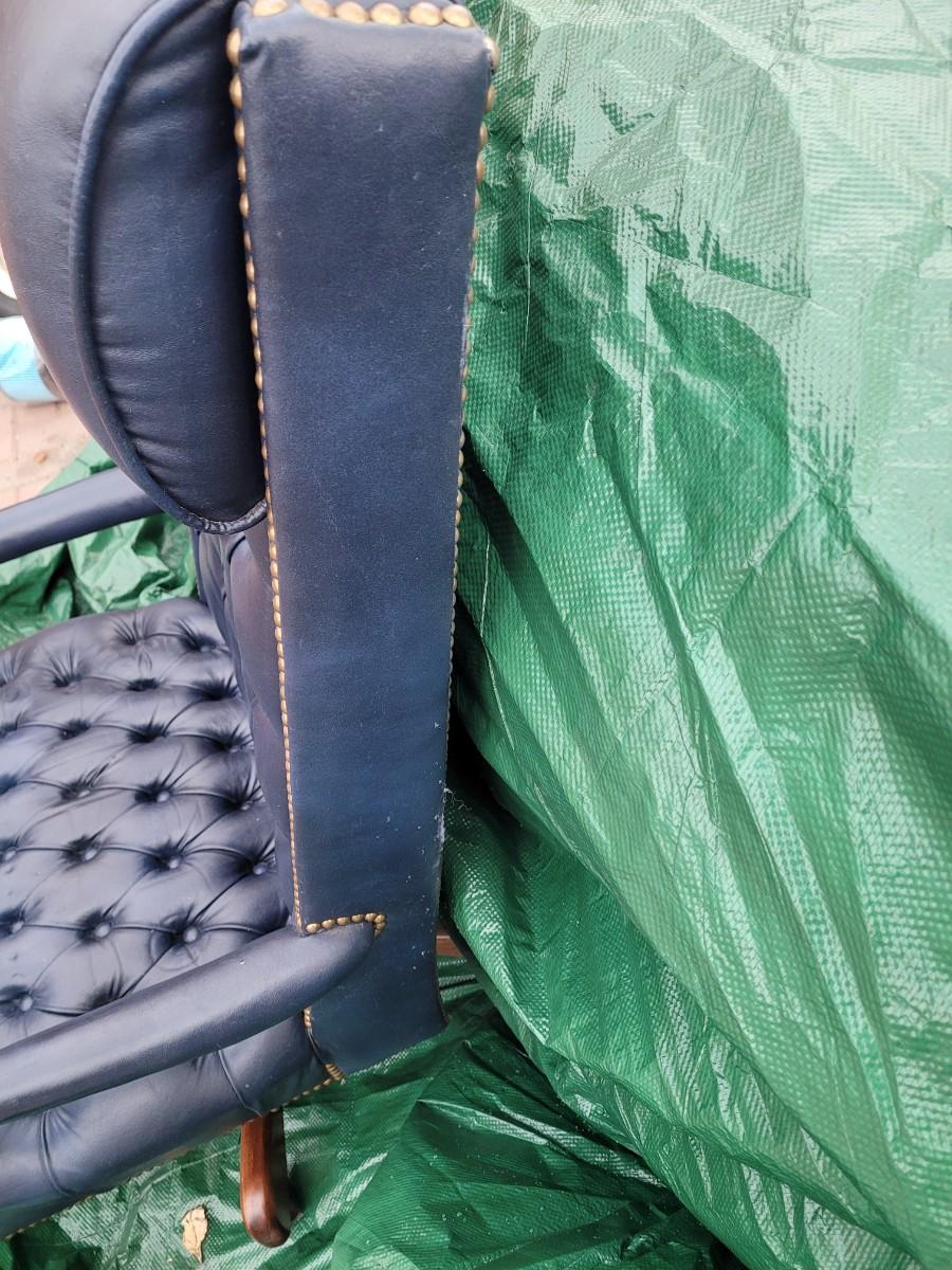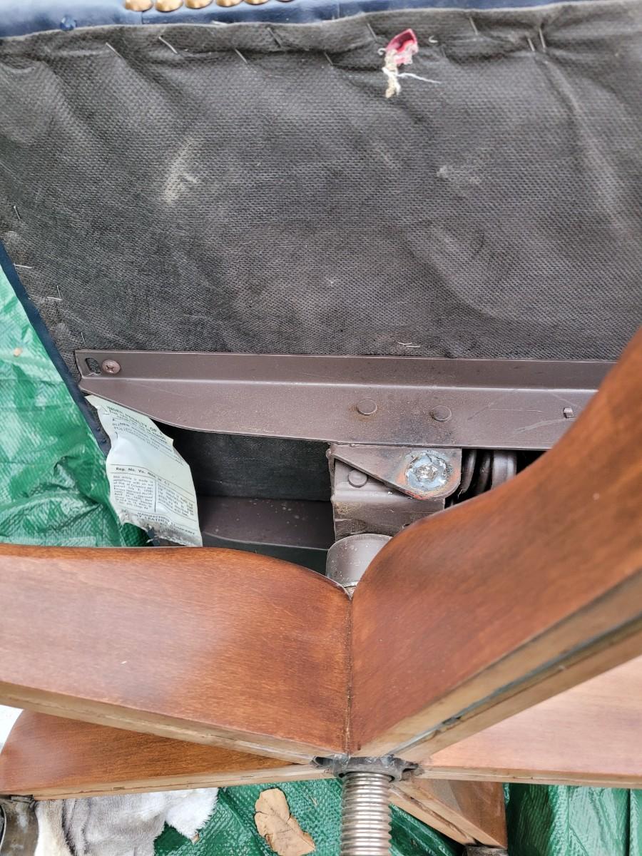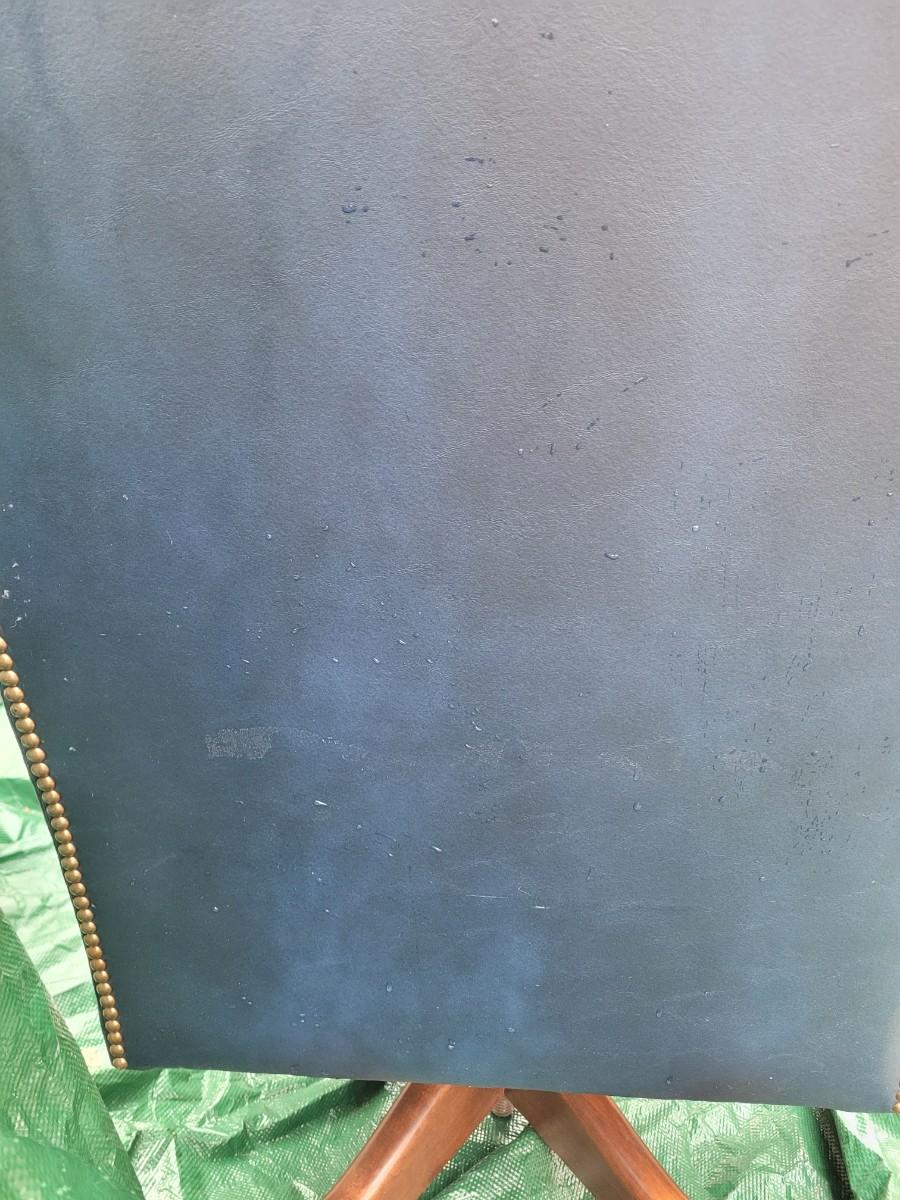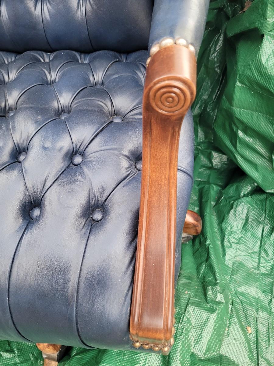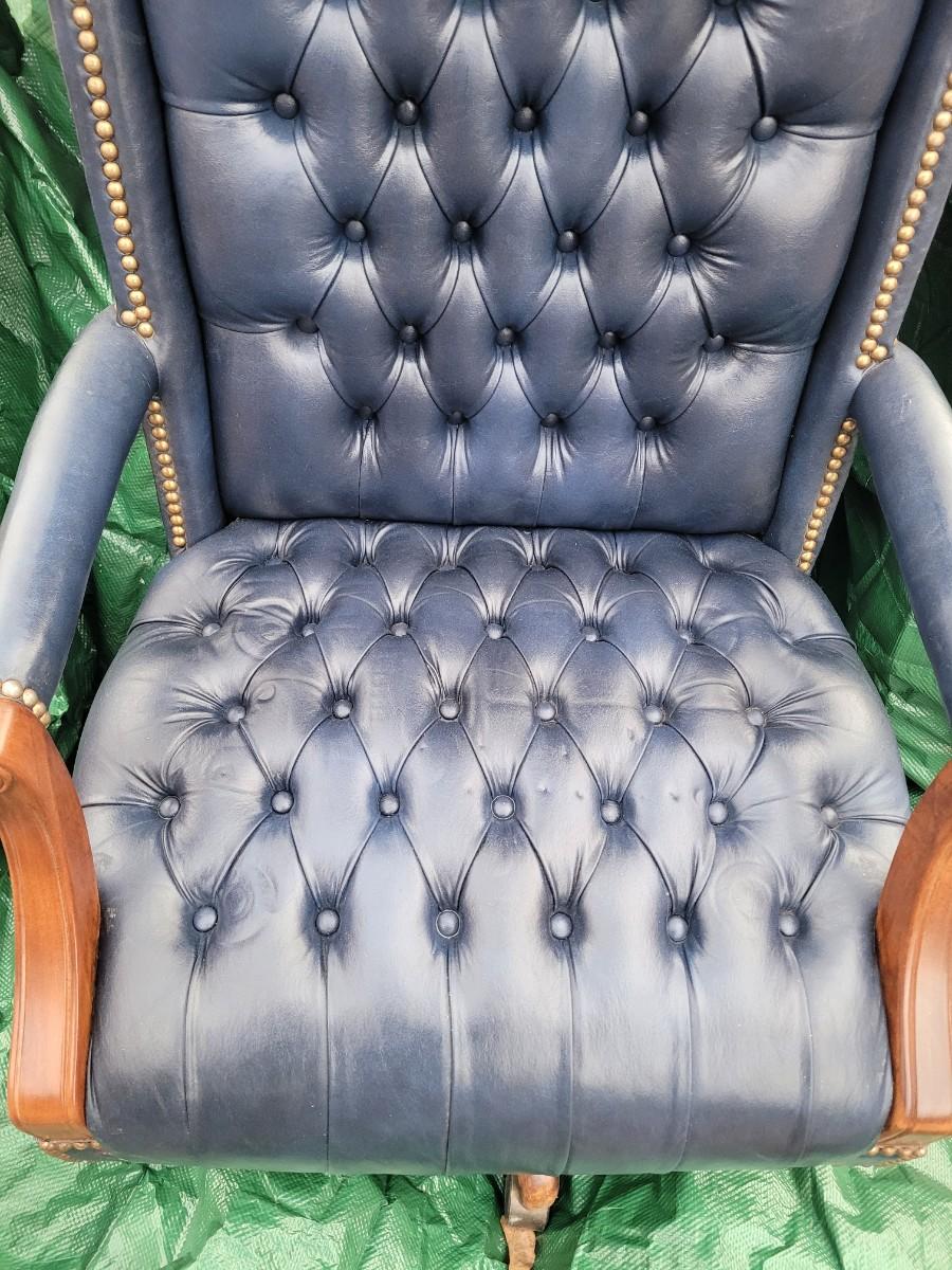 See the photos for a complete description there is a little scuff in the leather on the back corner but the wood is in great shape and I don't see any other tears in the leather. There are nicks and blemishes commiserate with the age of the chair but overall it's in very good shape. Adjustable up and down and very comfortable and nice.