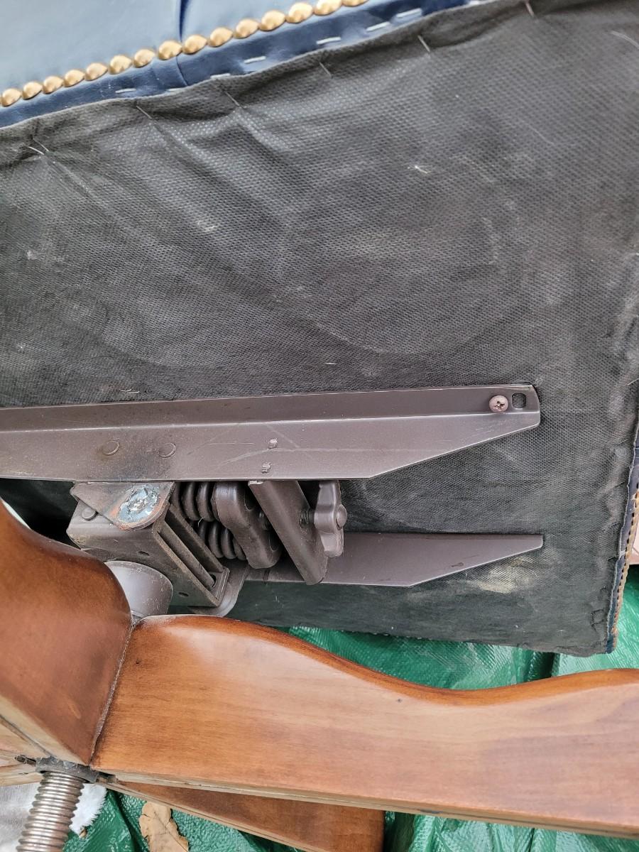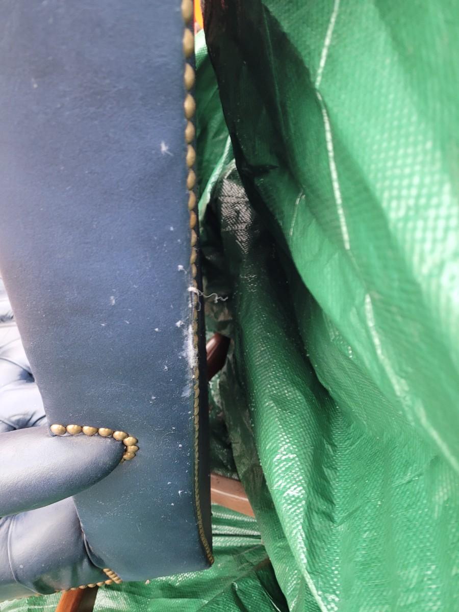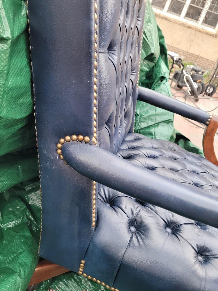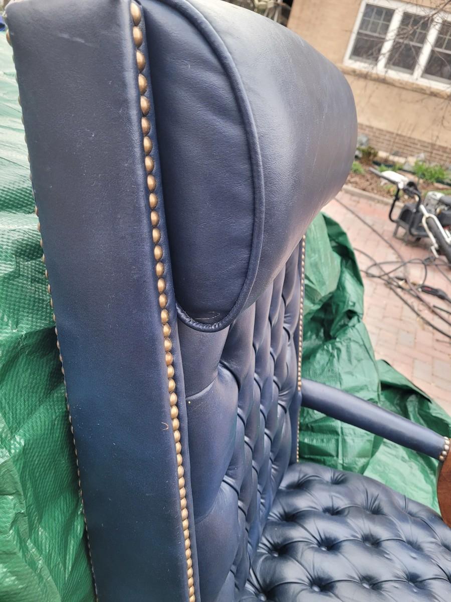 See the photos for a complete description there is a little scuff in the leather on the back corner but the wood is in great shape and I don't see any other tears in the leather. There are nicks and blemishes commiserate with the age of the chair but overall it's in very good shape. Adjustable up and down and very comfortable and nice.