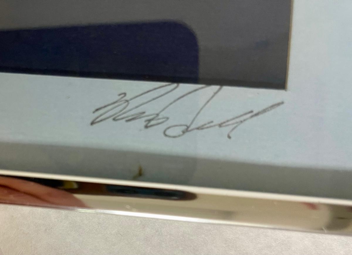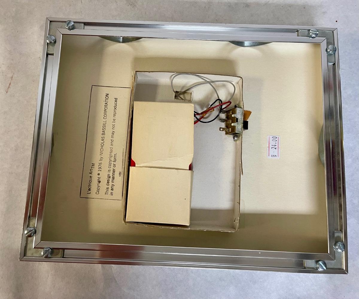 Matted and under glass. Uses 2 45v batteries (see photos). Untested, but appears undamaged and intact. nSigned by the artist but unable to decipher the name.