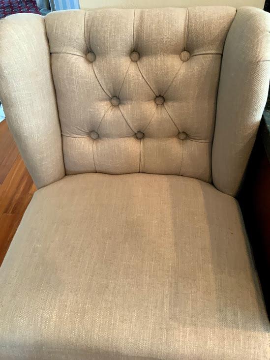 Beige with brown wooden legs. Burr on back tufted wing back chair