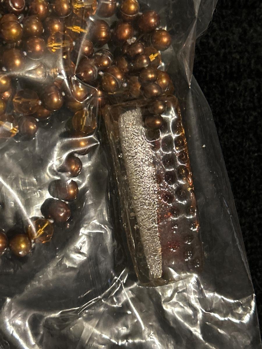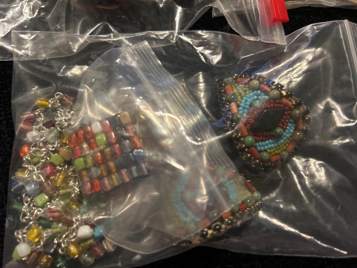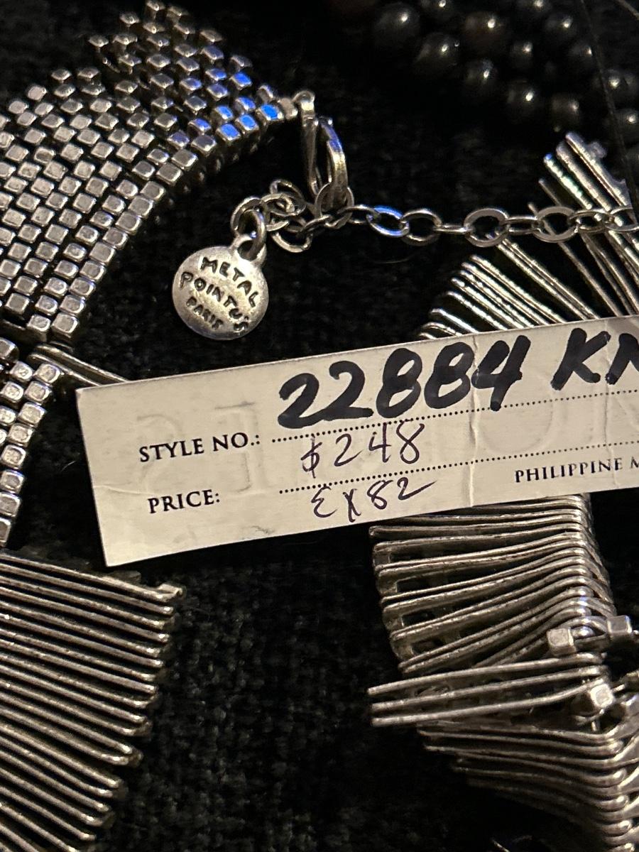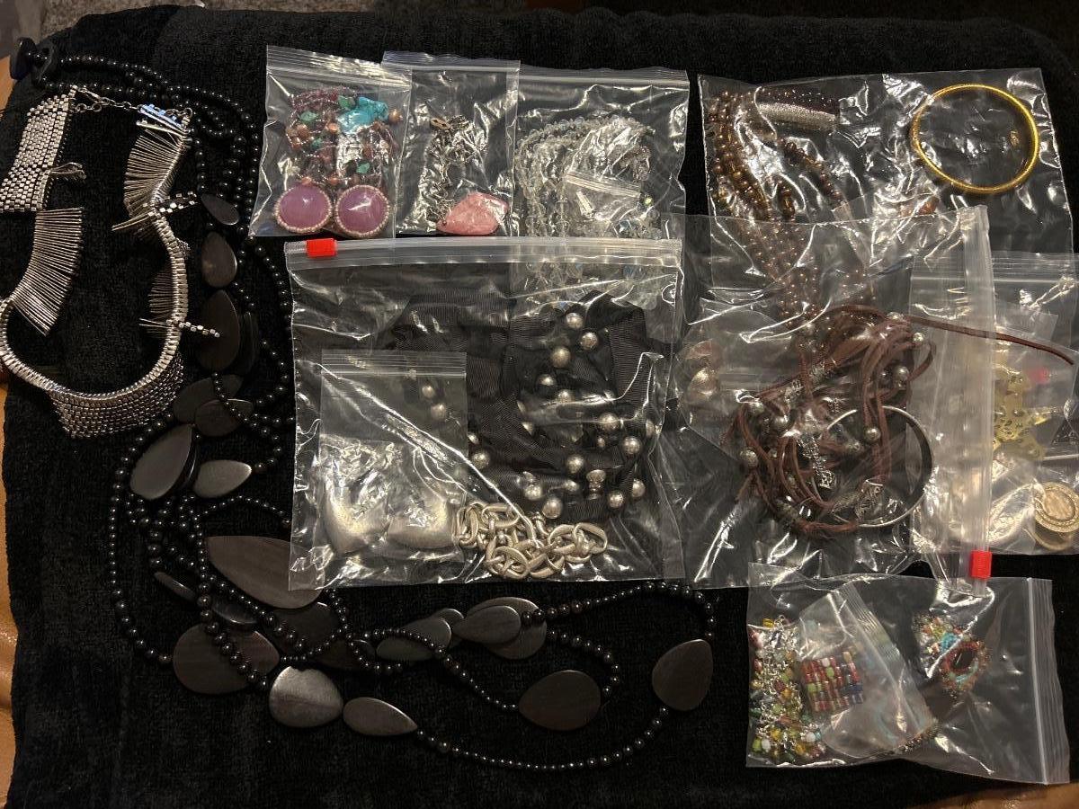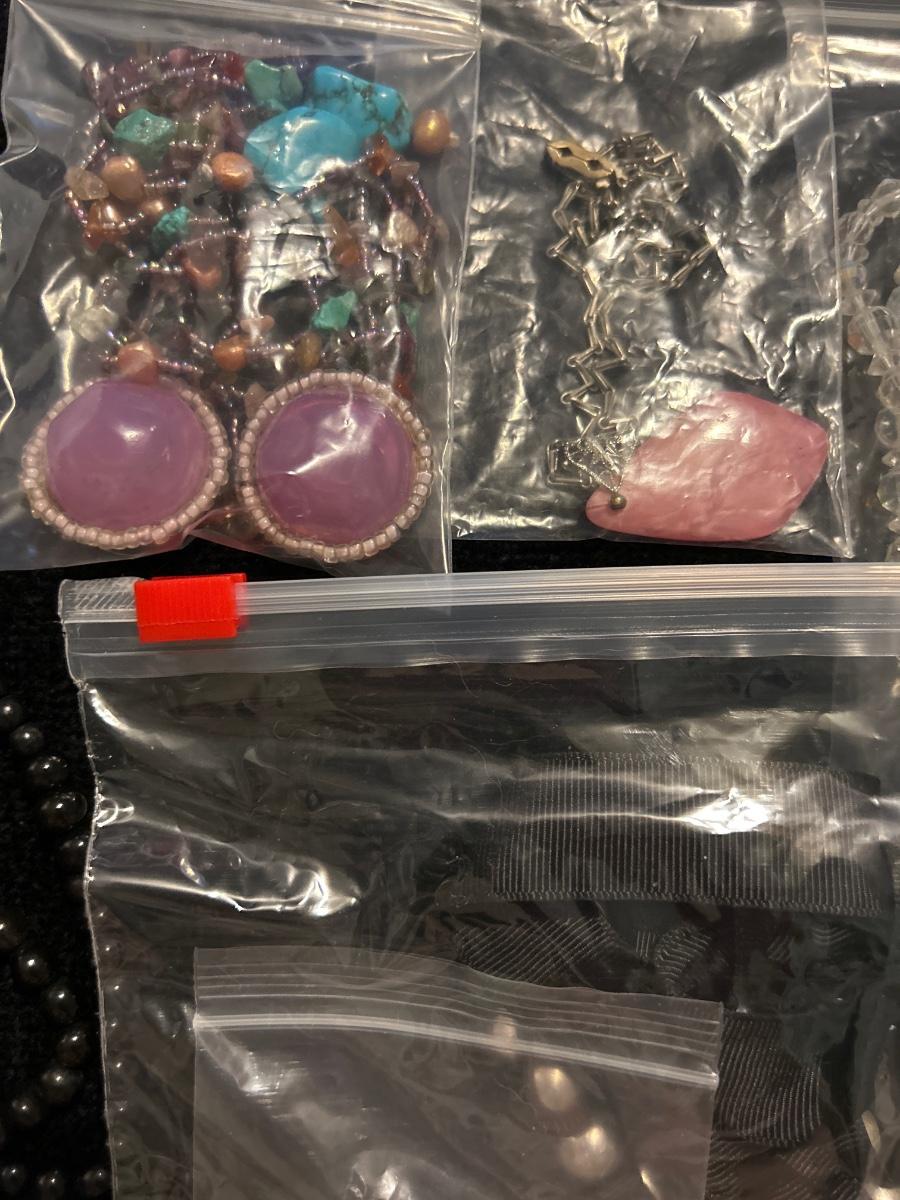 The purple earrings in the top left are stamped, made in western Germany, the really long wood looking necklace has a tag on it of $248. There is a pair of sterling silver earrings in here as well! Nobody else is going to have at least three of these pieces! Brown leather necklace has a tag that says made in India.