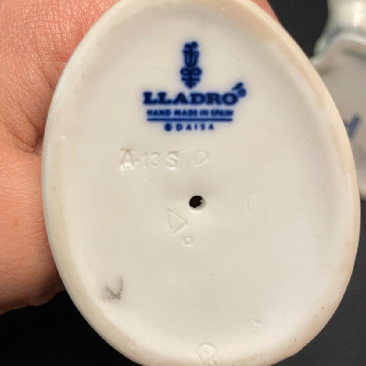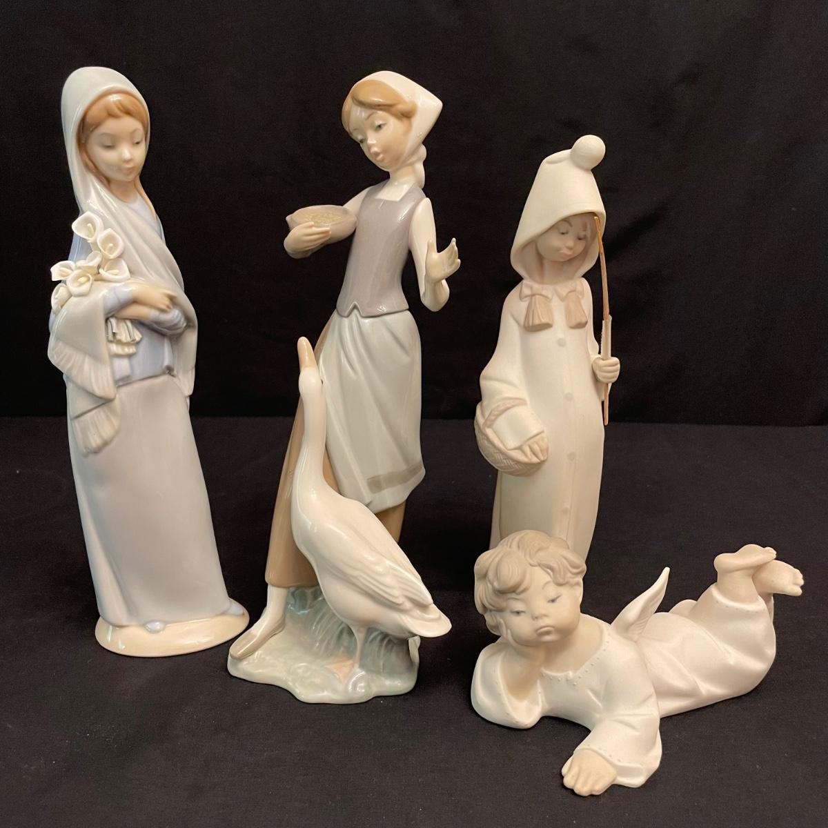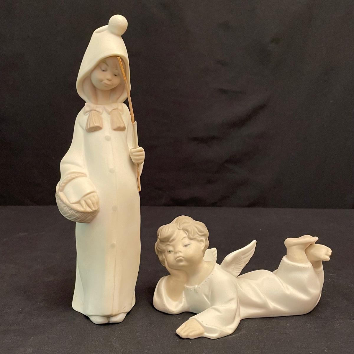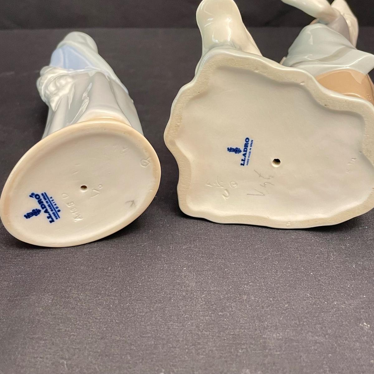 Two taller high gloss Lladro figurines, both are about 9.25” tall with many intricate details. Upon very close inspection, one of the flowers appears to be chipped. The smaller two figures have just as many details featured in their matte finish. The stick the matte standing figure is holding has some tape on it, it appears to be there to hold the stick in place. All four are stamped Lladro with other etchings on the bottom surface. See images. Shipping available.