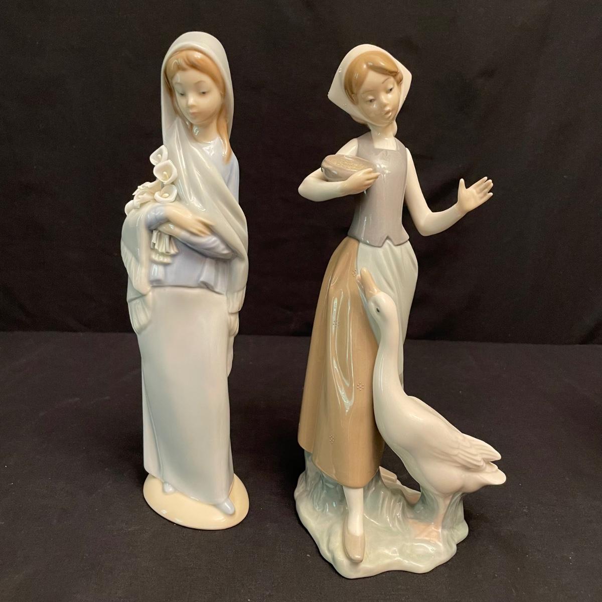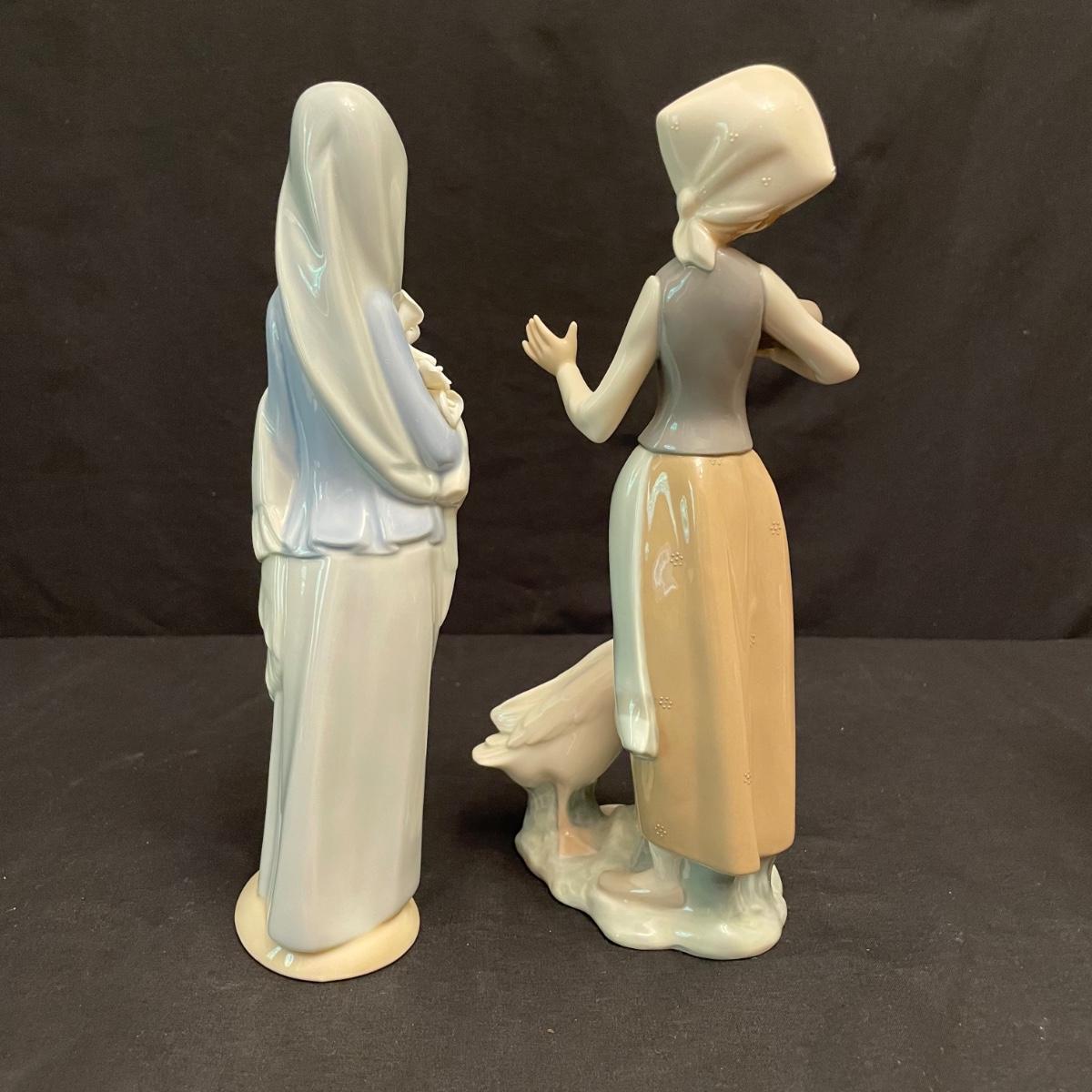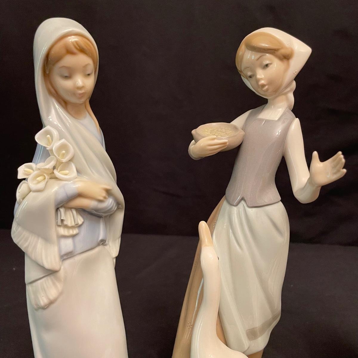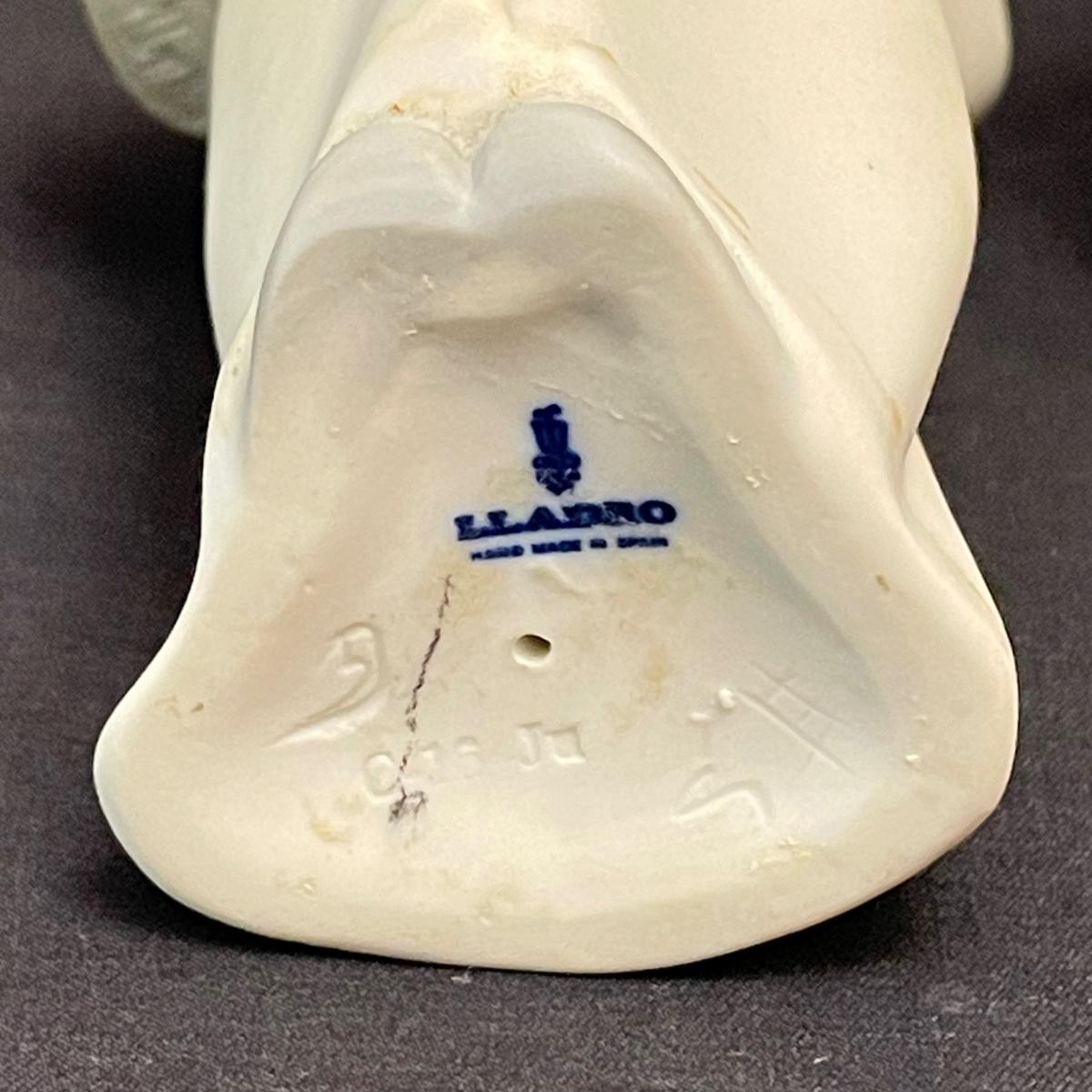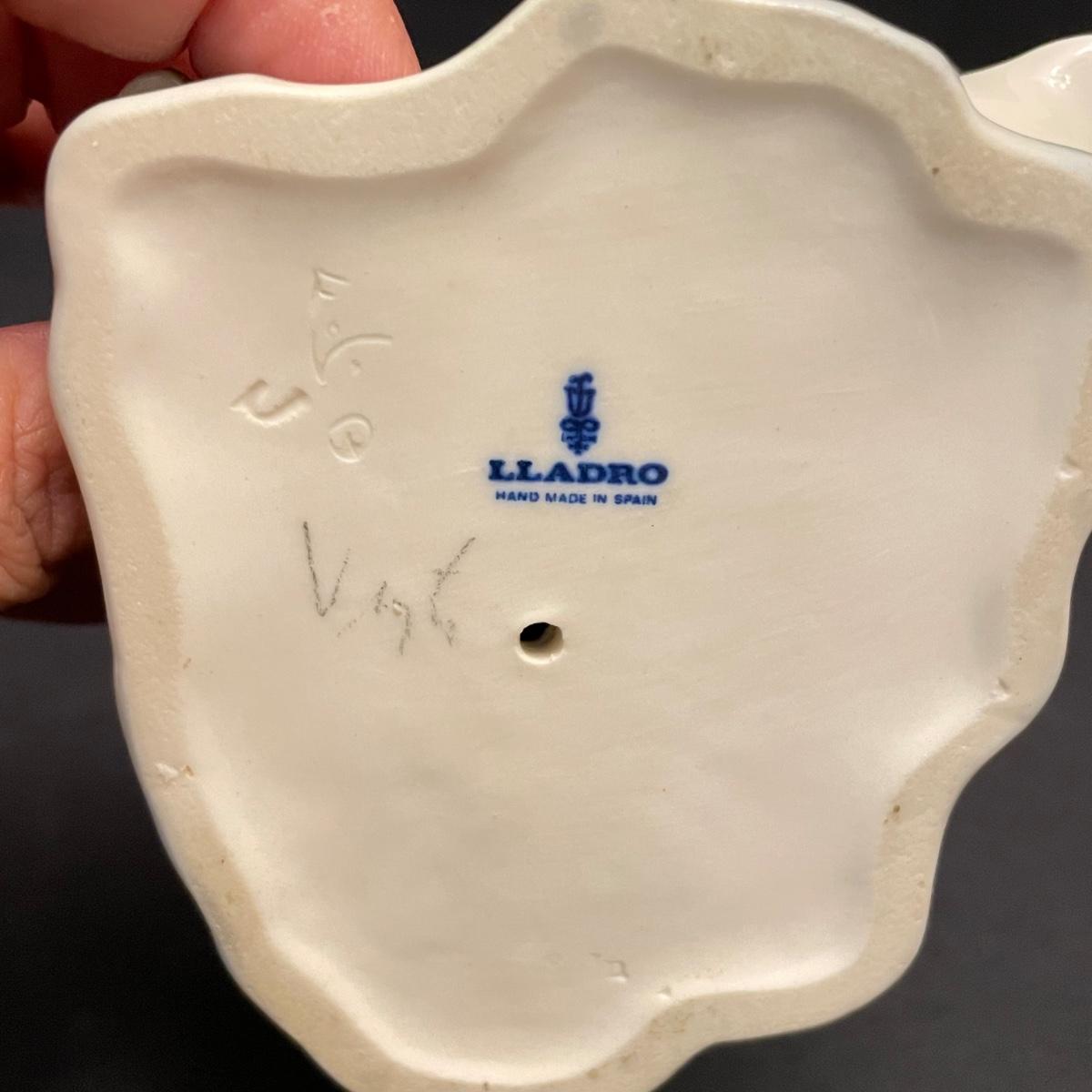Two taller high gloss Lladro figurines, both are about 9.25” tall with many intricate details. Upon very close inspection, one of the flowers appears to be chipped. The smaller two figures have just as many details featured in their matte finish. The stick the matte standing figure is holding has some tape on it, it appears to be there to hold the stick in place. All four are stamped Lladro with other etchings on the bottom surface. See images. Shipping available.
