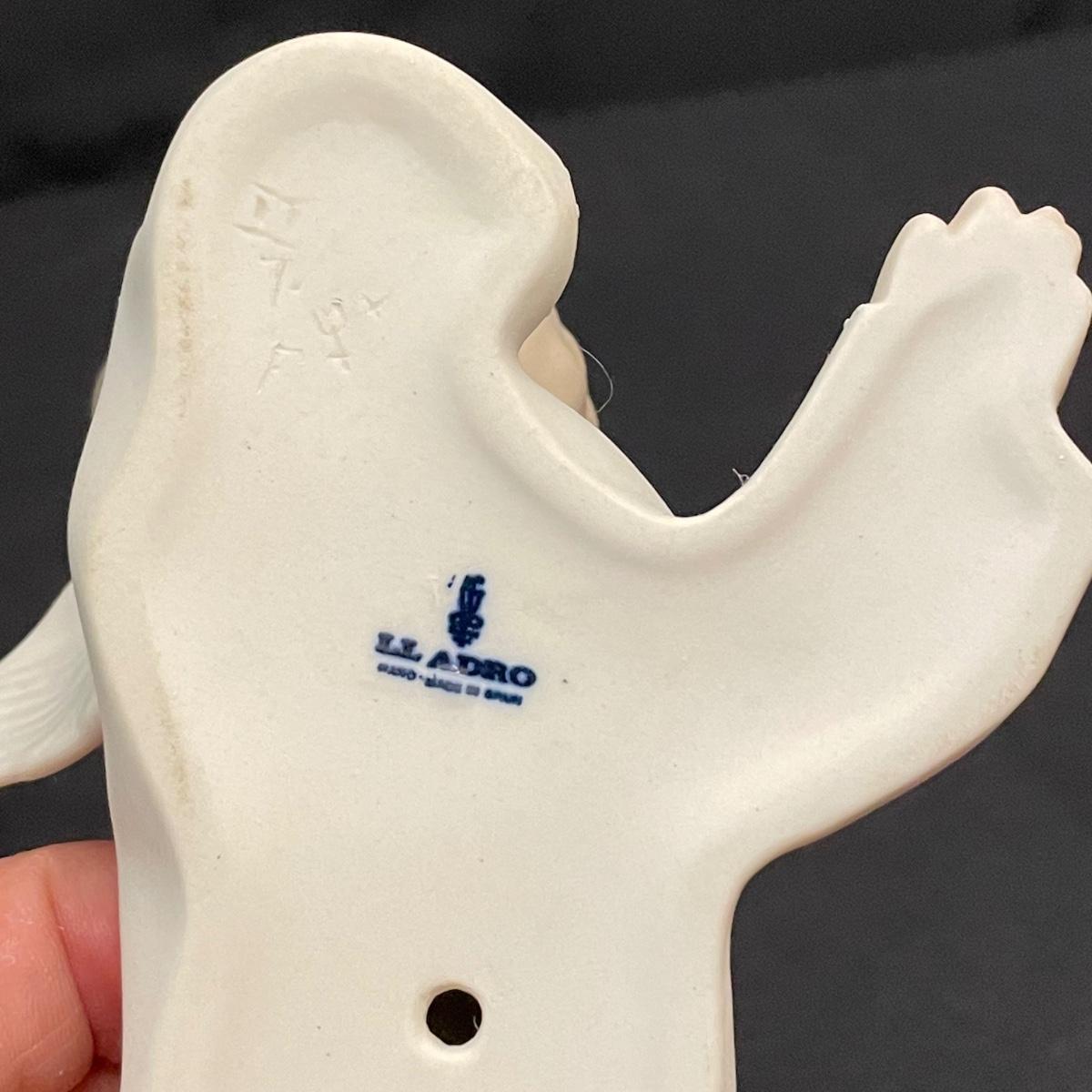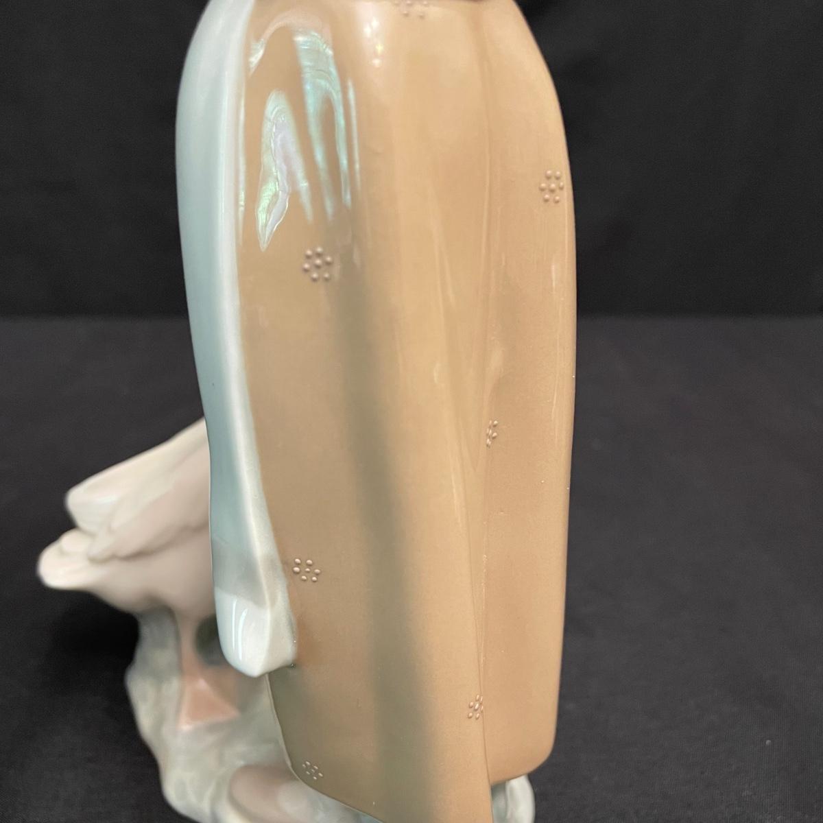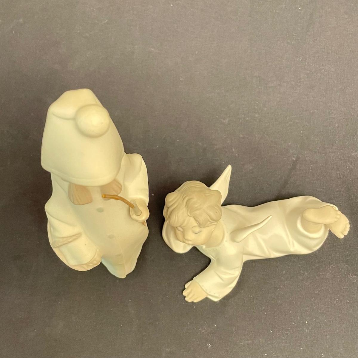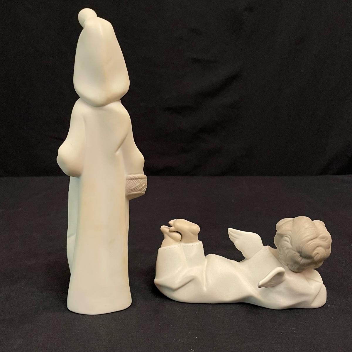 Two taller high gloss Lladro figurines, both are about 9.25” tall with many intricate details. Upon very close inspection, one of the flowers appears to be chipped. The smaller two figures have just as many details featured in their matte finish. The stick the matte standing figure is holding has some tape on it, it appears to be there to hold the stick in place. All four are stamped Lladro with other etchings on the bottom surface. See images. Shipping available.