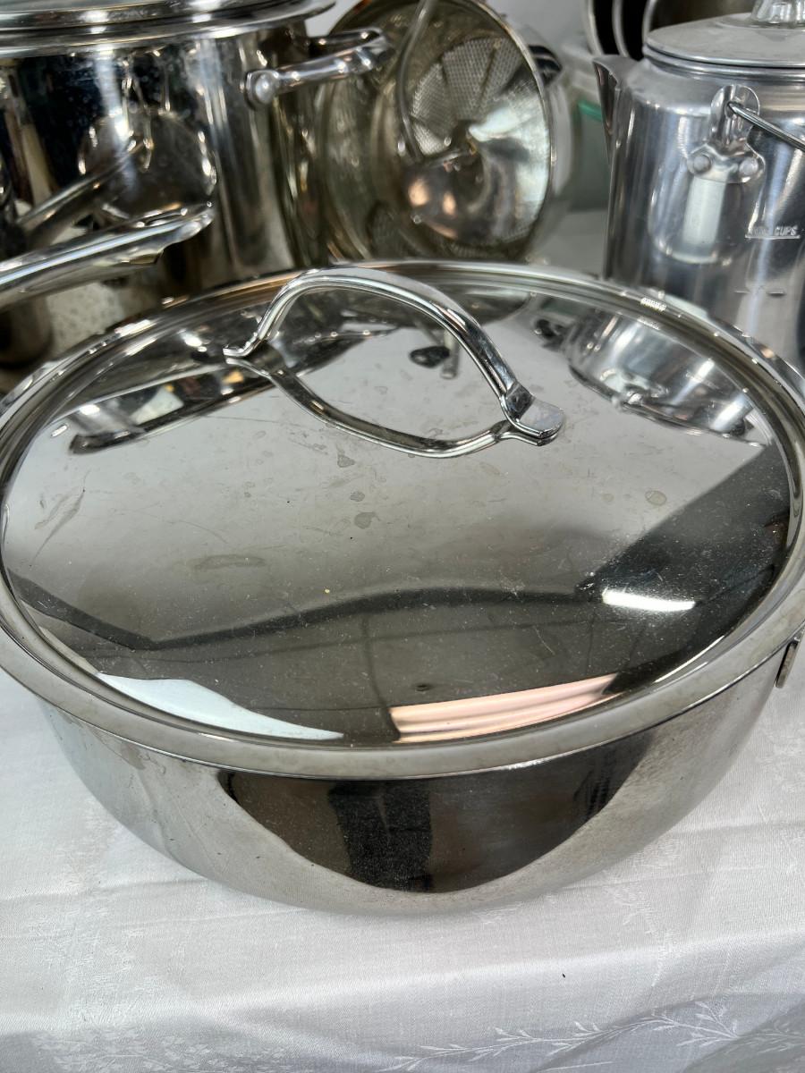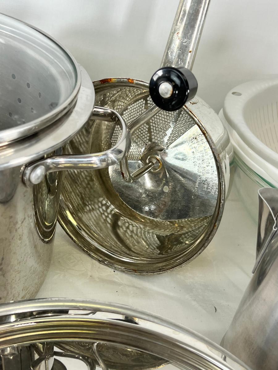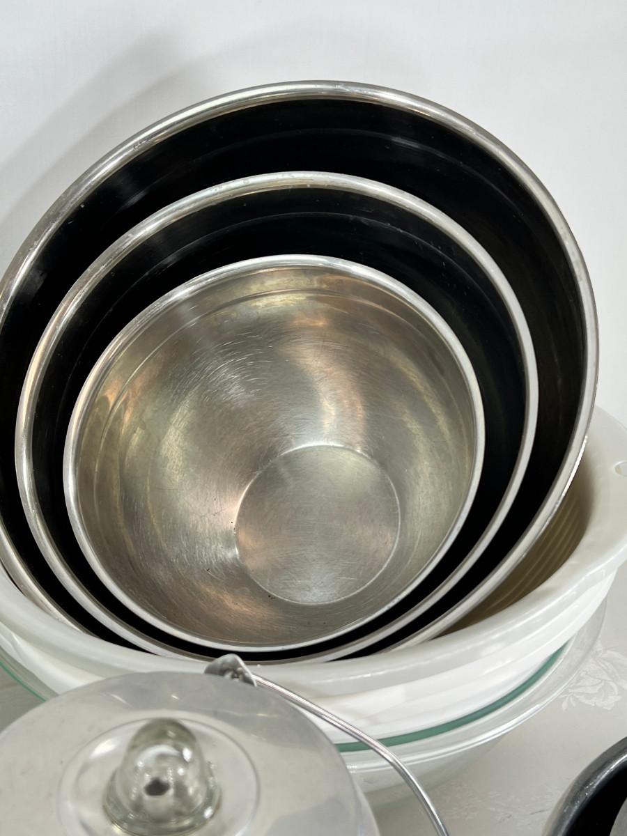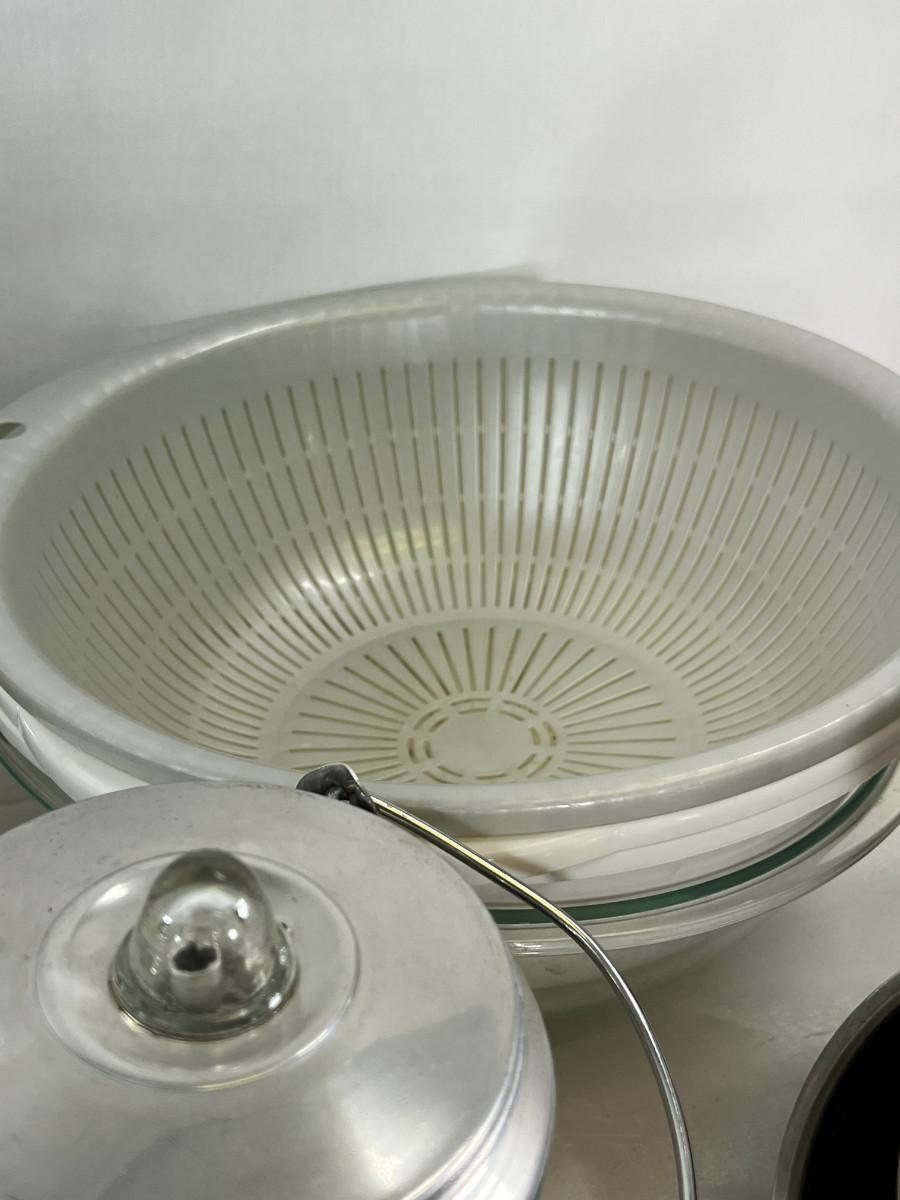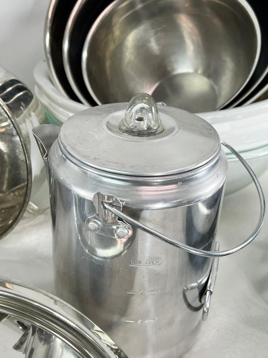 Stainless bowls, Circulan pans pots steamer, camp coffee pot, Pyrex bowl