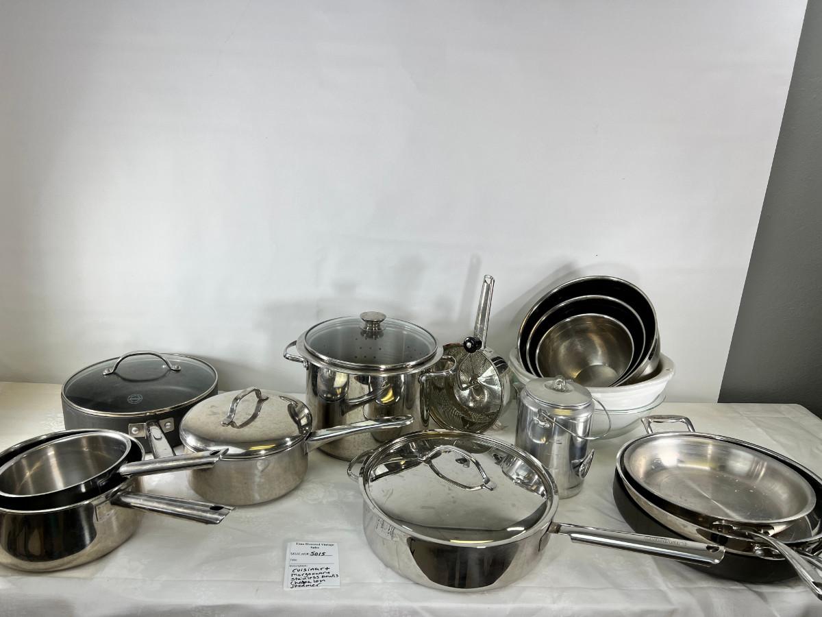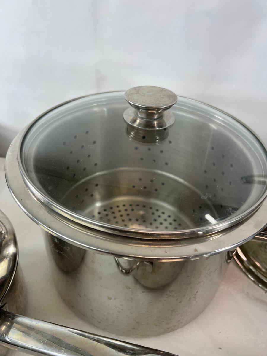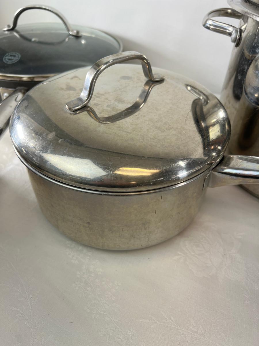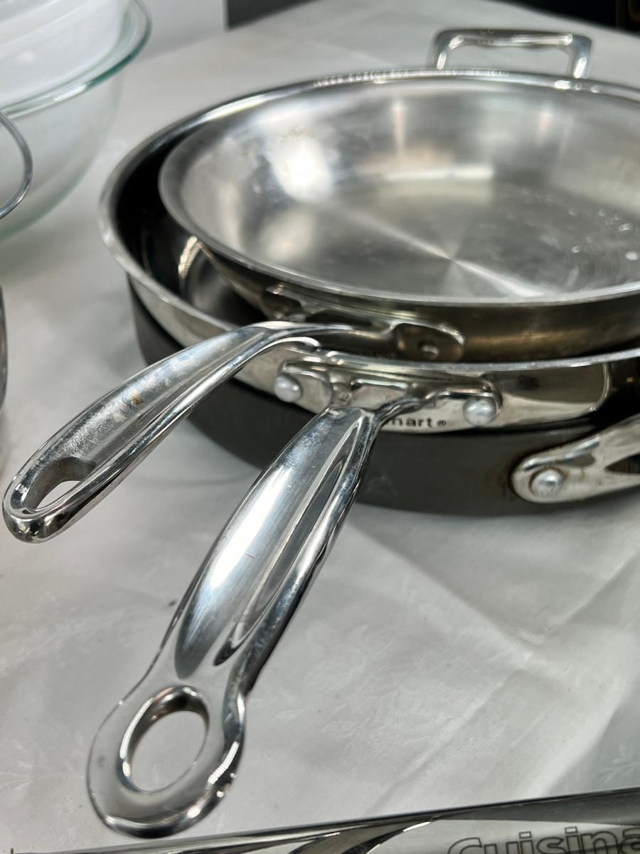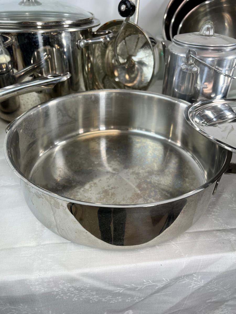 Stainless bowls, Circulan pans pots steamer, camp coffee pot, Pyrex bowl