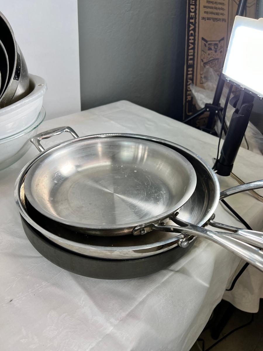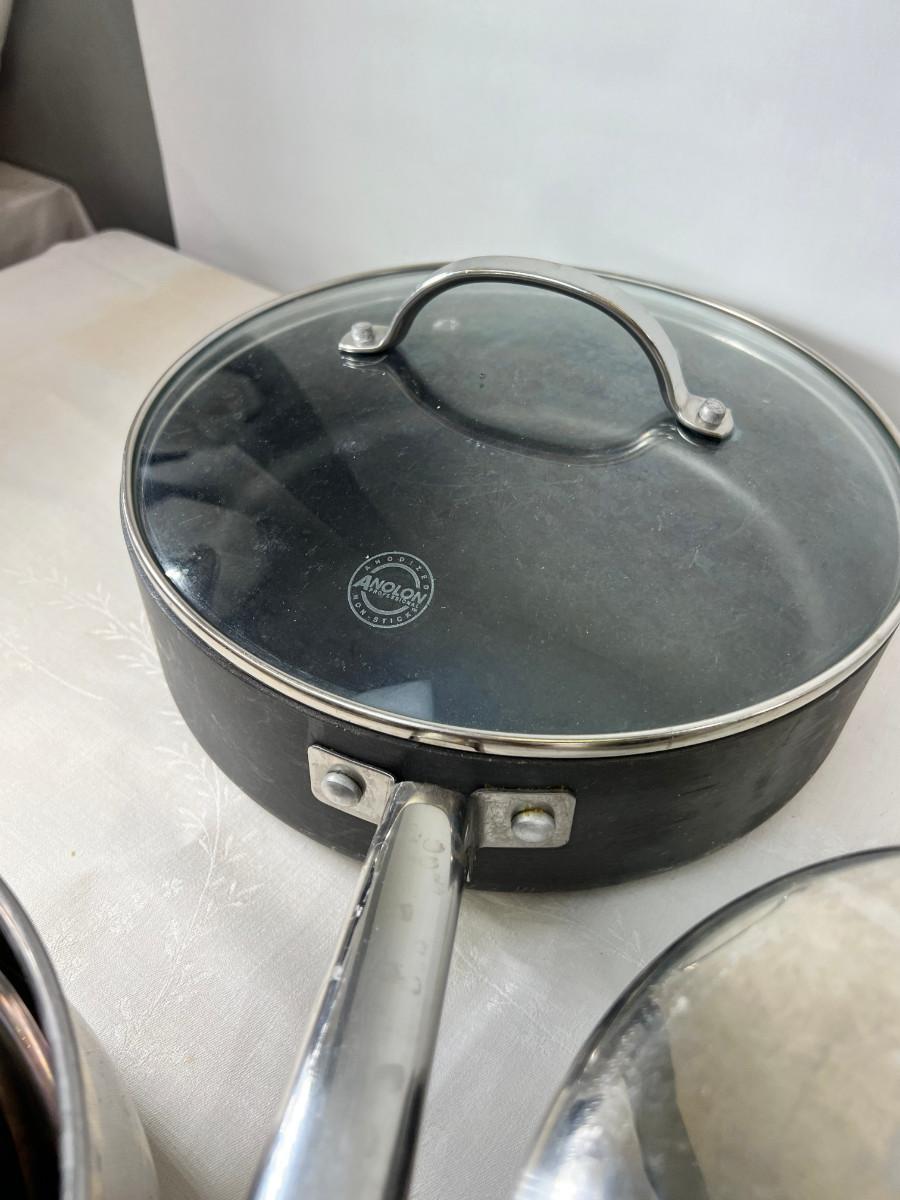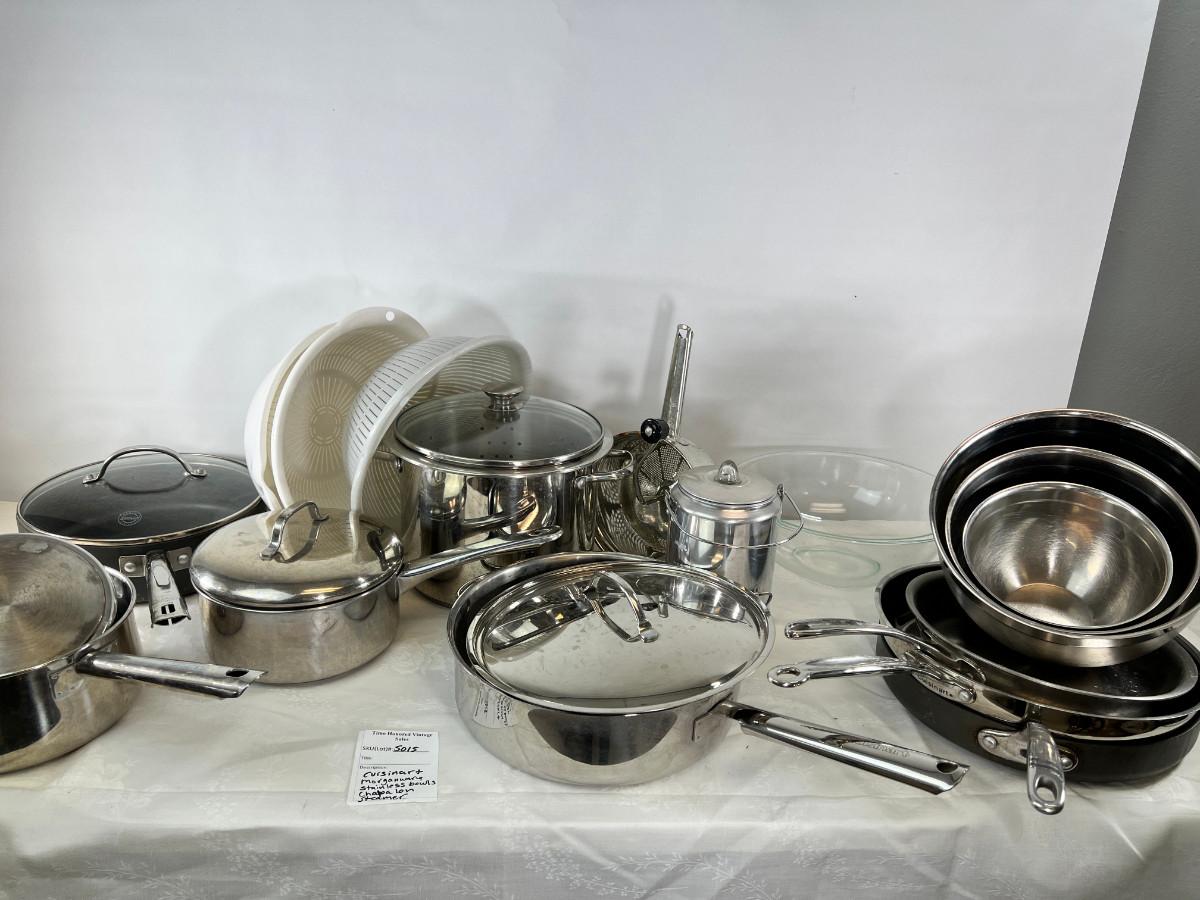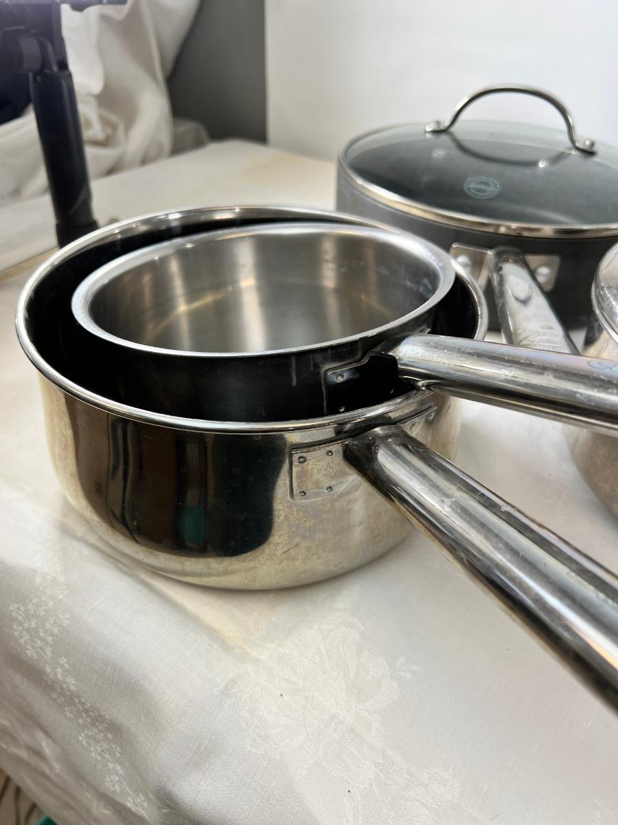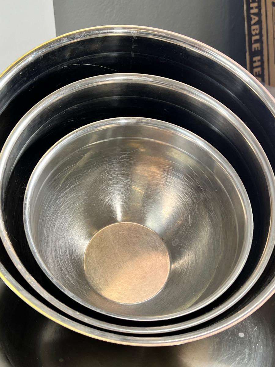Stainless bowls, Circulan pans pots steamer, camp coffee pot, Pyrex bowl