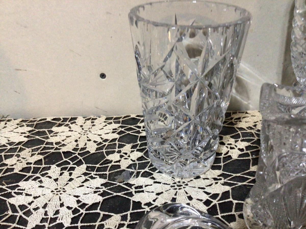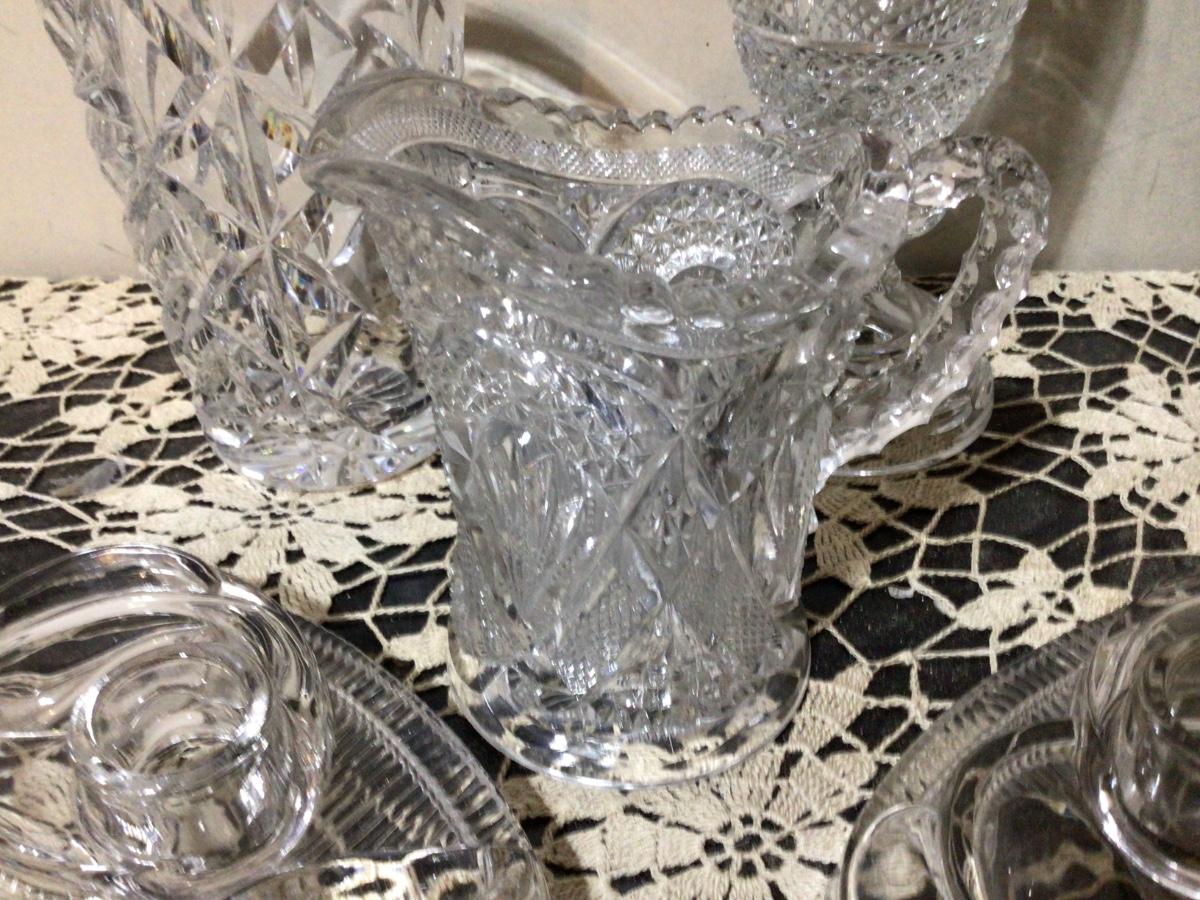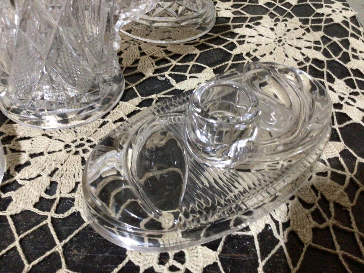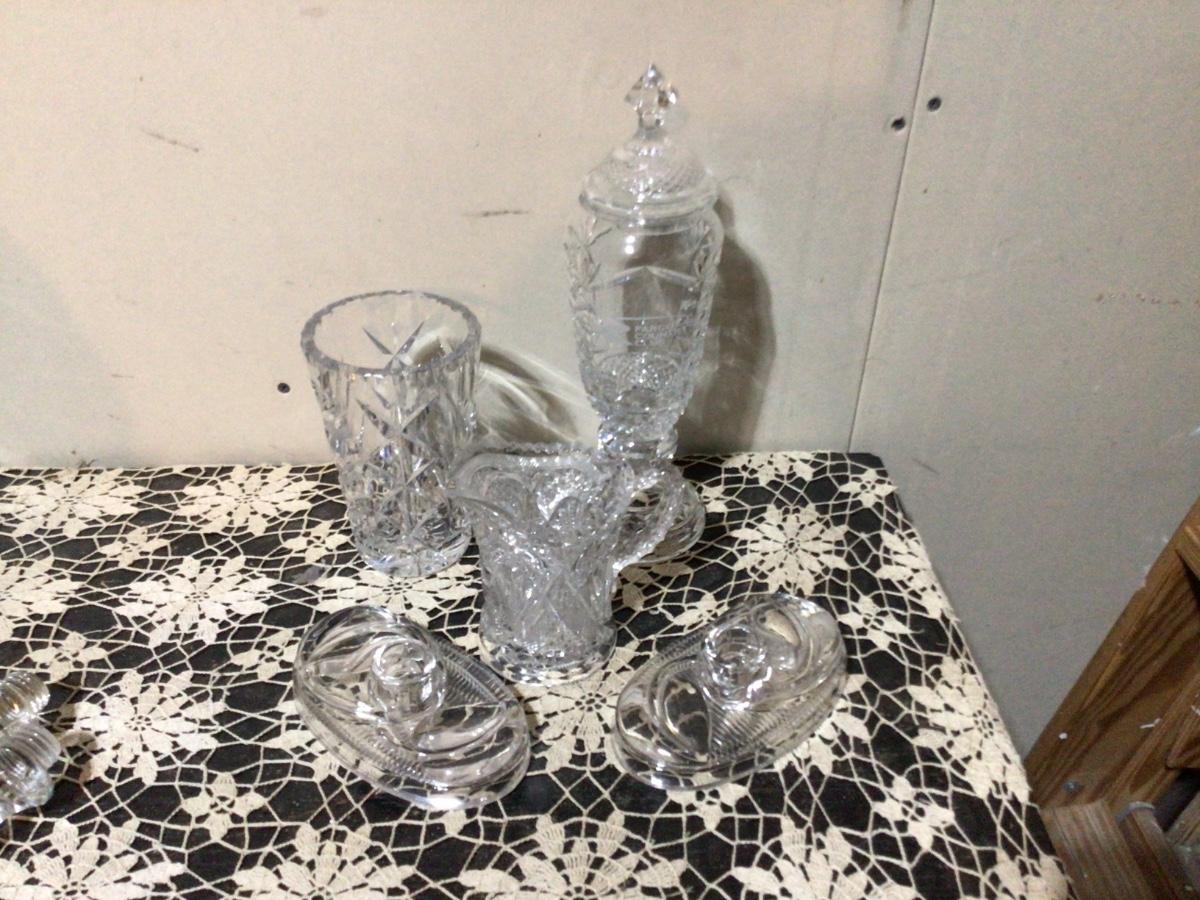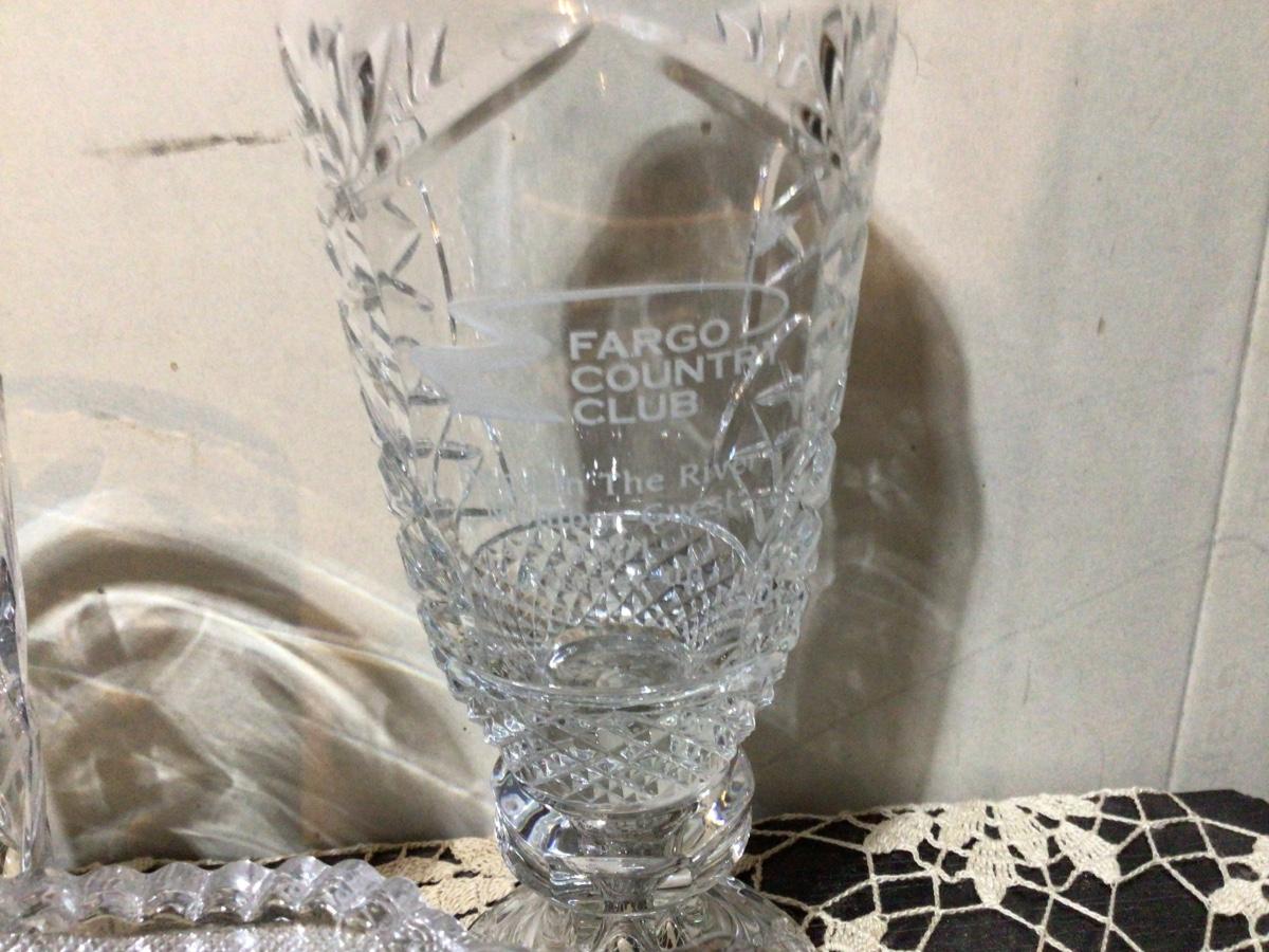 You get high quality cut crystal vase, cut glass pitcher,two very nice clear oval candle holders and a crystal trophy from Fargo Country Club runner up.