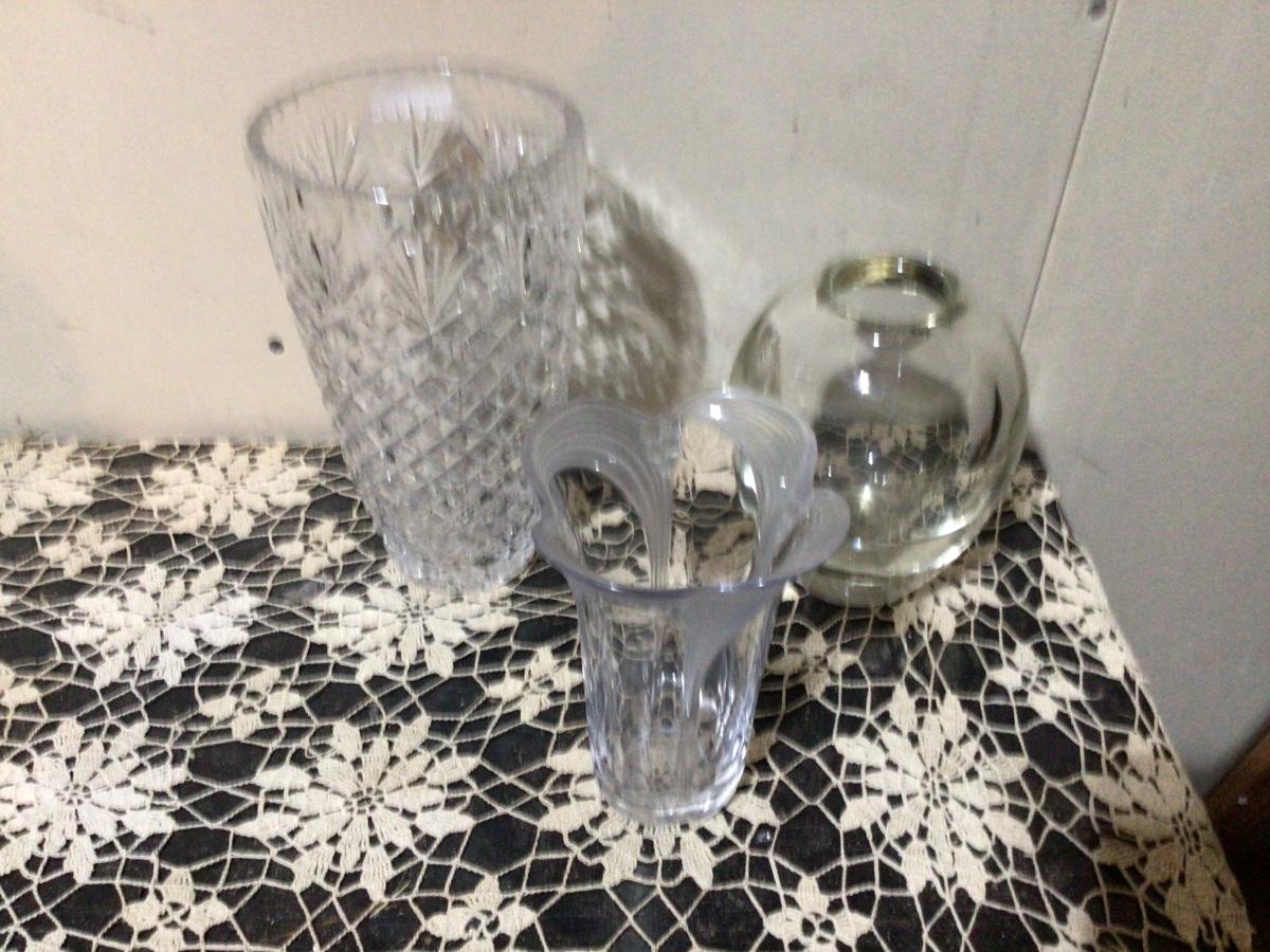 You get three heavy high quality clear glass vases. You get clear, Art Nuevo, and Pineapple. In great condition.